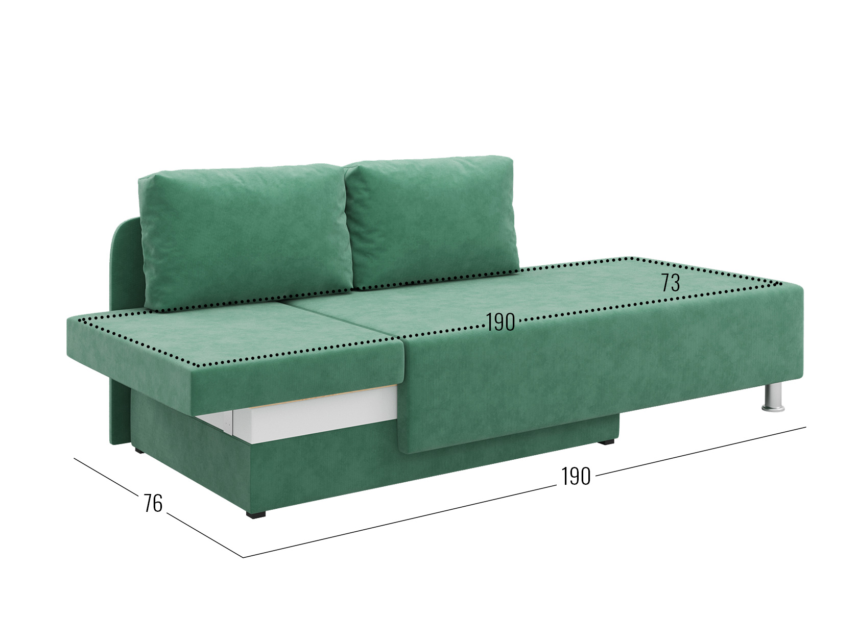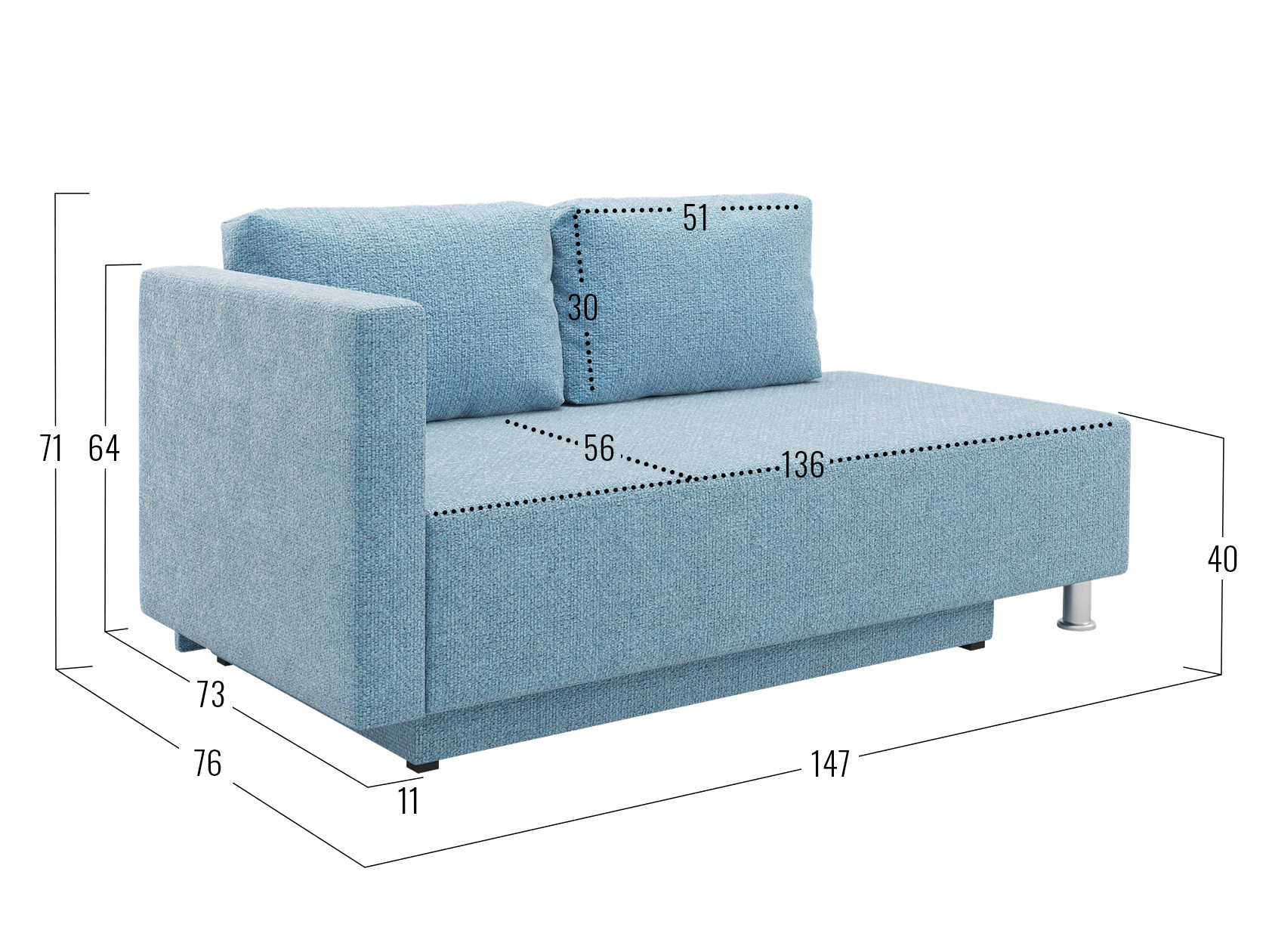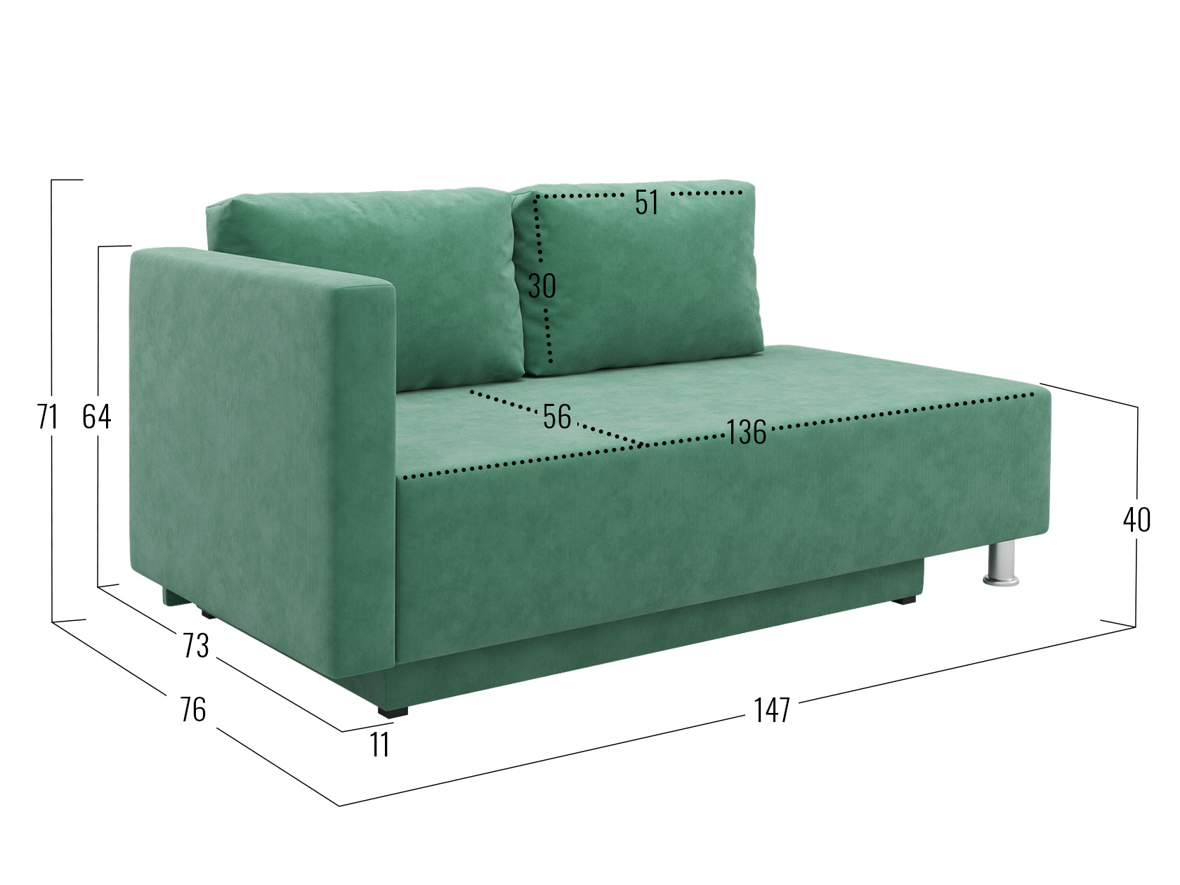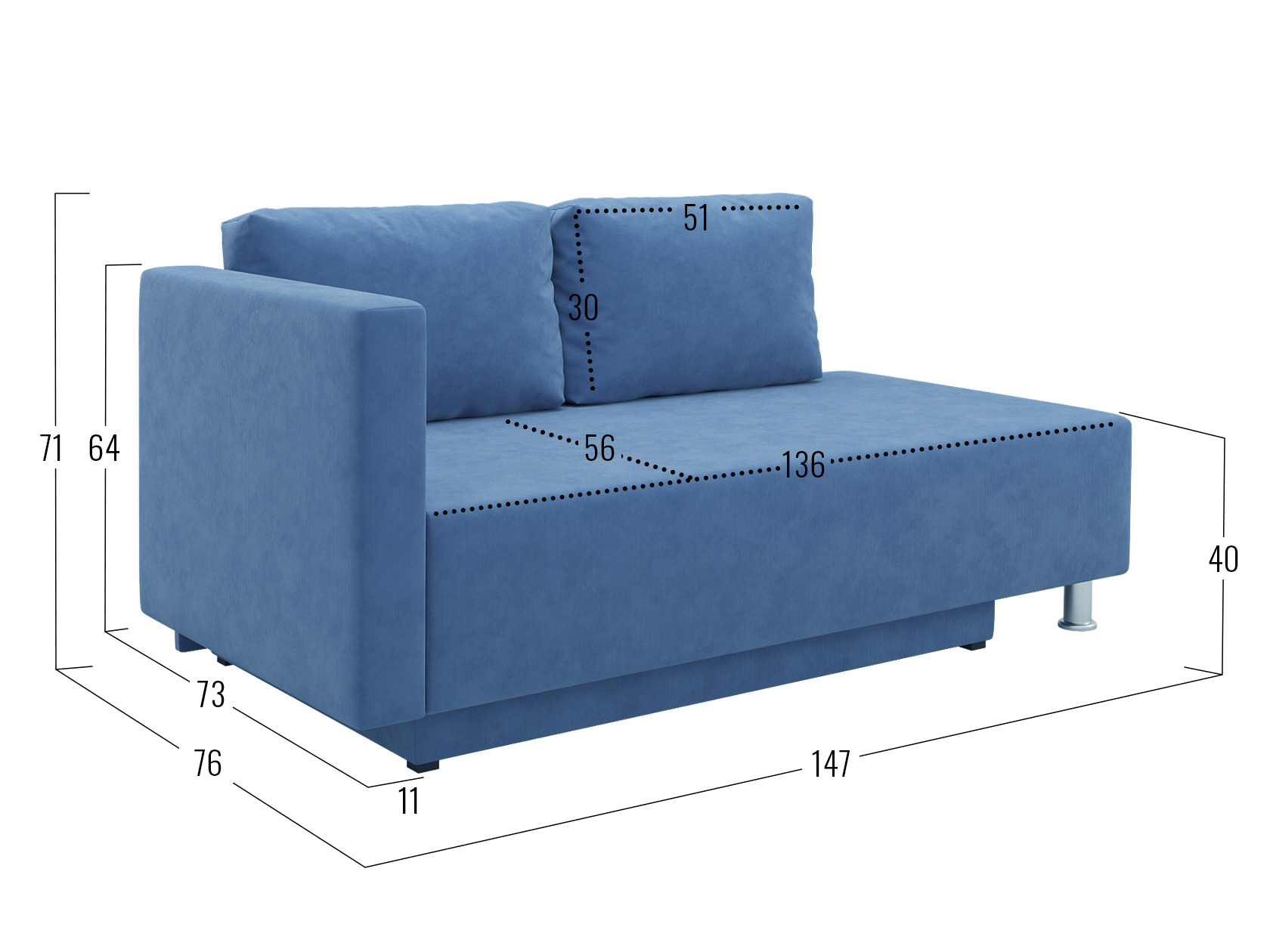 Посадочное место без подушек (ВхГ): 136 х 73 см.