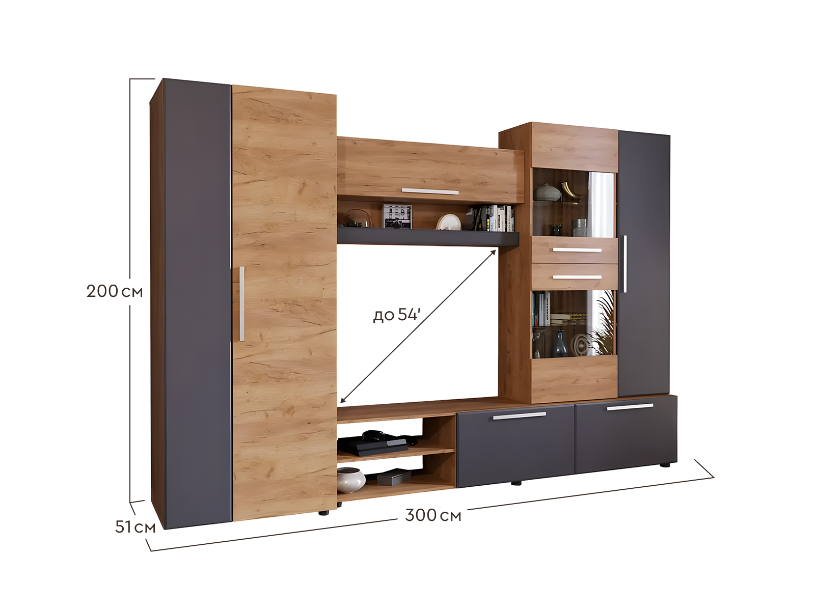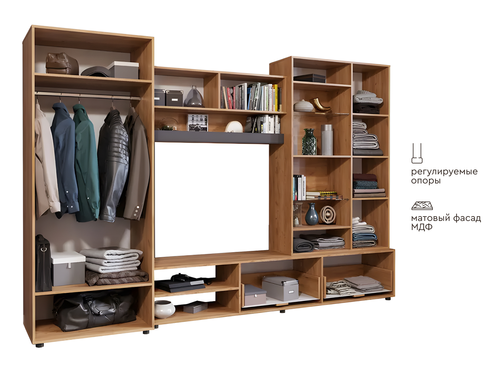Гостиная Сафари позволит рационально и практично спланировать обстановку. Богатое внутреннее наполнение предоставит достаточно пространства, чтобы разместить всё необходимое: от одежды и книг до посуды и аксессуаров.