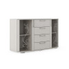 Комод Грация — настоящий идеал изящества и утонченности. Внешний вид модели пленяет, а богатое внутренне наполнение превращает в эталон функциональности. Фасады представляют собой чудесный тандем стеклянных и деревянных элементов. Центральная часть отведена под выдвижные ящики с удобными ручками. По бокам изысканно разместились распашные шкафчики с тонированными дверцами, украшенные витиеватыми узорами и стразами.