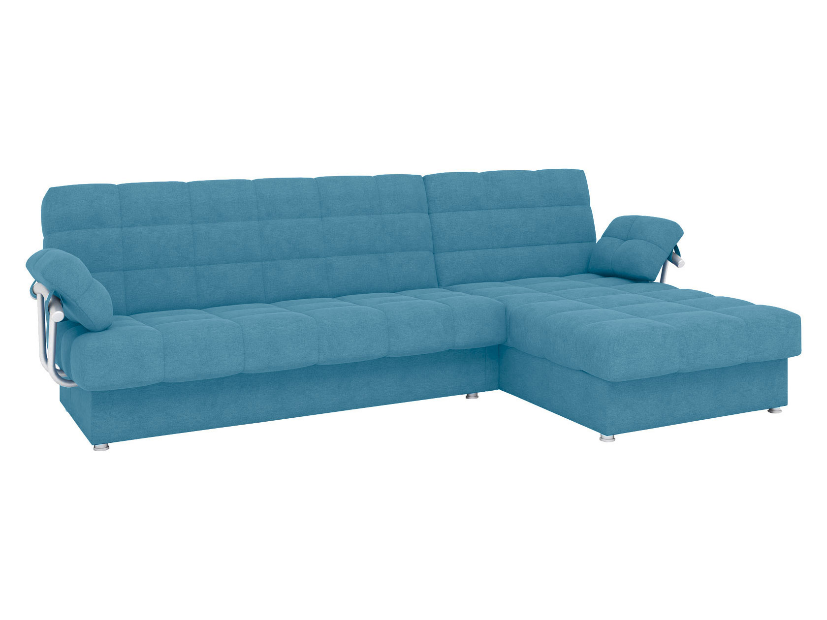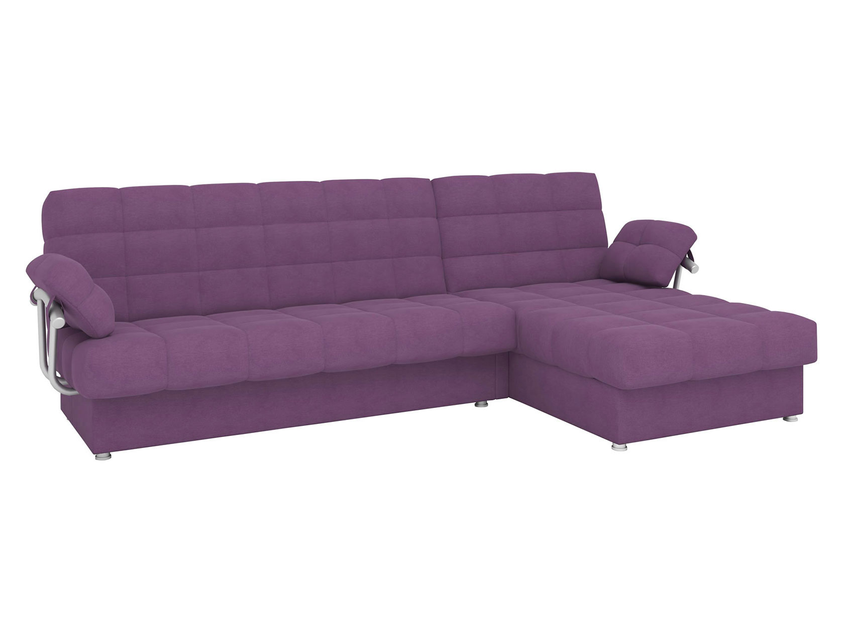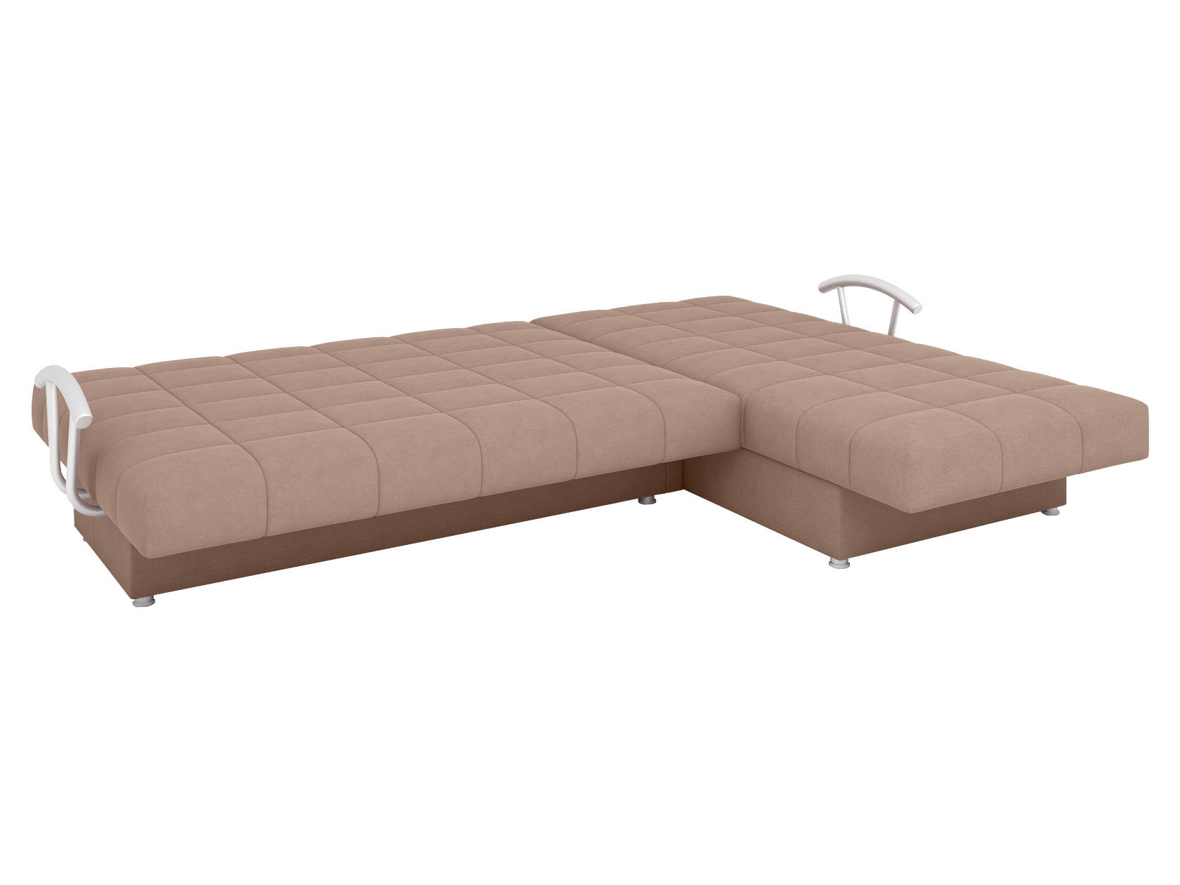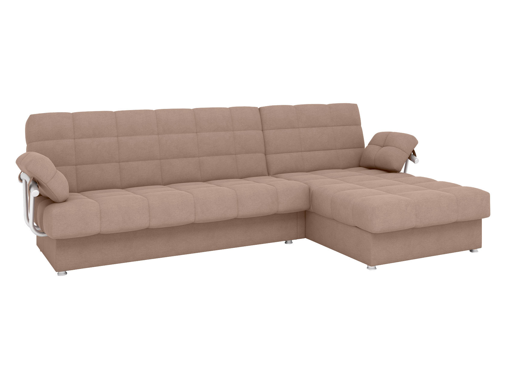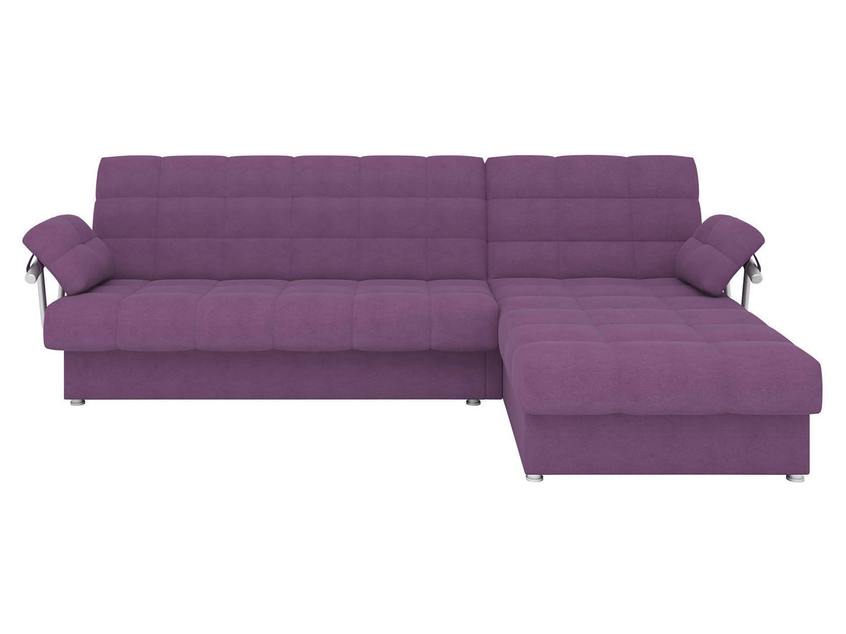 Угловой диван Мальта оснащен стильными хромированными подлокотниками. Съемная конструкция позволяет использовать модель без них или устанавливать по одному. Оттоманка дает возможность с комфортом отдыхать на диване в положении полулежа, а при необходимости превращается в отдельное от основной части место для сна. В разложенном виде модель представляет полноценную двуспальную кровать с мягким широким матрасом и ровным высоким спальным местом. Для постельных принадлежностей есть два больших бельевых ящика: в оттоманке и основной секции.