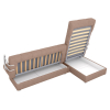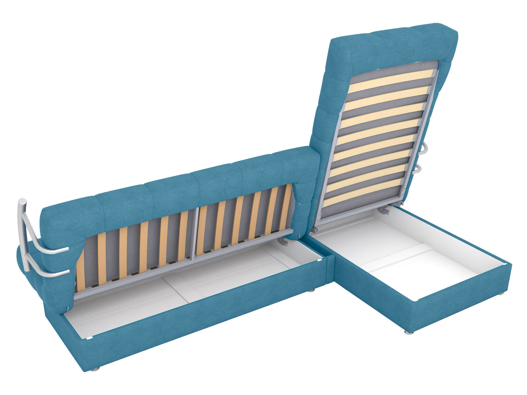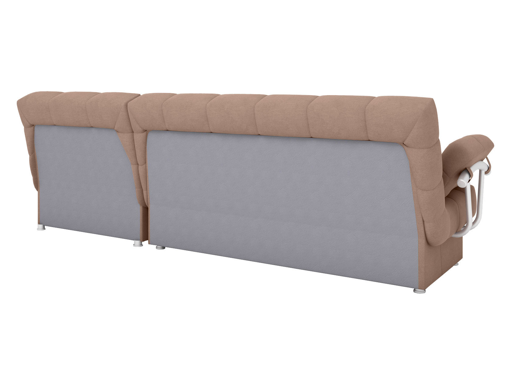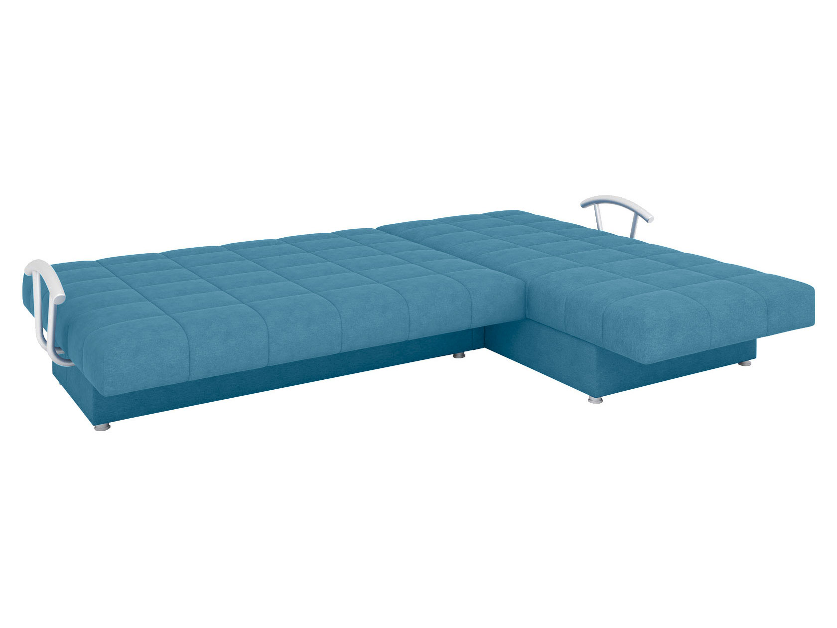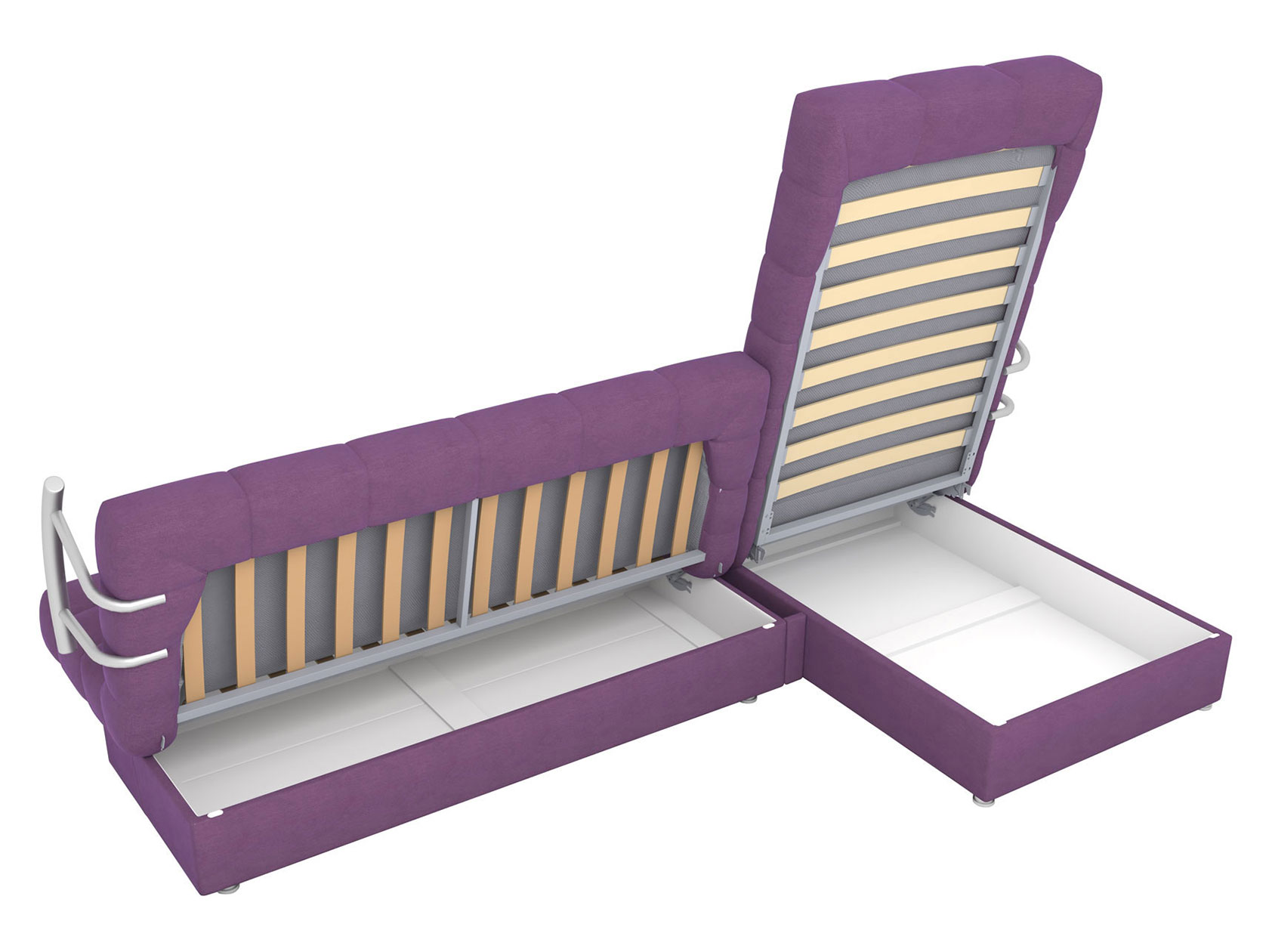 Угловой диван Мальта оснащен стильными хромированными подлокотниками. Съемная конструкция позволяет использовать модель без них или устанавливать по одному. Оттоманка дает возможность с комфортом отдыхать на диване в положении полулежа, а при необходимости превращается в отдельное от основной части место для сна. В разложенном виде модель представляет полноценную двуспальную кровать с мягким широким матрасом и ровным высоким спальным местом. Для постельных принадлежностей есть два больших бельевых ящика: в оттоманке и основной секции.