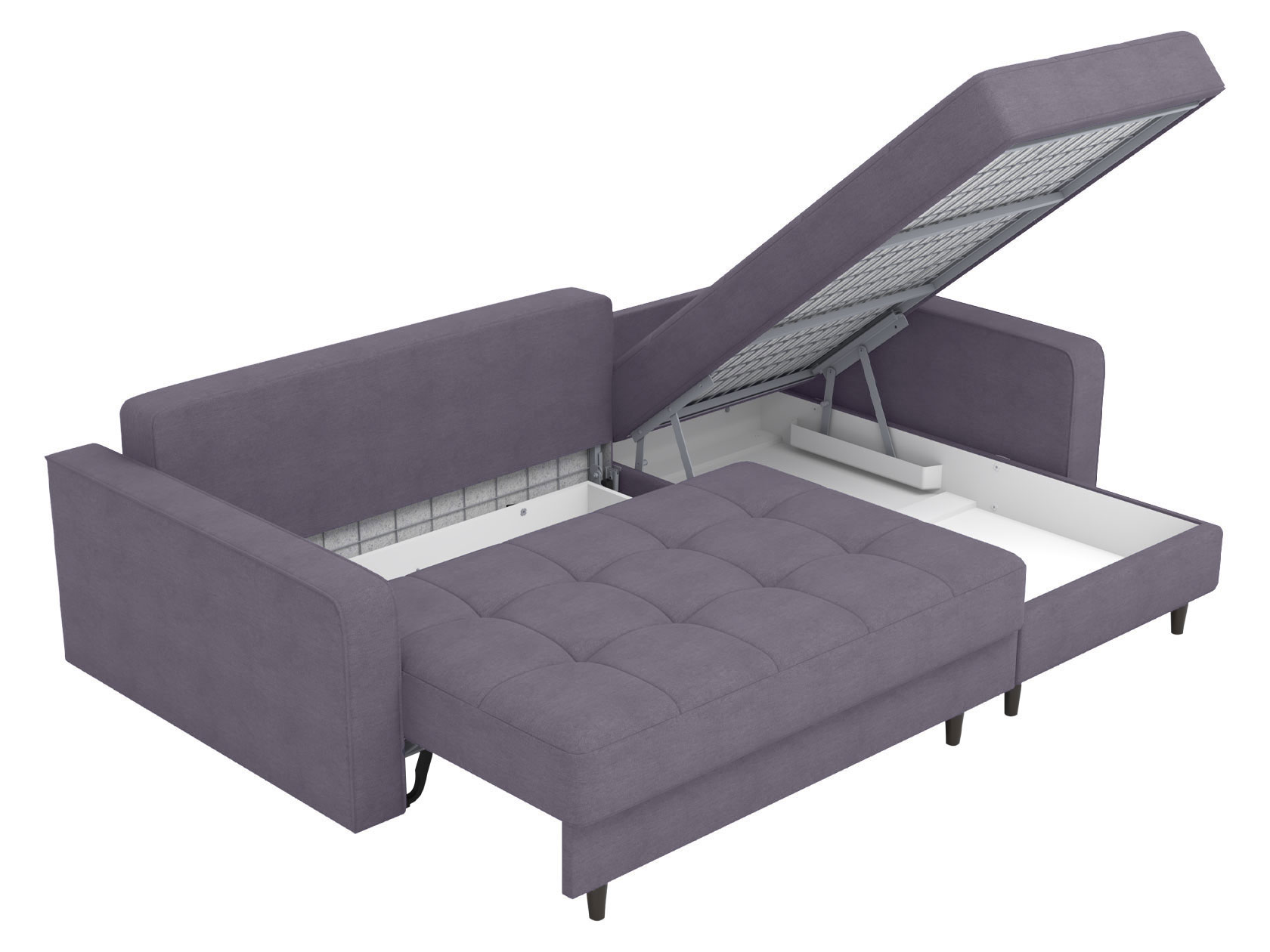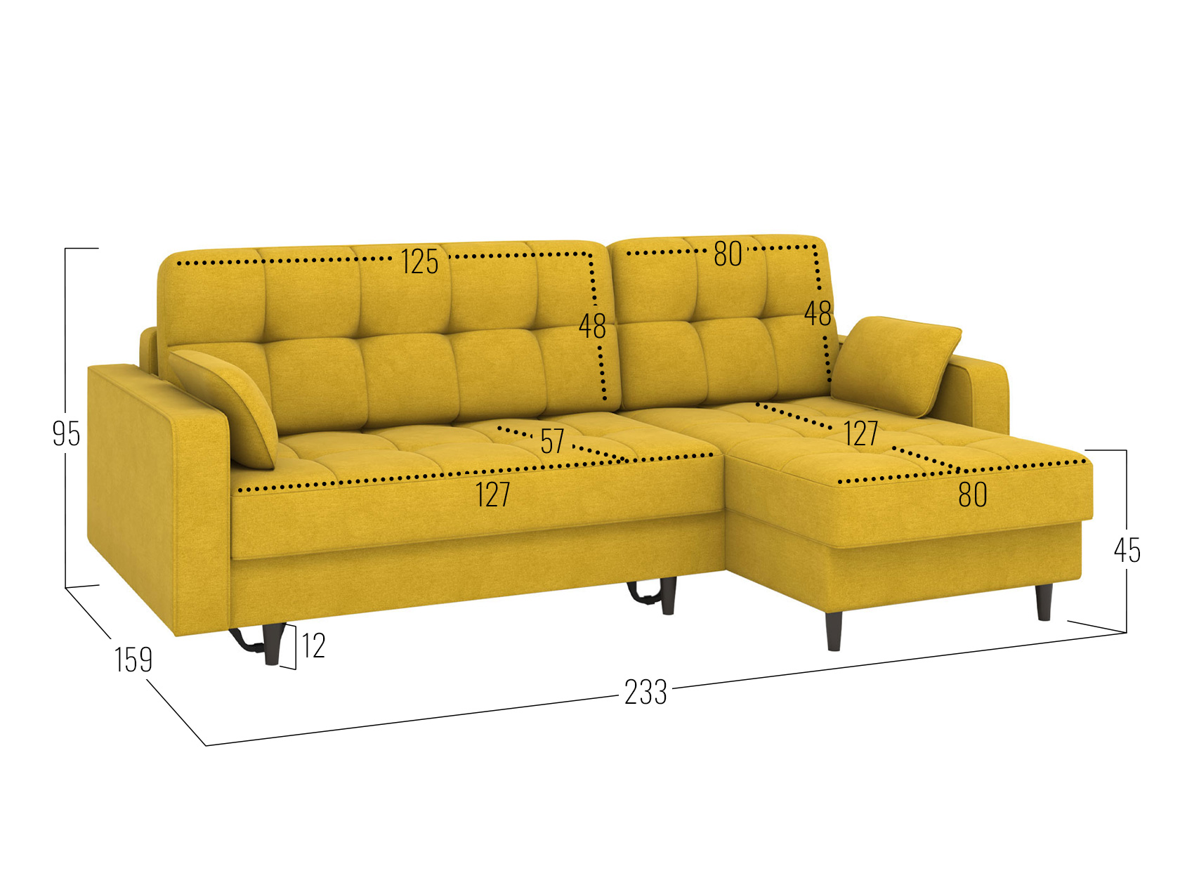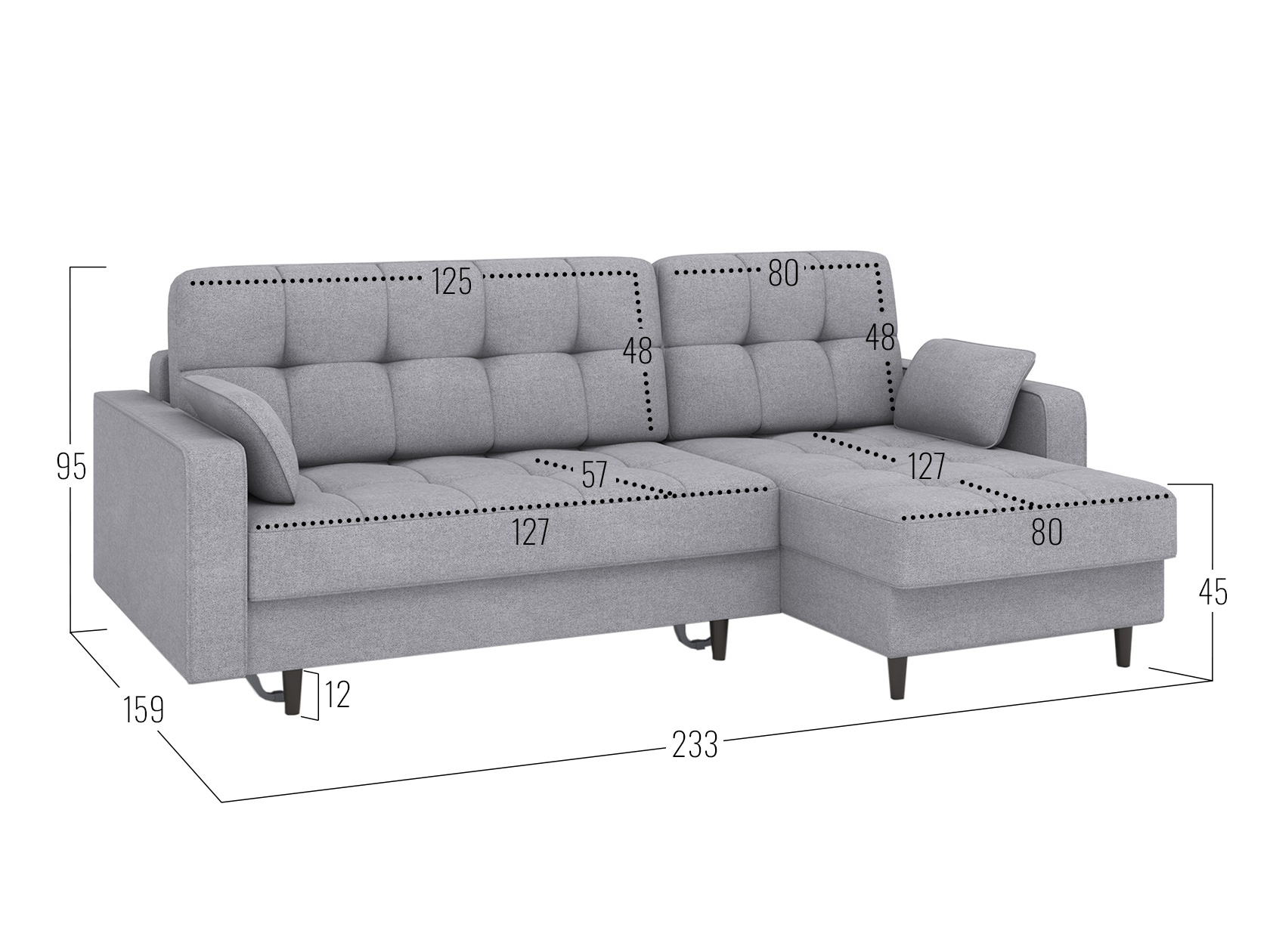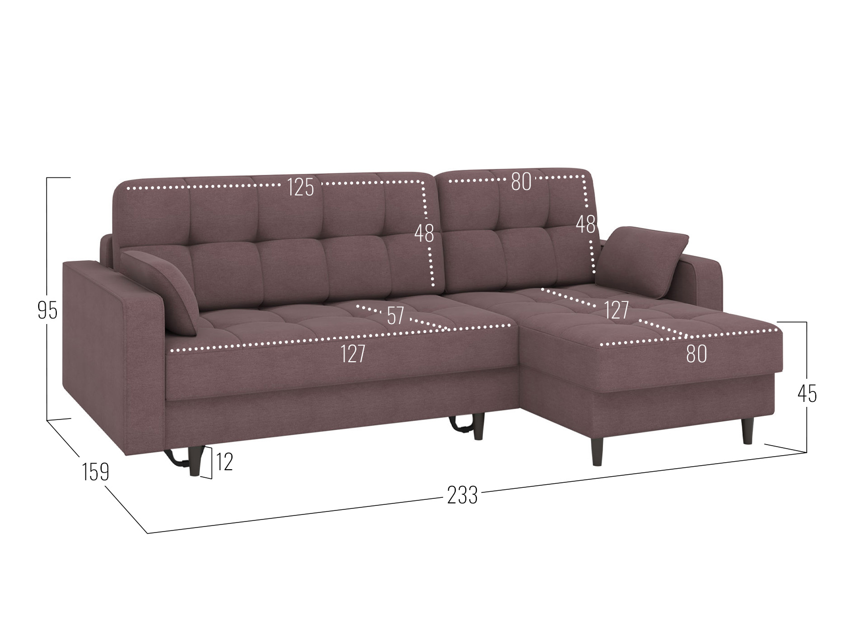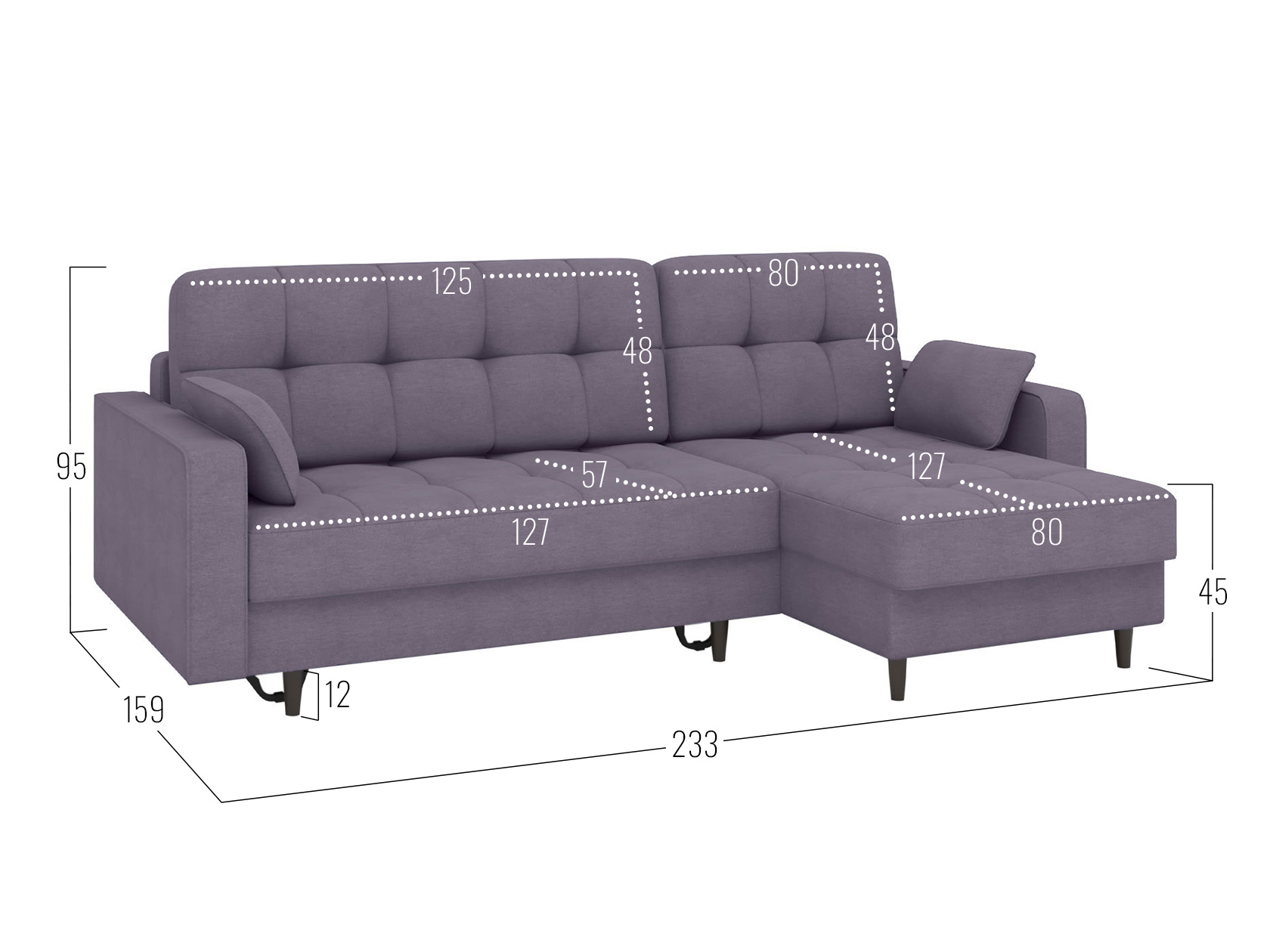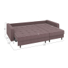 Угловой диван Санфорд станет отличным дополнением современного интерьера. Глубокое посадочное место, оптимальный угол наклона спинки и два типа наполнителя в объемных подушках — детали, которые делают модель по-настоящему комфортной. Диван легко трансформируется для сна и складывается обратно, не повреждая напольное покрытие. В разложенном виде образуется полноценное спальное место, а для постельных принадлежностей предусмотрены два вместительных ящика: в оттоманке и основной секции.