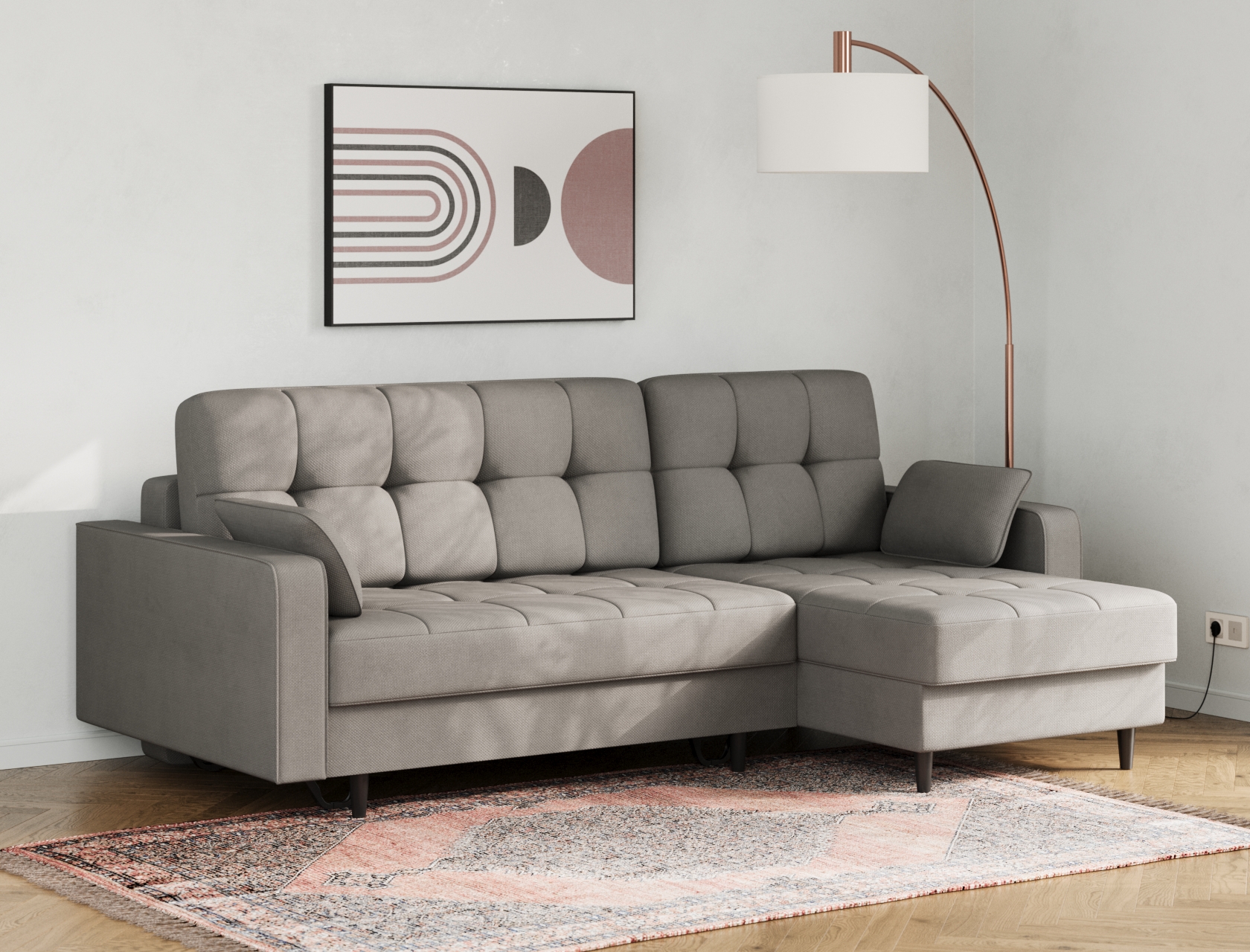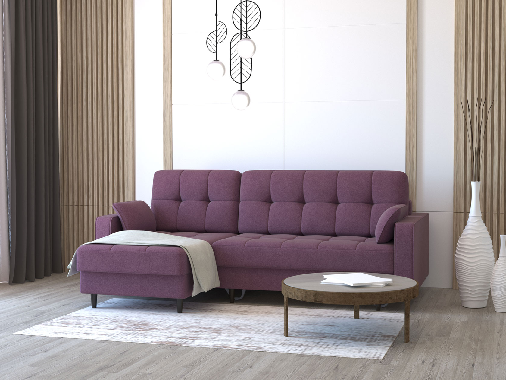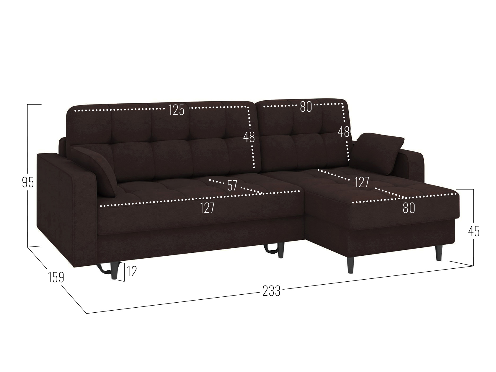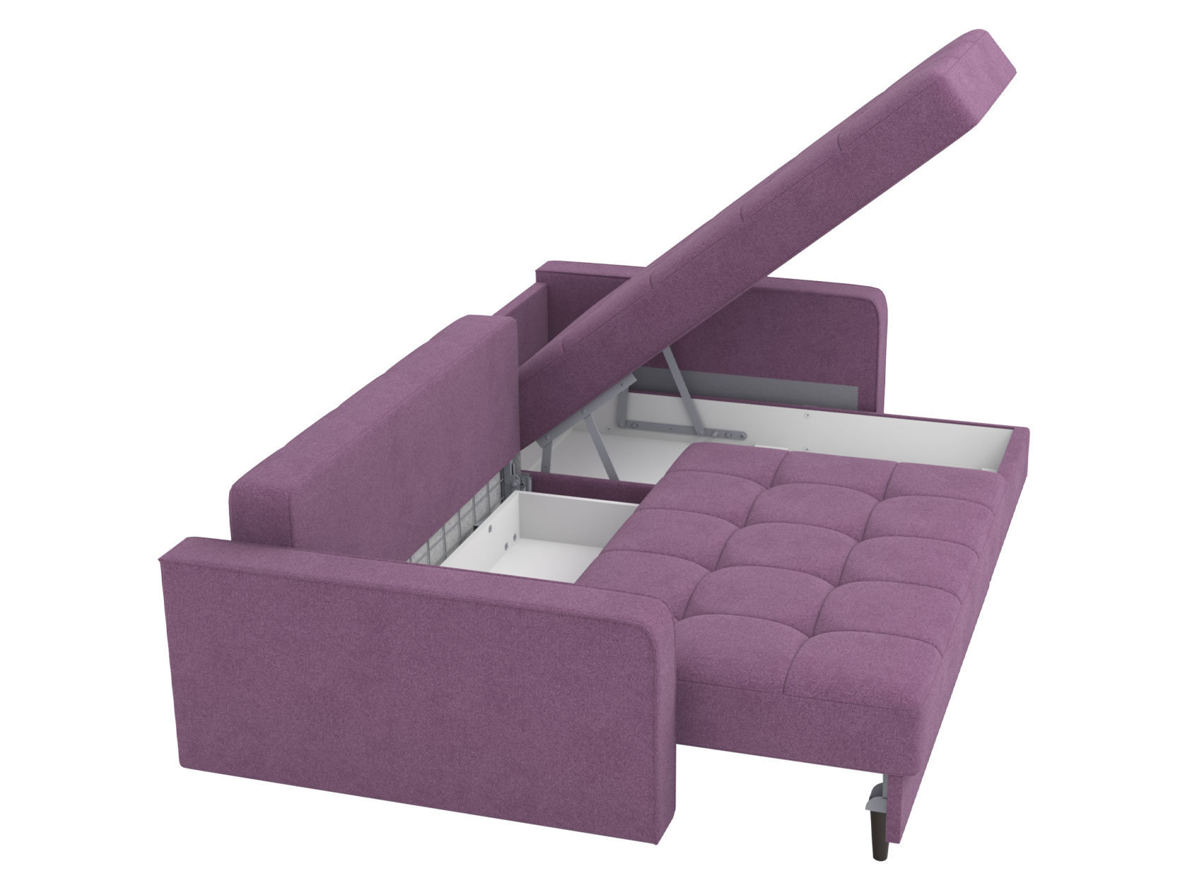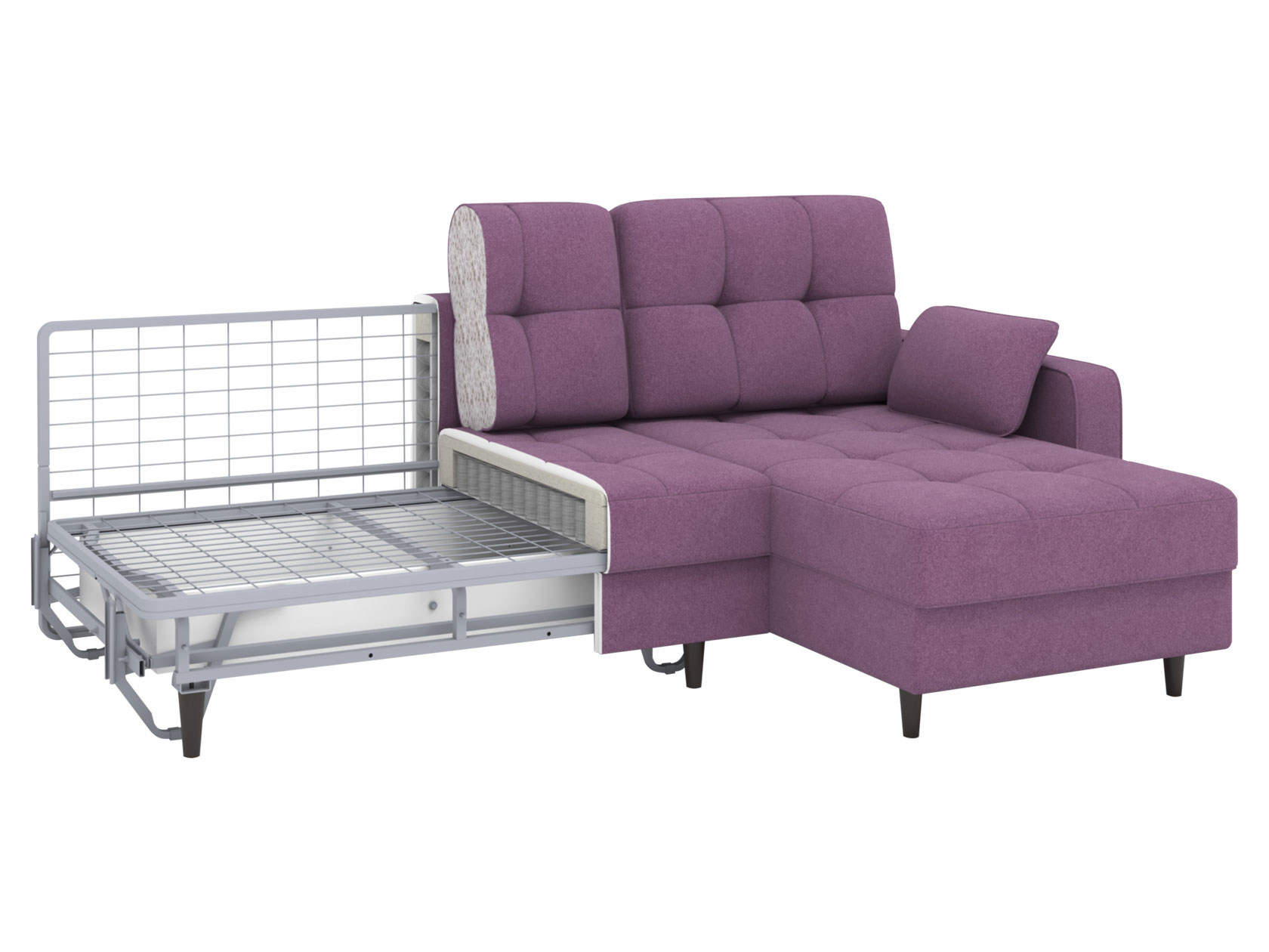 Угловой диван Санфорд станет отличным дополнением современного интерьера. Глубокое посадочное место, оптимальный угол наклона спинки и два типа наполнителя в объемных подушках — детали, которые делают модель по-настоящему комфортной. Диван легко трансформируется для сна и складывается обратно, не повреждая напольное покрытие. В разложенном виде образуется полноценное спальное место, а для постельных принадлежностей предусмотрены два вместительных ящика: в оттоманке и основной секции.