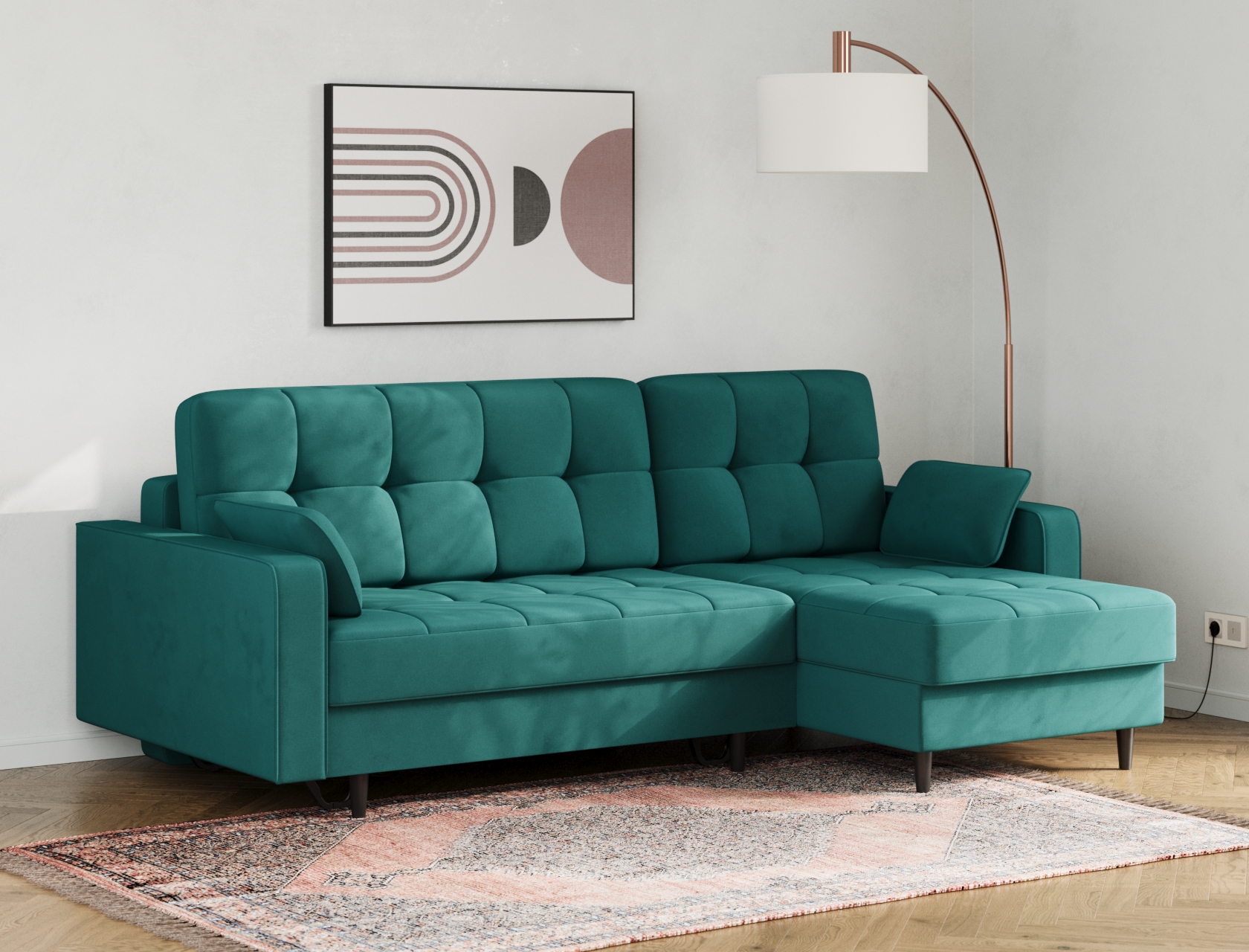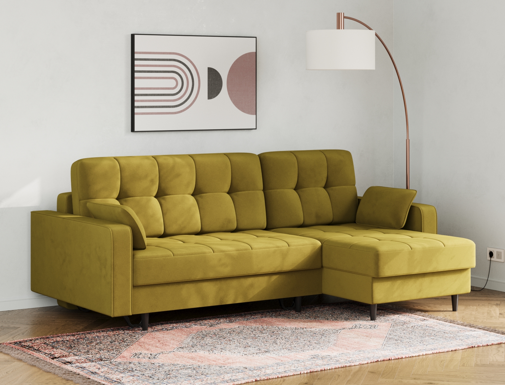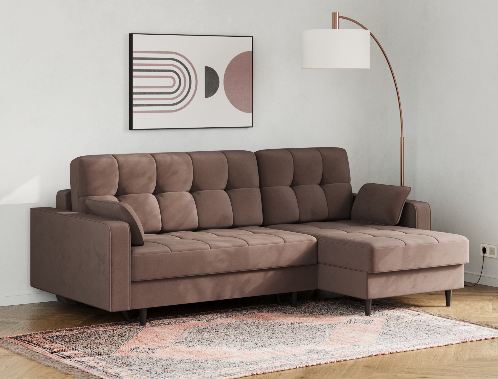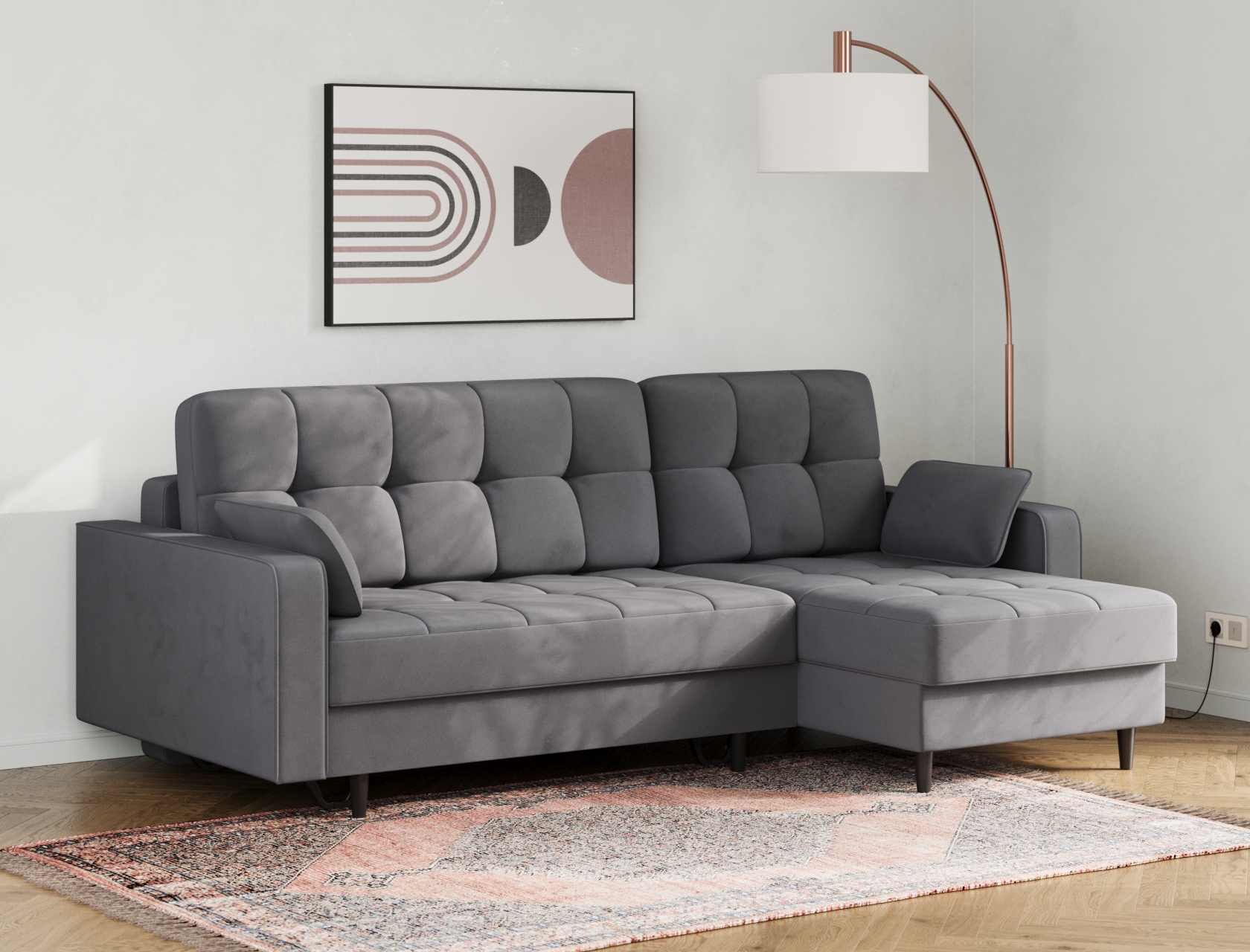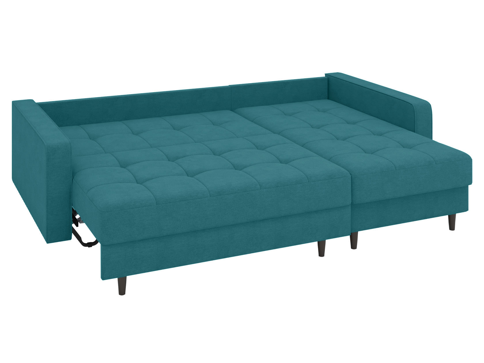 Угловой диван Санфорд станет отличным дополнением современного интерьера. Глубокое посадочное место, оптимальный угол наклона спинки и два типа наполнителя в объемных подушках — детали, которые делают модель по-настоящему комфортной. Диван легко трансформируется для сна и складывается обратно, не повреждая напольное покрытие. В разложенном виде образуется полноценное спальное место, а для постельных принадлежностей предусмотрены два вместительных ящика: в оттоманке и основной секции.