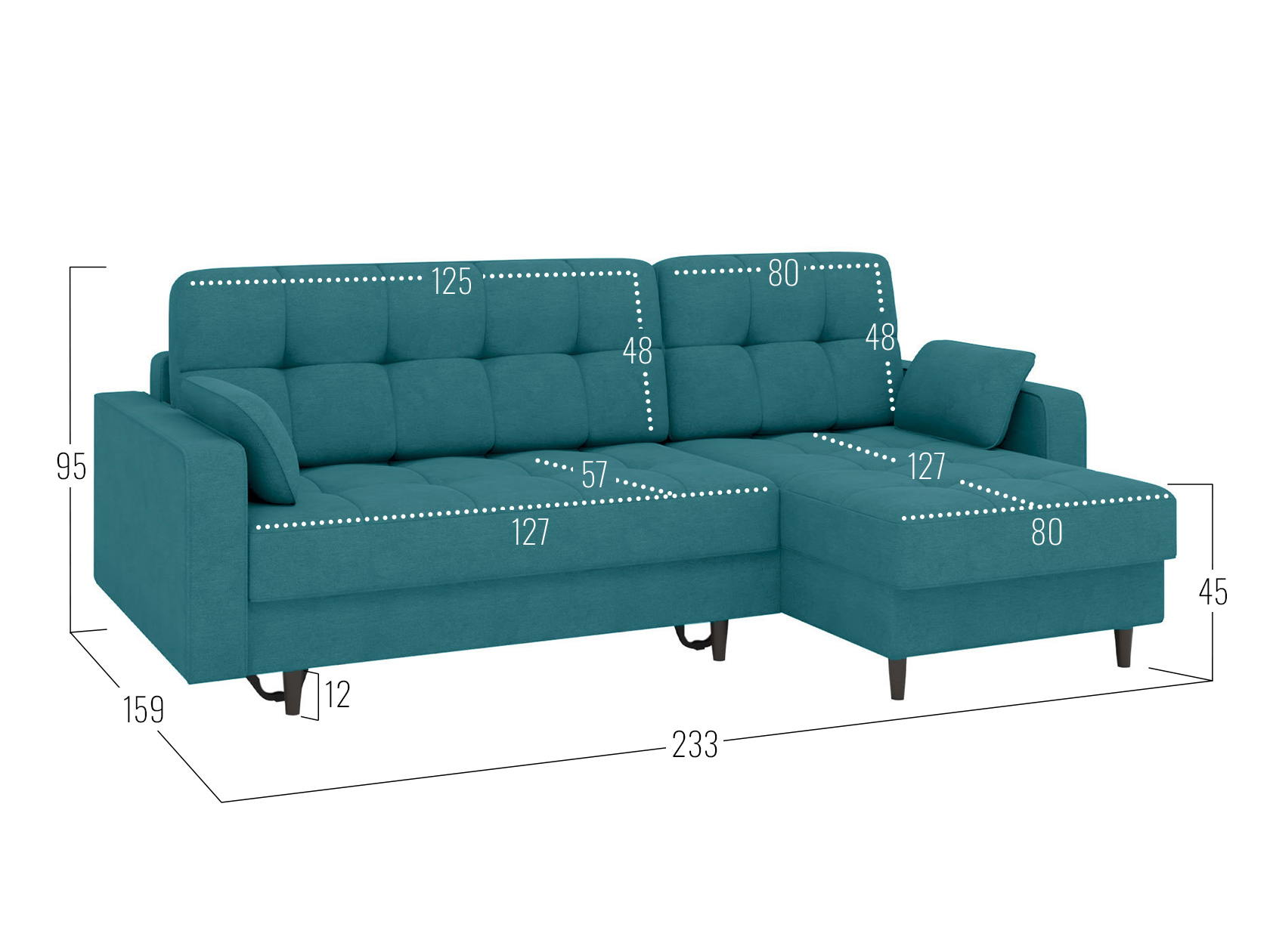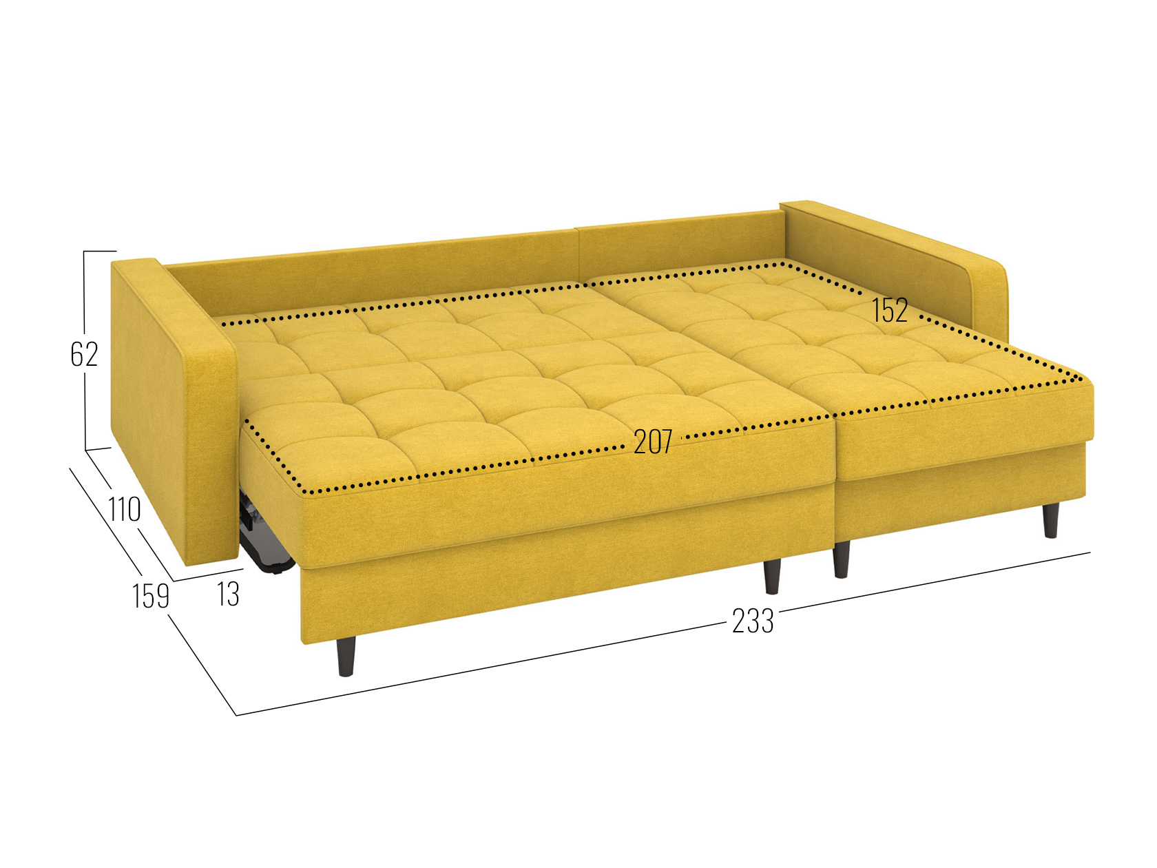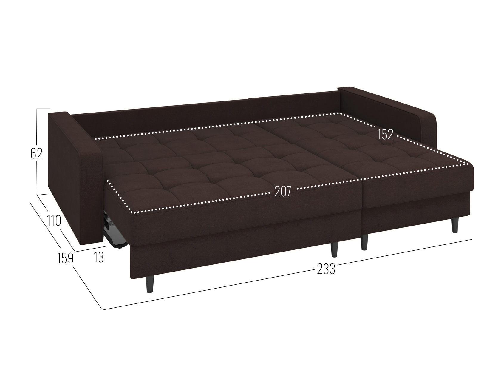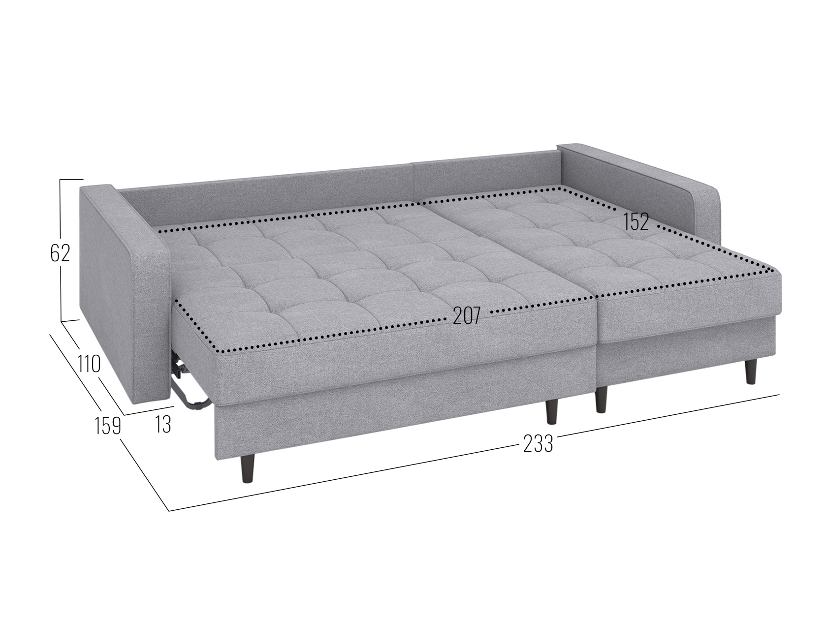 Посадочное место без подушек (ШхГ): 207 х 82 см.