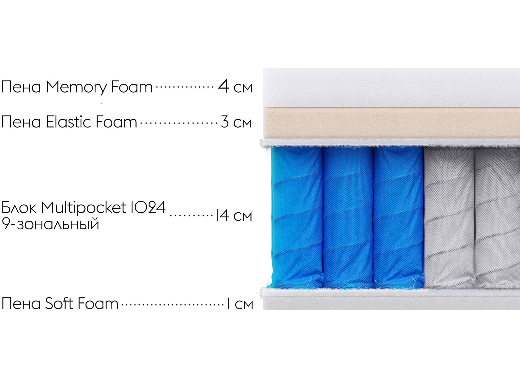 Эластик Фоам / Elastic Foam — гипоаллергенный слой средней жесткости. Пена Мемори Фоам / Memory Foam с эффектом «памяти» способствуют полноценному расслаблению, ускоряя засыпание. Такая структура усиливает анатомические свойства каждого слоя и способствует качественному восстановлению сил. Матрас отлично подходит для любой позы сна.