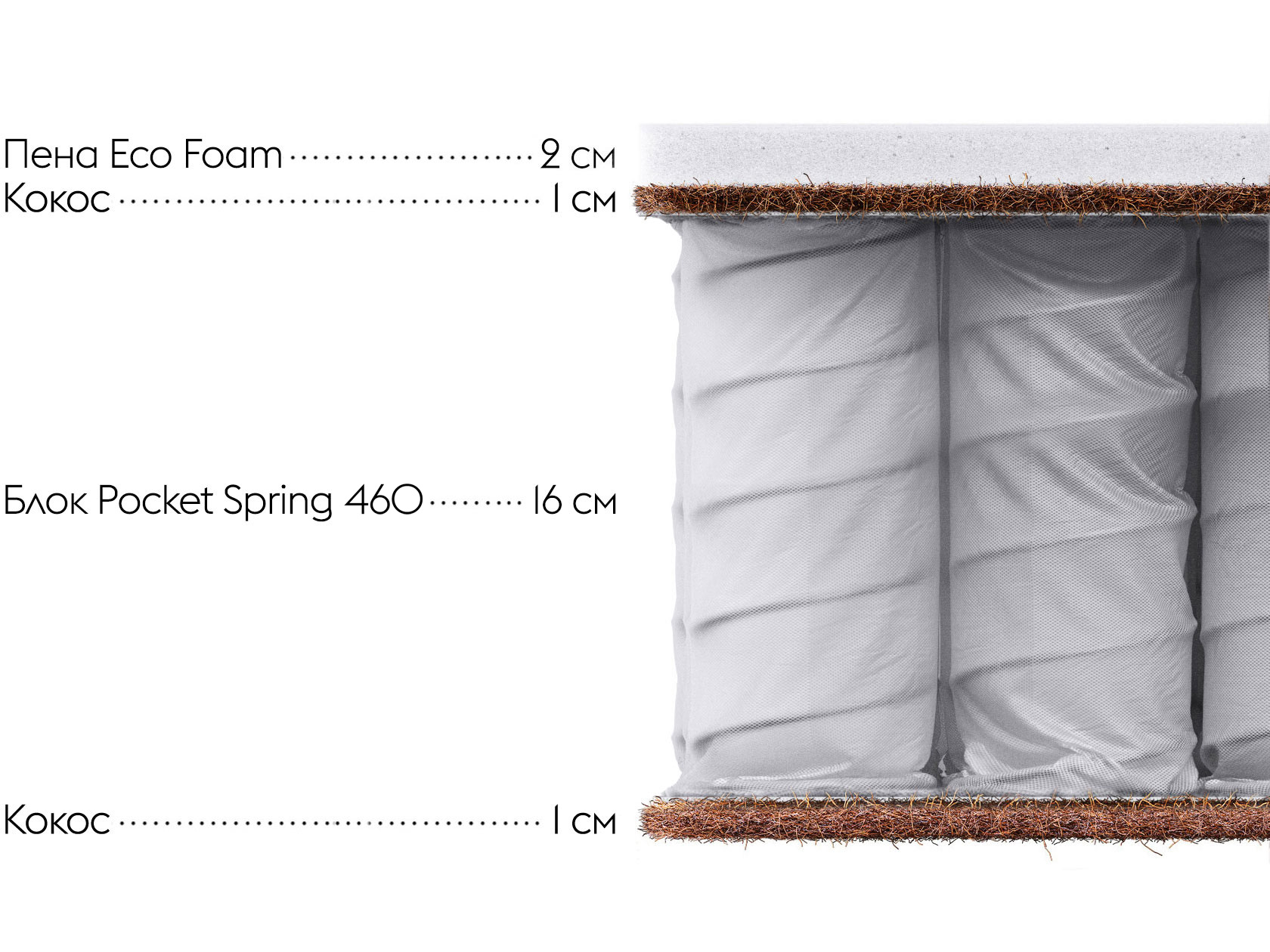 Пружинный матрас First SX 22 — самый высокий в линейке базовых моделей для дачи, гостевой комнаты или съемной квартиры. Блок Pocket Spring 460 с множеством независимых пружин и натуральный кокос обеспечивают правильное положение во сне и необходимую жесткость. Слой гипоаллергенной пены Eco Foam и трикотажный чехол смягчают матрас и делают его комфортабельным. Обратите внимание, матрас надлежащего качества обмену и возврату не подлежит. Допустимое отклонение по высоте — 1,5 см. Ткань чехла может немного отличаться от контента, представленного на сайте.