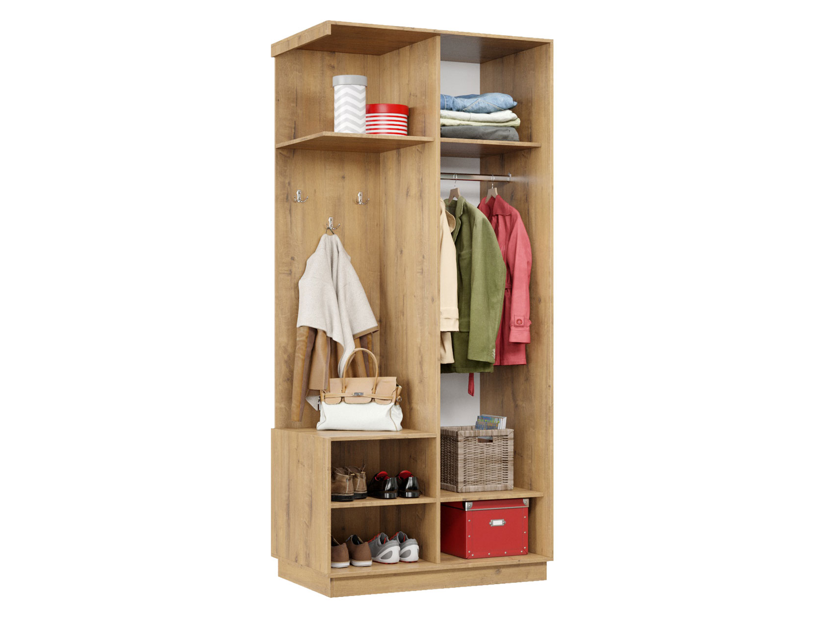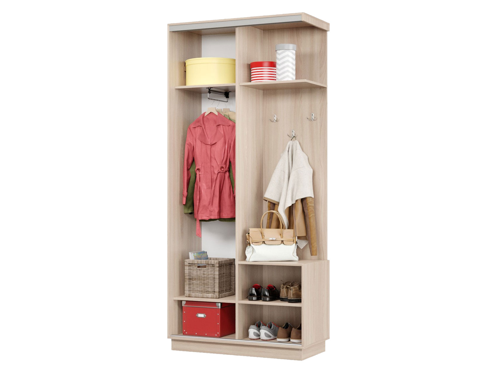 Прихожая Маршал станет отличным решением для меблировки небольшого помещения. Конструкция поделена на две равные по размеру секции: отделение со штангой для вешалок и нишу с полками и крючками для верхней одежды. Отличительная черта модели — дверь, которая перемещается по однополосному треку вправо или влево, поочередно открывая и закрывая каждую из секций, что важно для узкого коридора.