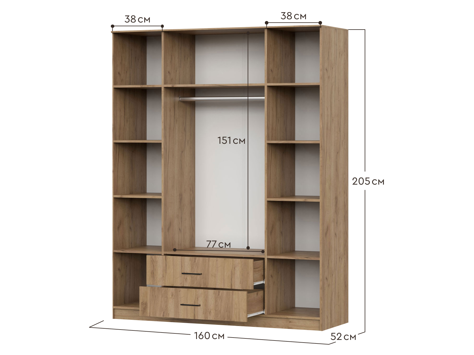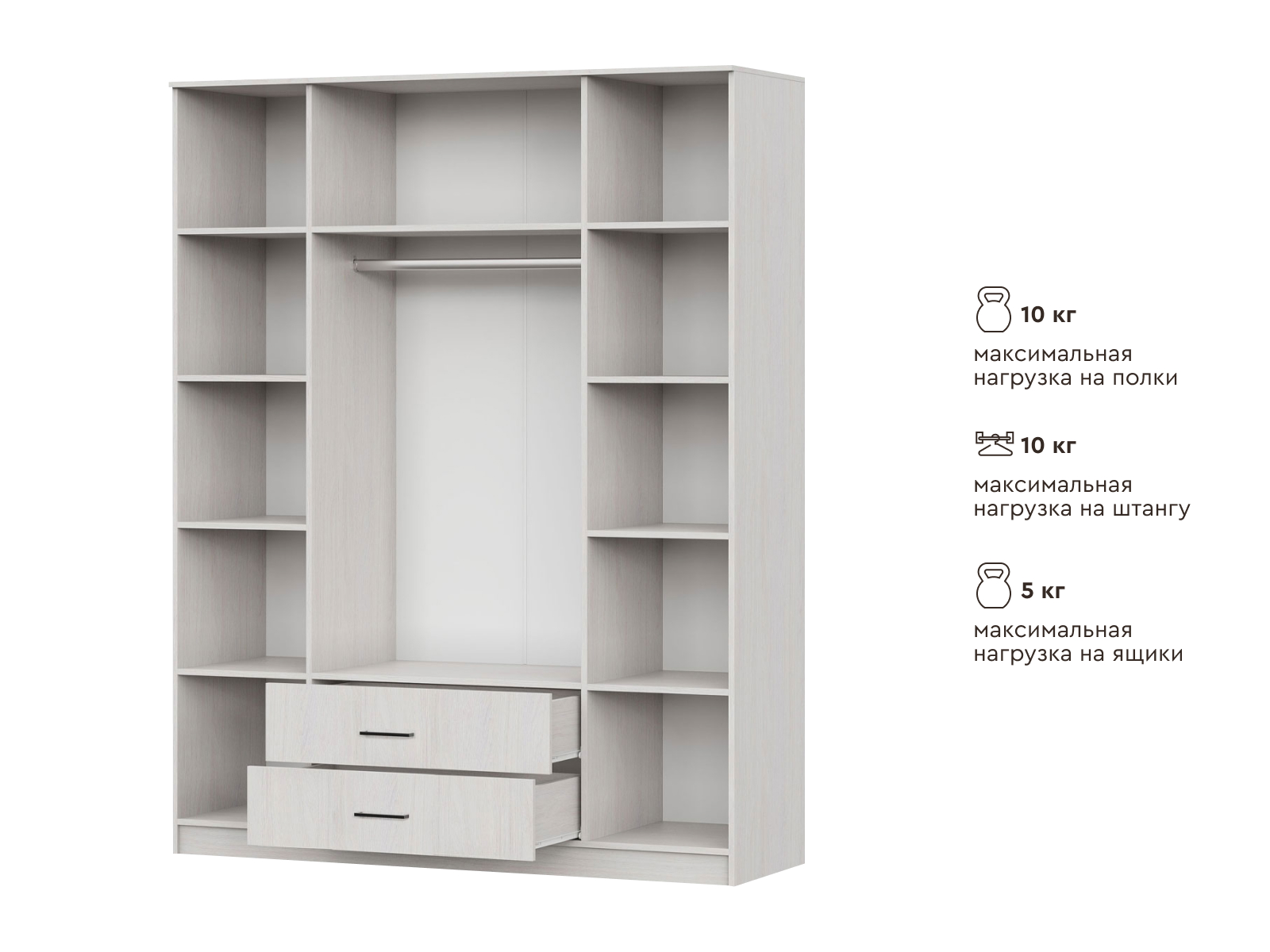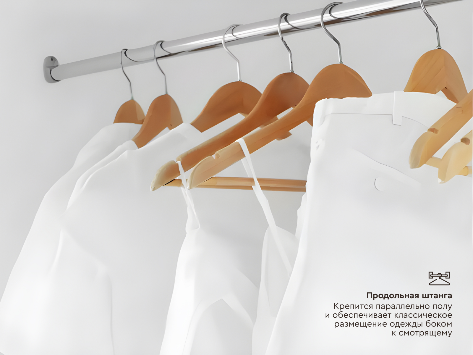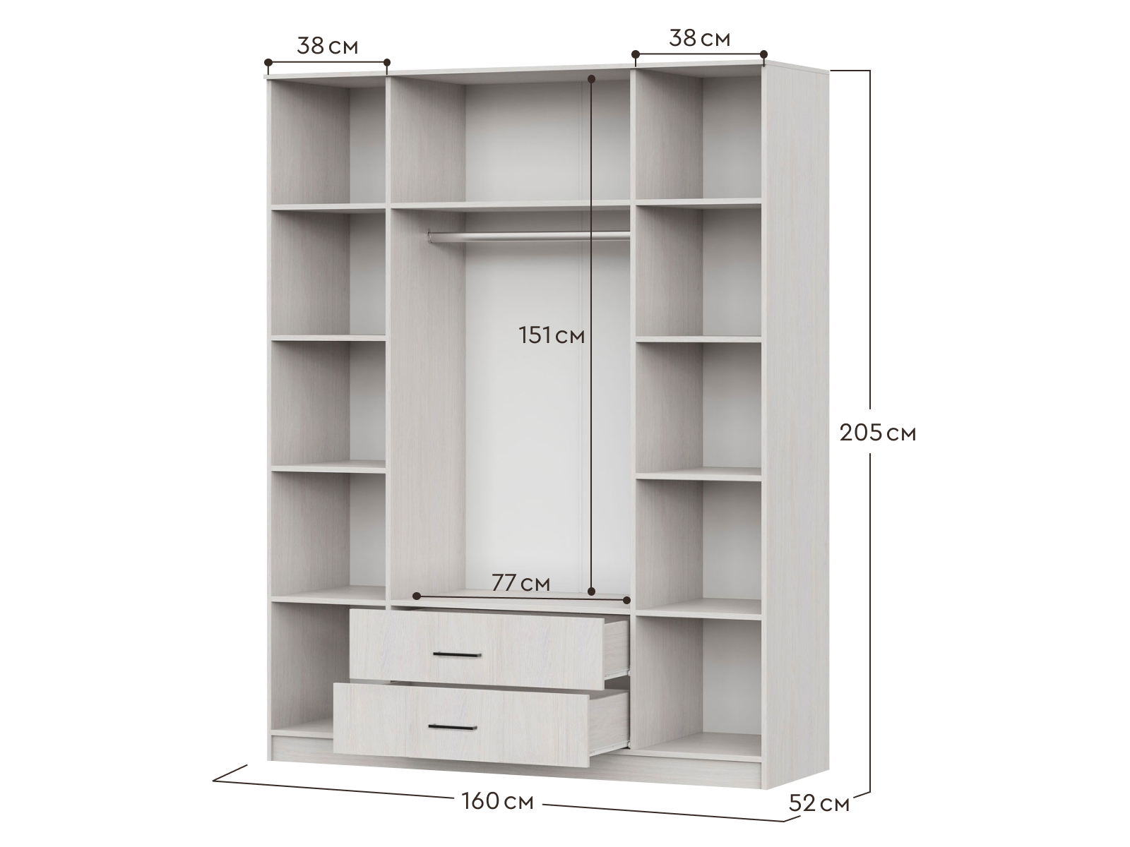 Лаконичный дизайн распашного шкафа Севан сочетает правильные формы и прямые линии. Комбинированное наполнение представлено отделением со штангой для вешалок, антресольной нишей, двумя рядами полок для сложенной одежды и вместительными выдвижными ящиками.