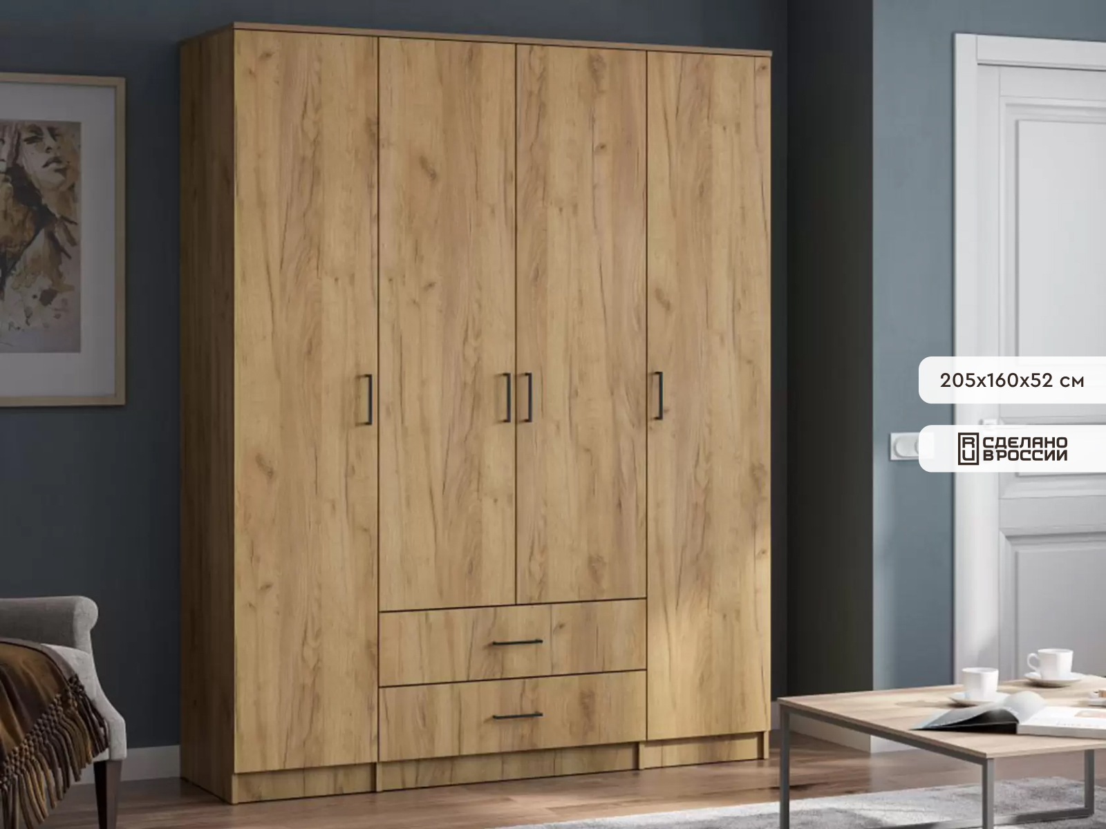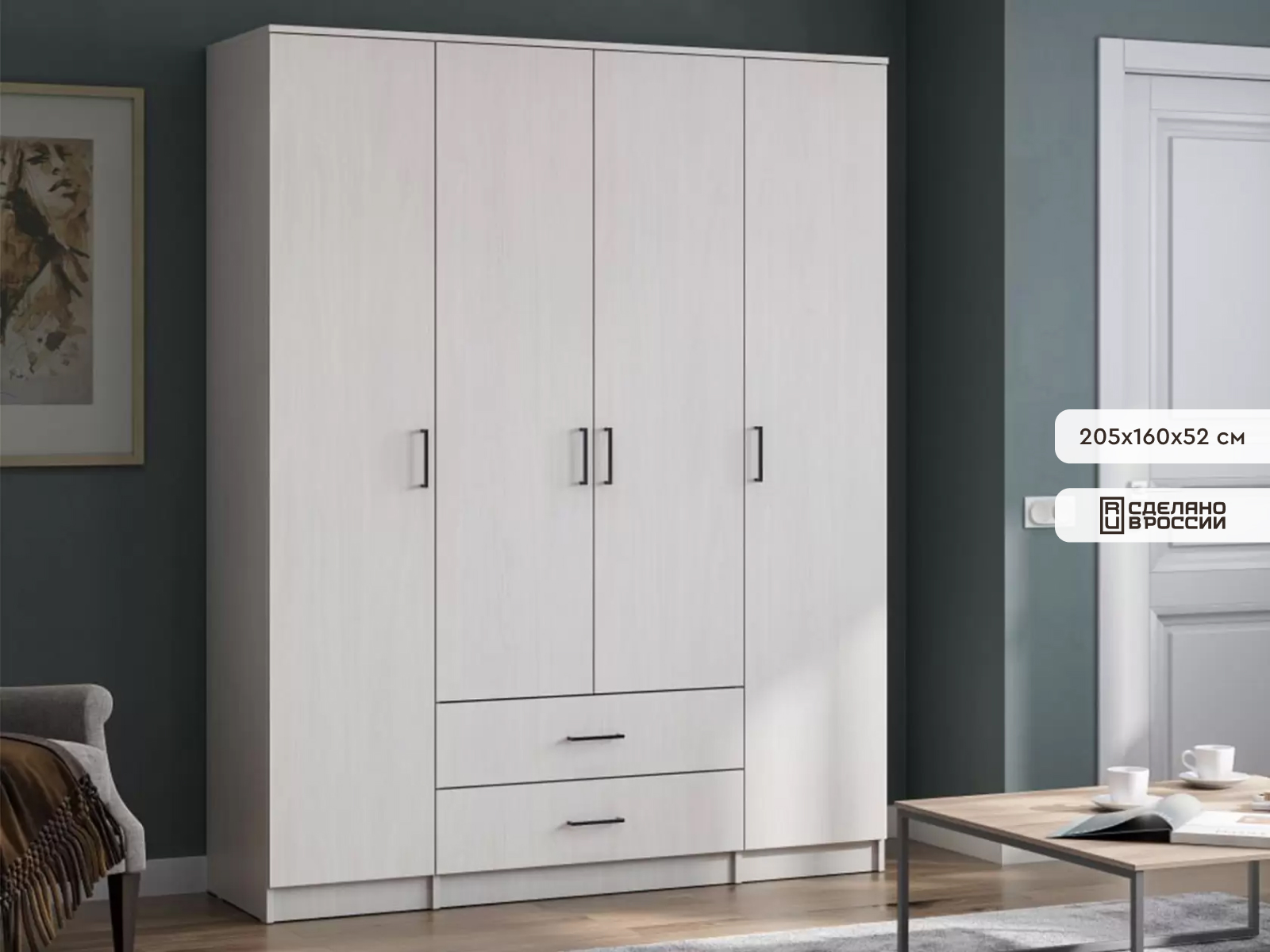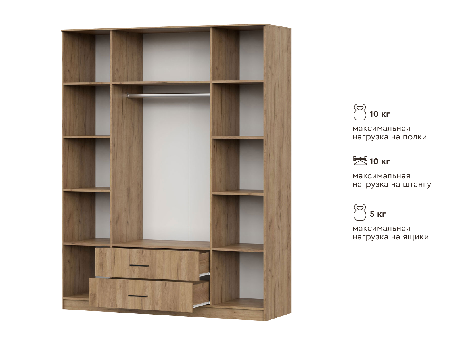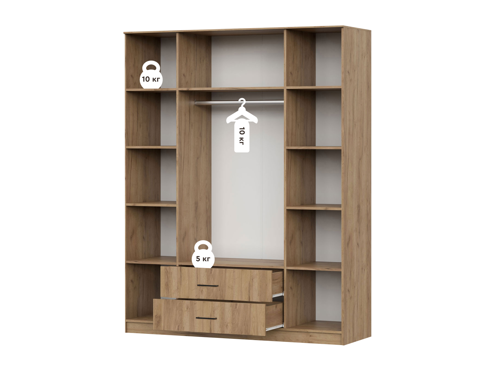 Лаконичный дизайн распашного шкафа Севан сочетает правильные формы и прямые линии. Комбинированное наполнение представлено отделением со штангой для вешалок, антресольной нишей, двумя рядами полок для сложенной одежды и вместительными выдвижными ящиками.