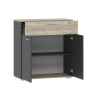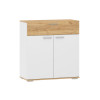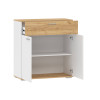 Комод Санти оснащен небольшим выдвижным ящиком и просторной секцией с распашными дверцами. Вверху удобно хранить ключи, аксессуары и другие мелочи, без которых не обойтись в любой квартире, а на полках — более габаритные вещи. Гладкие фасады и лаконичная фурнитура подчеркивают минималистичный дизайн модели.