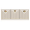 ТВ-тумба Капри станет ярким акцентом в интерьере гостиной, позволит разместить широкоформатный телевизор и дополнит систему хранения тремя отделениями за глухими дверцами. Модель выполнена в приятных кремовых оттенках, а фасады украшены декоративной фрезеровкой. Дверцы оснащены петлями с доводчиками, что поможет избежать хлопков и резкого закрывания.