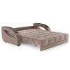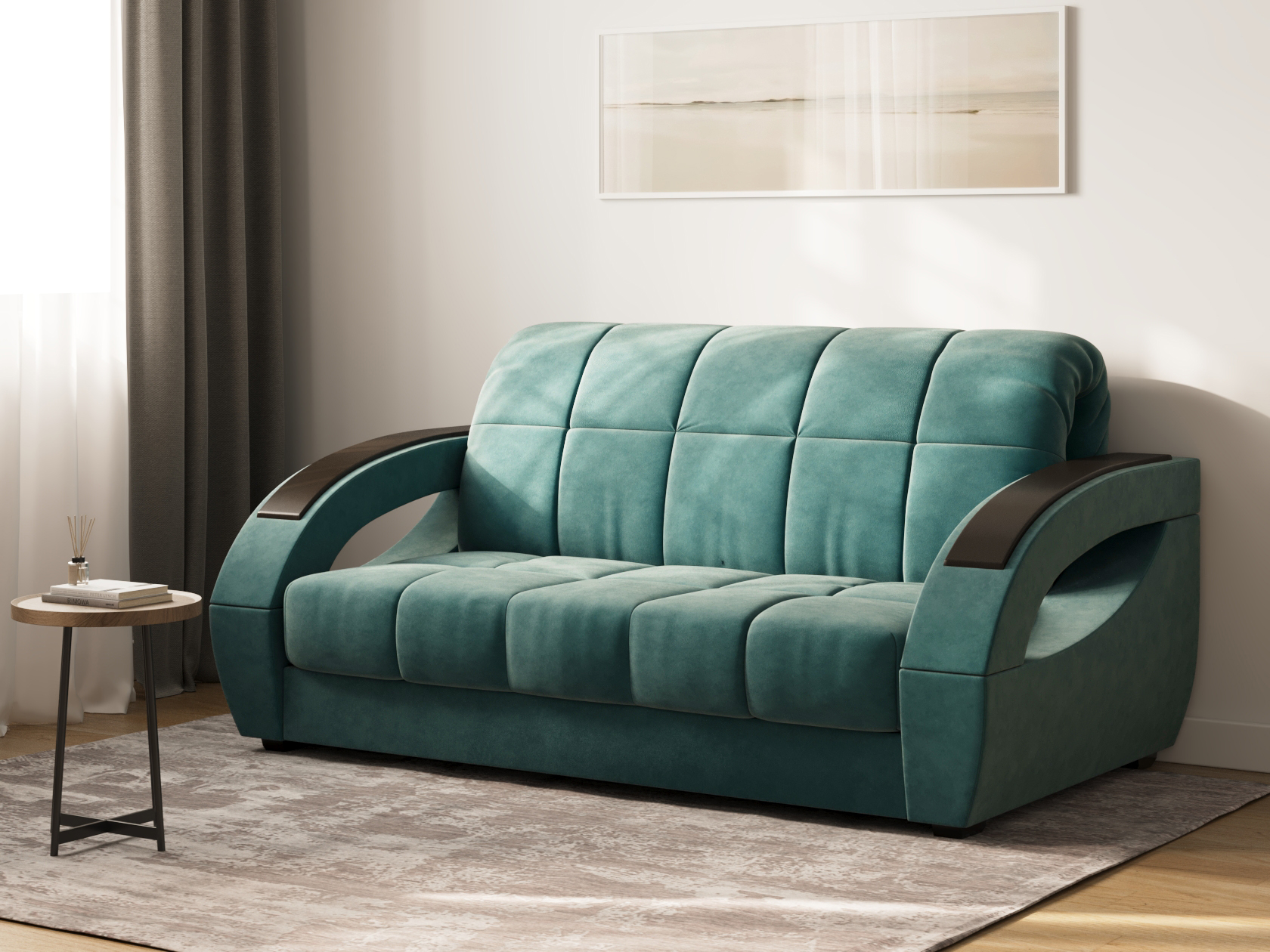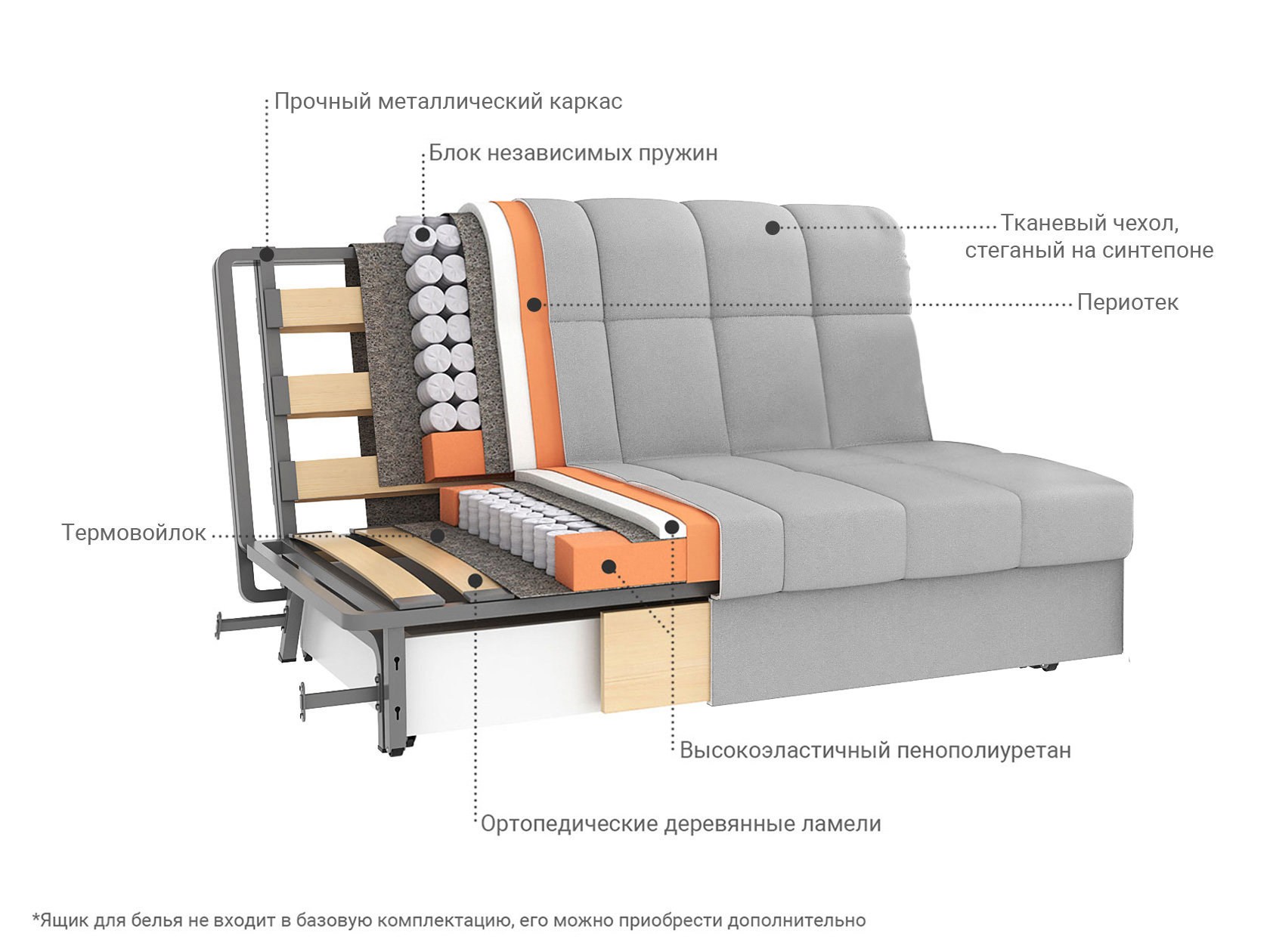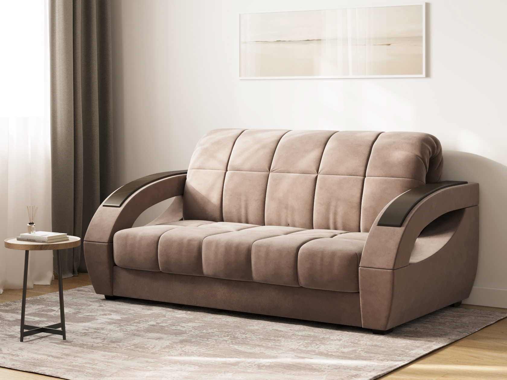 Шагающий механизм превращает модель в полноценную кровать и не портит напольное покрытие. В разложенном виде получается ровное спальное место, при этом невысокая планка защищает от контакта со стеной. Такой диван отлично подходит для ежедневного сна.