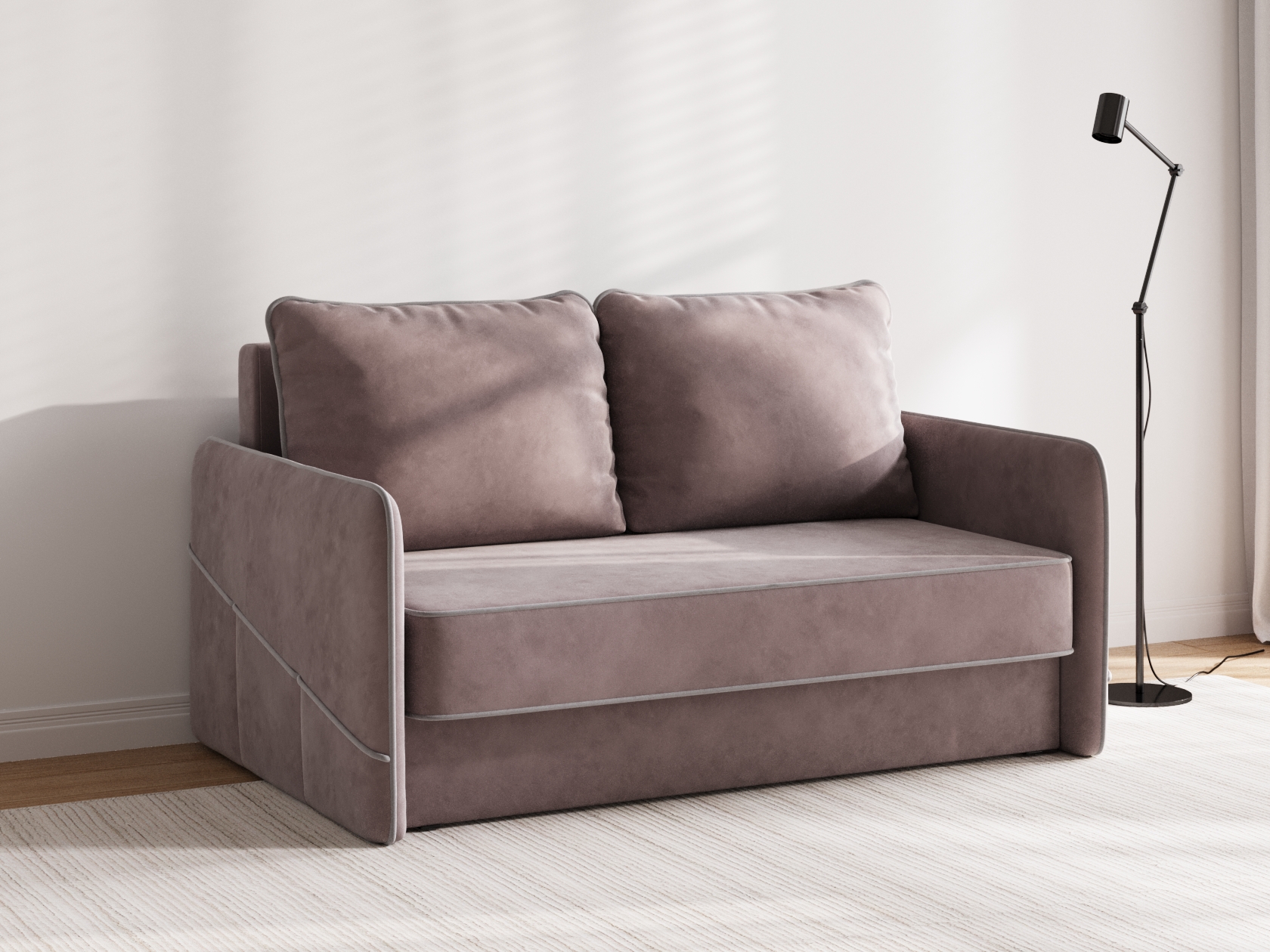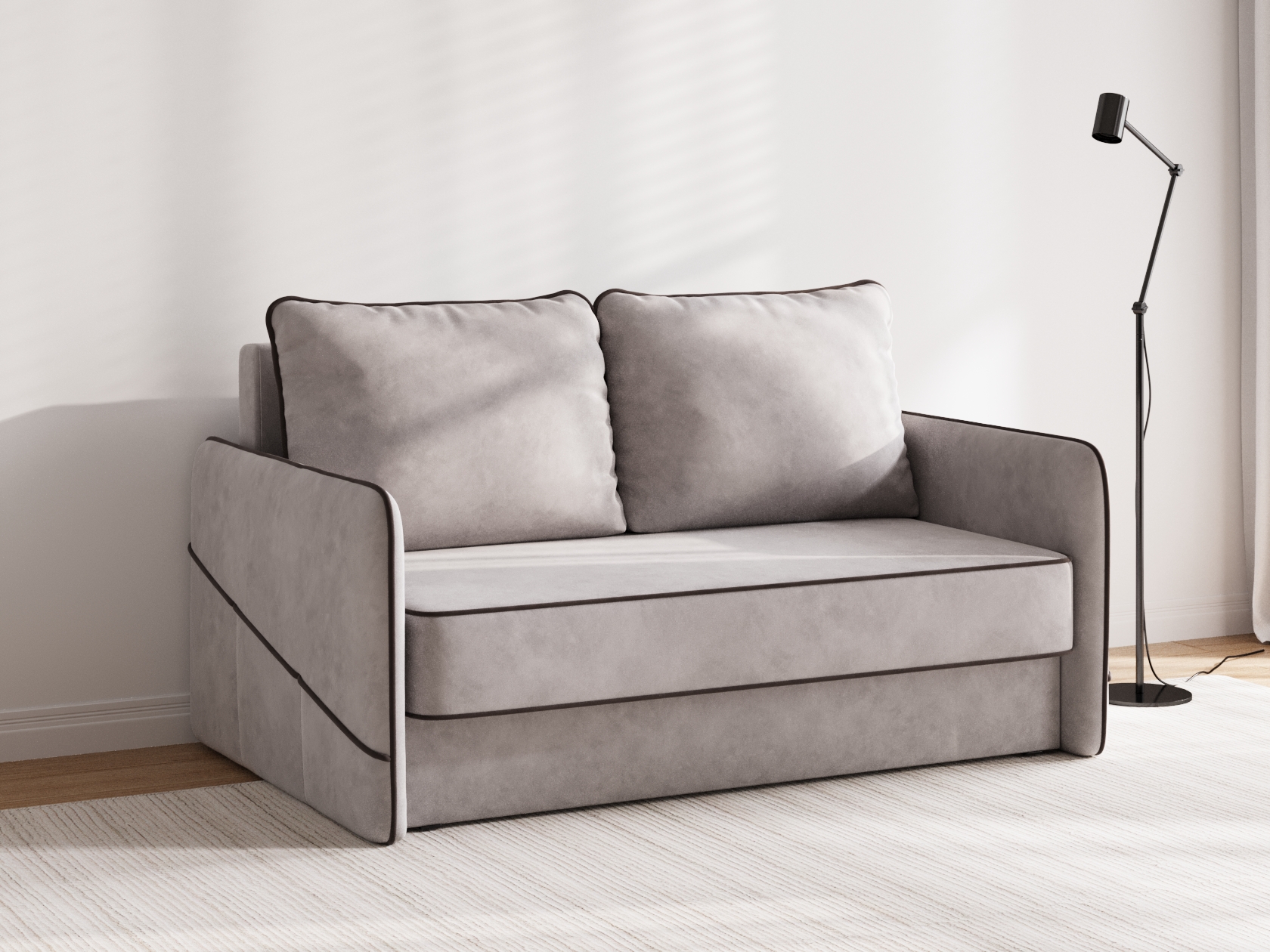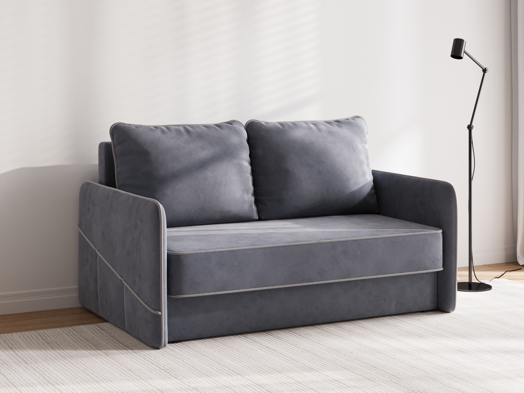 Сиденье, подлокотники и подушки украшены контрастным кантом. Такой декор подчеркивает лаконичную форму модели и выступает в роли акцента. Диван безупречно смотрится с любого ракурса, что позволяет использовать его для зонирования пространства. Ящик для белья — практичное решение для небольших помещений.