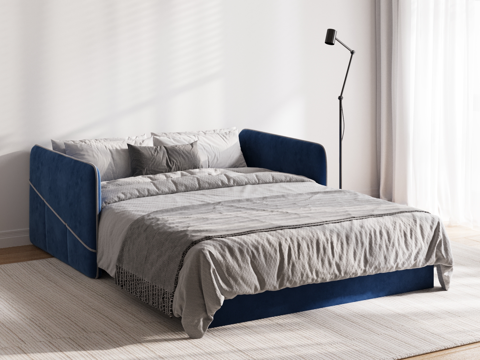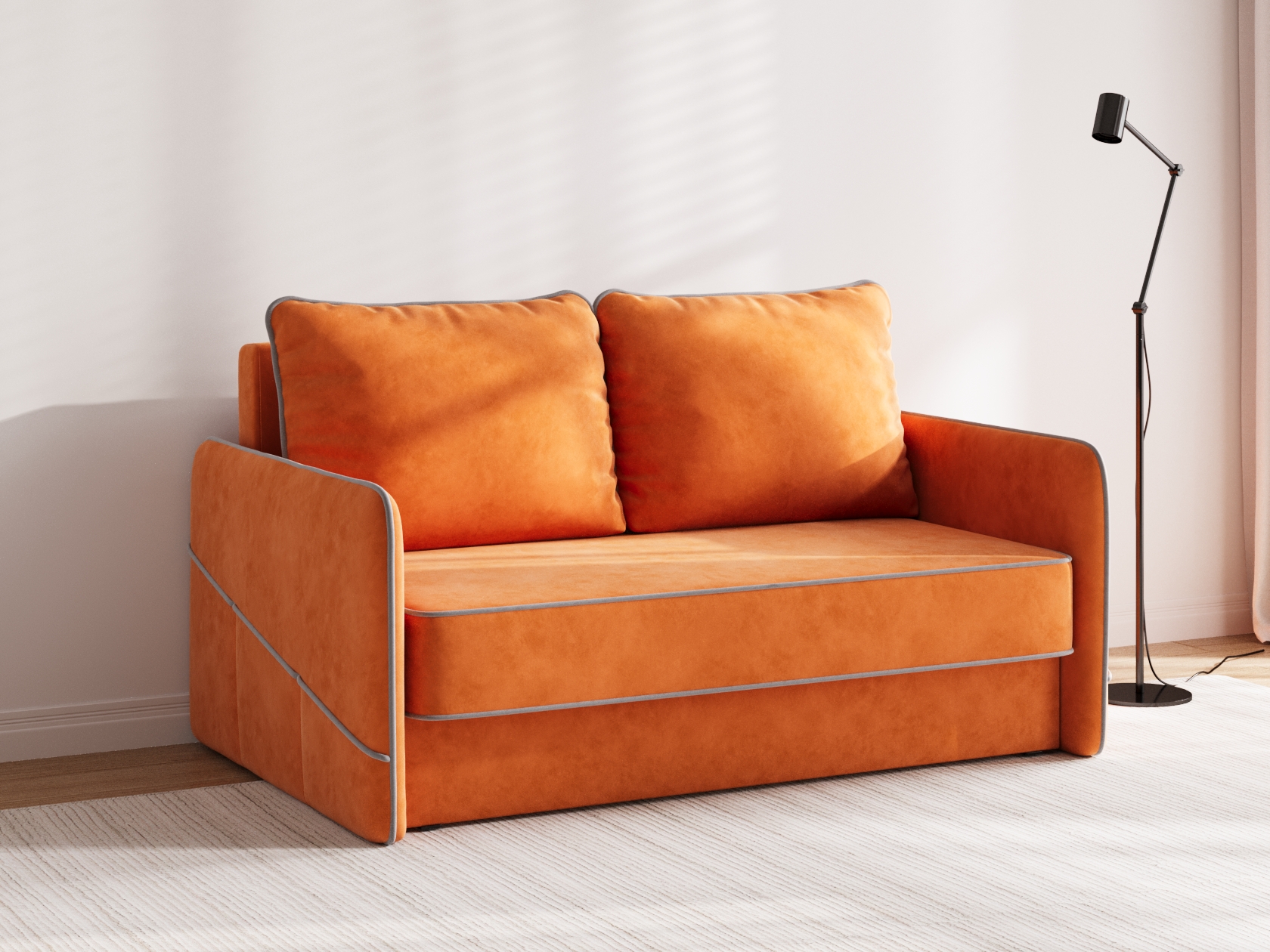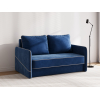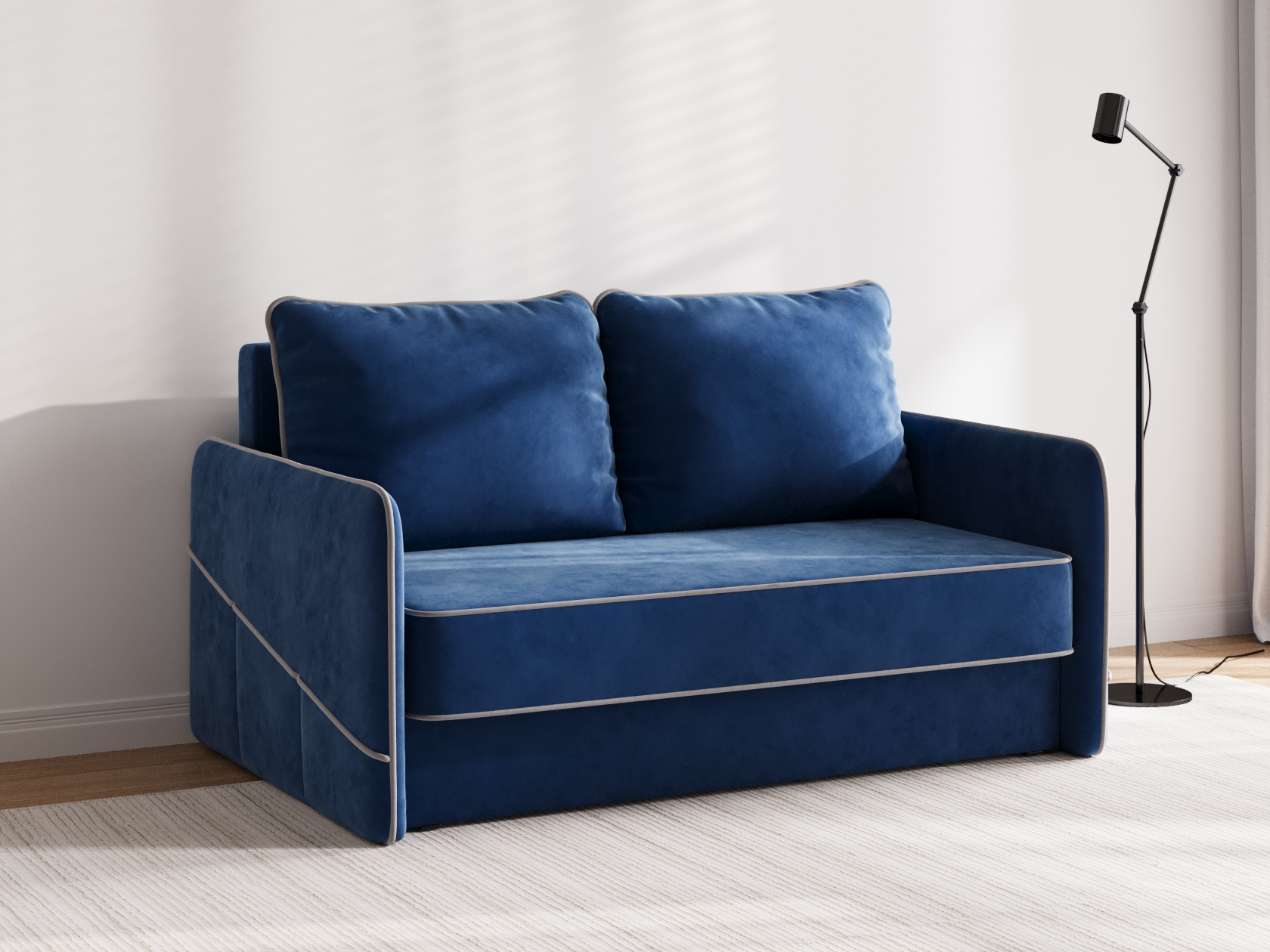 Сиденье, подлокотники и подушки украшены контрастным кантом. Такой декор подчеркивает лаконичную форму модели и выступает в роли акцента. Диван безупречно смотрится с любого ракурса, что позволяет использовать его для зонирования пространства. Ящик для белья — практичное решение для небольших помещений.