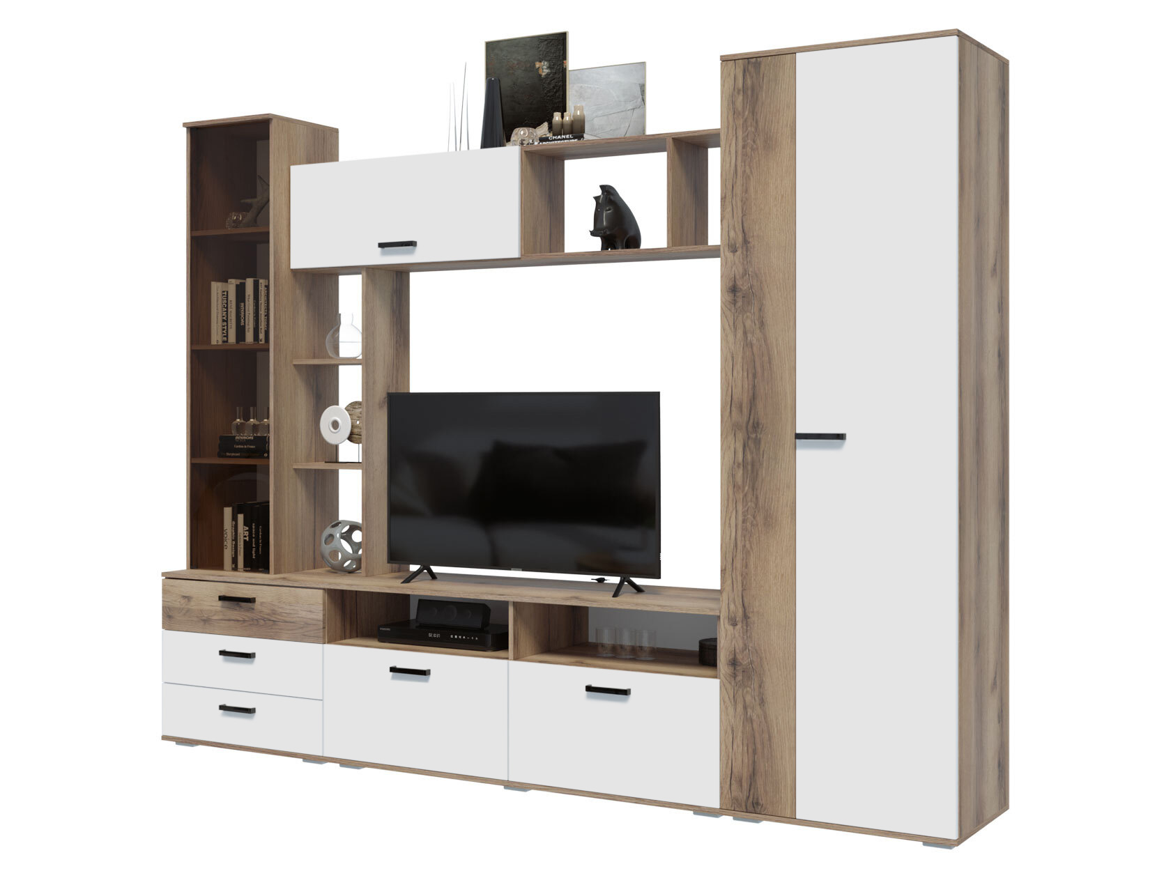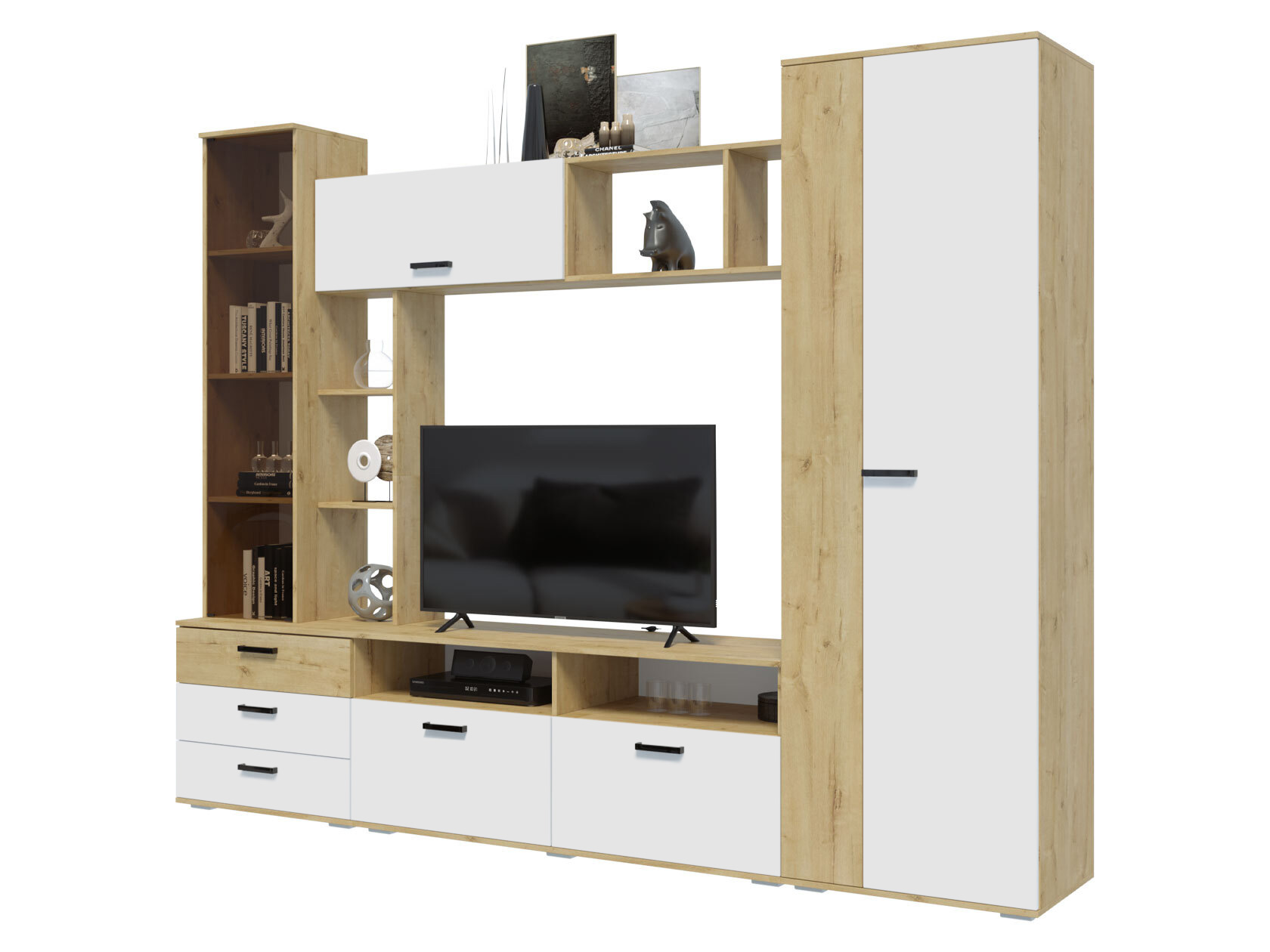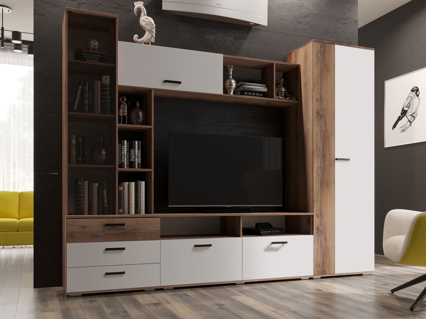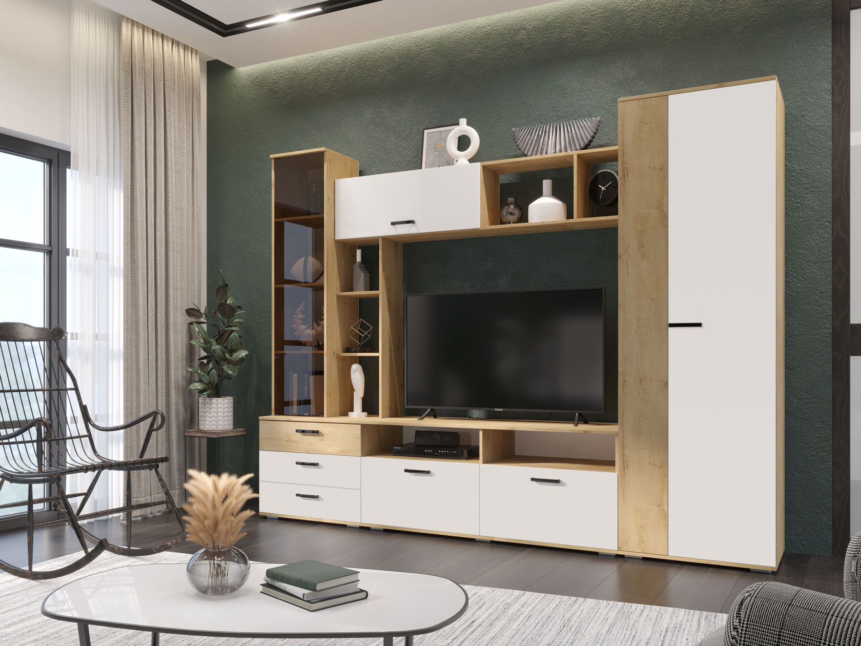 Гостиная Крокус станет отличным вариантом для обустройства ТВ-зоны и хранения всех необходимых вещей. Открытые полки позволят оживить обстановку аксессуарами, фотографиями в рамках и комнатными растениями. Стеклянная дверца откроет обзор на содержимое, защищая его от пыли и влаги. Для хранения одежды предусмотрено вместительное отделение с продольной штангой для вешалок и антресольной полкой, а также несколько закрытых отделений. Глянцевые фасады придадут интерьеру индивидуальность.