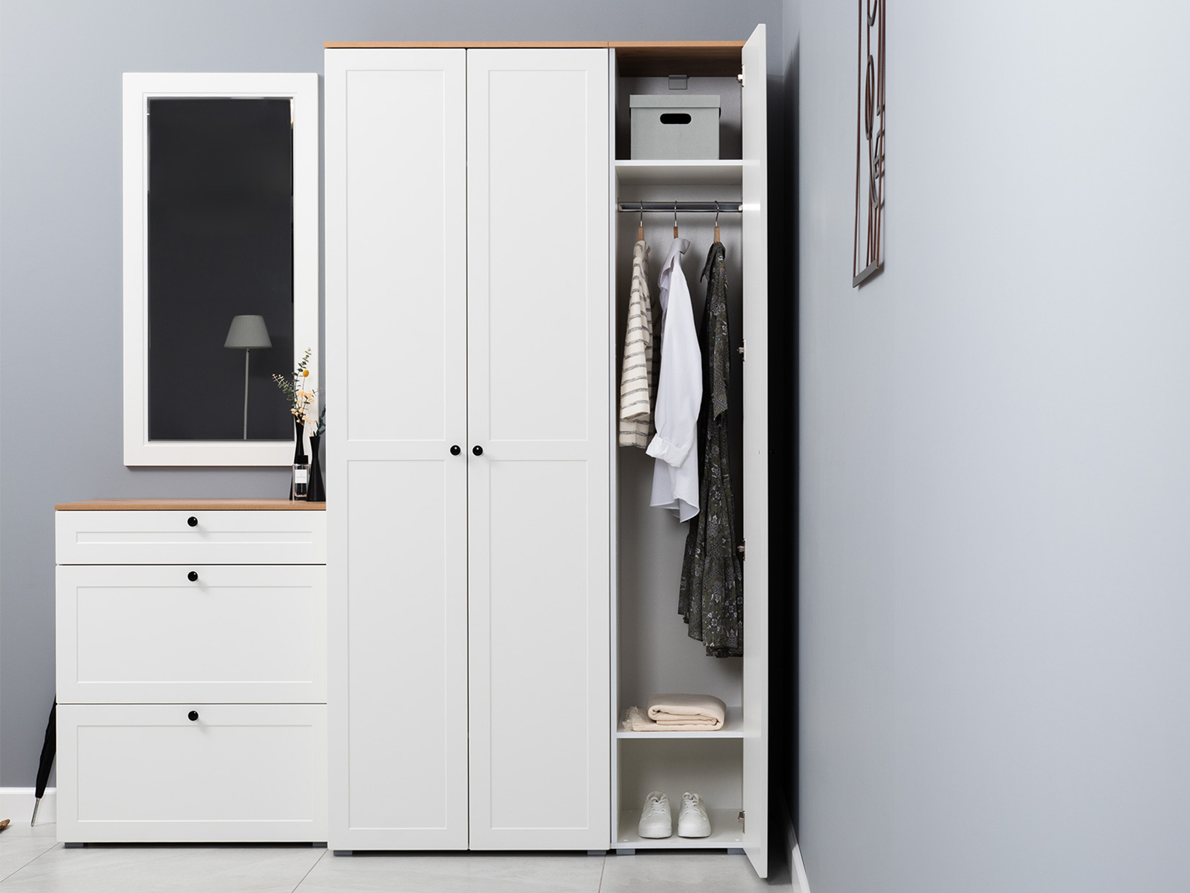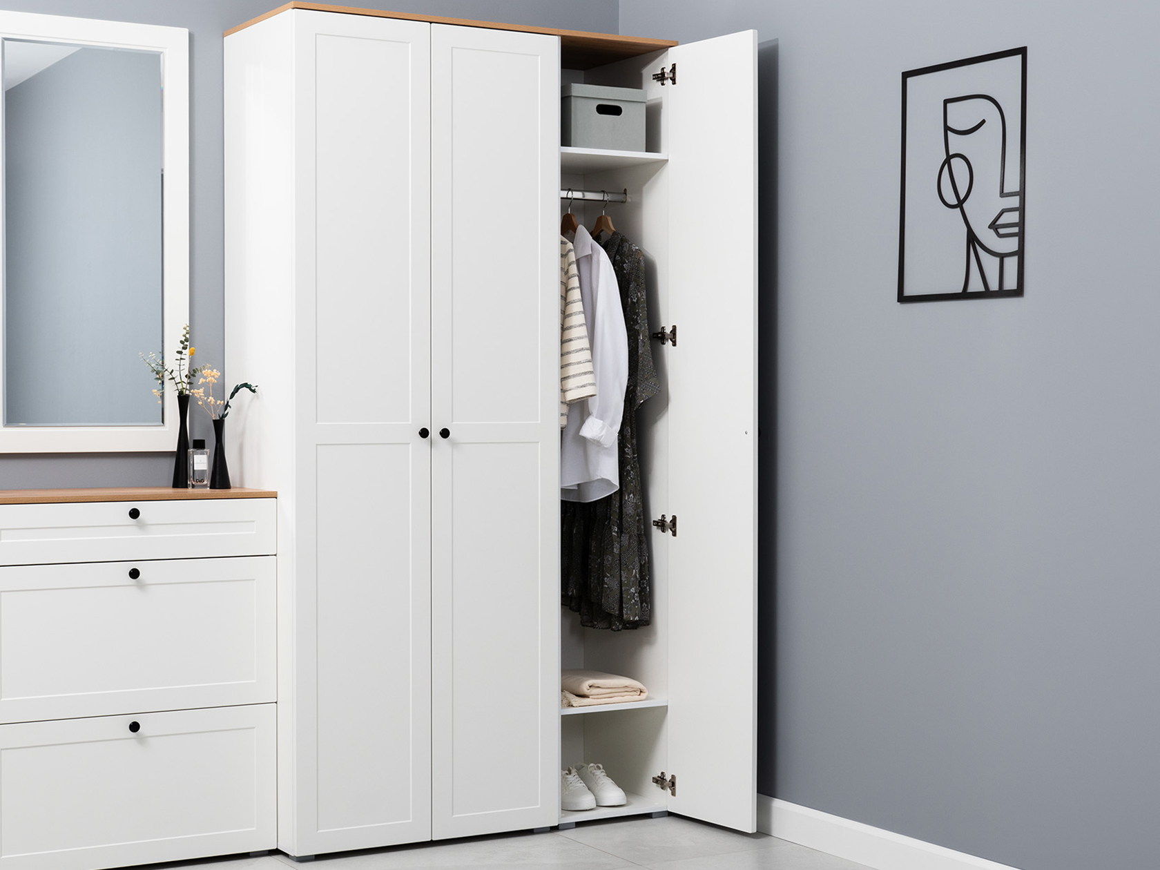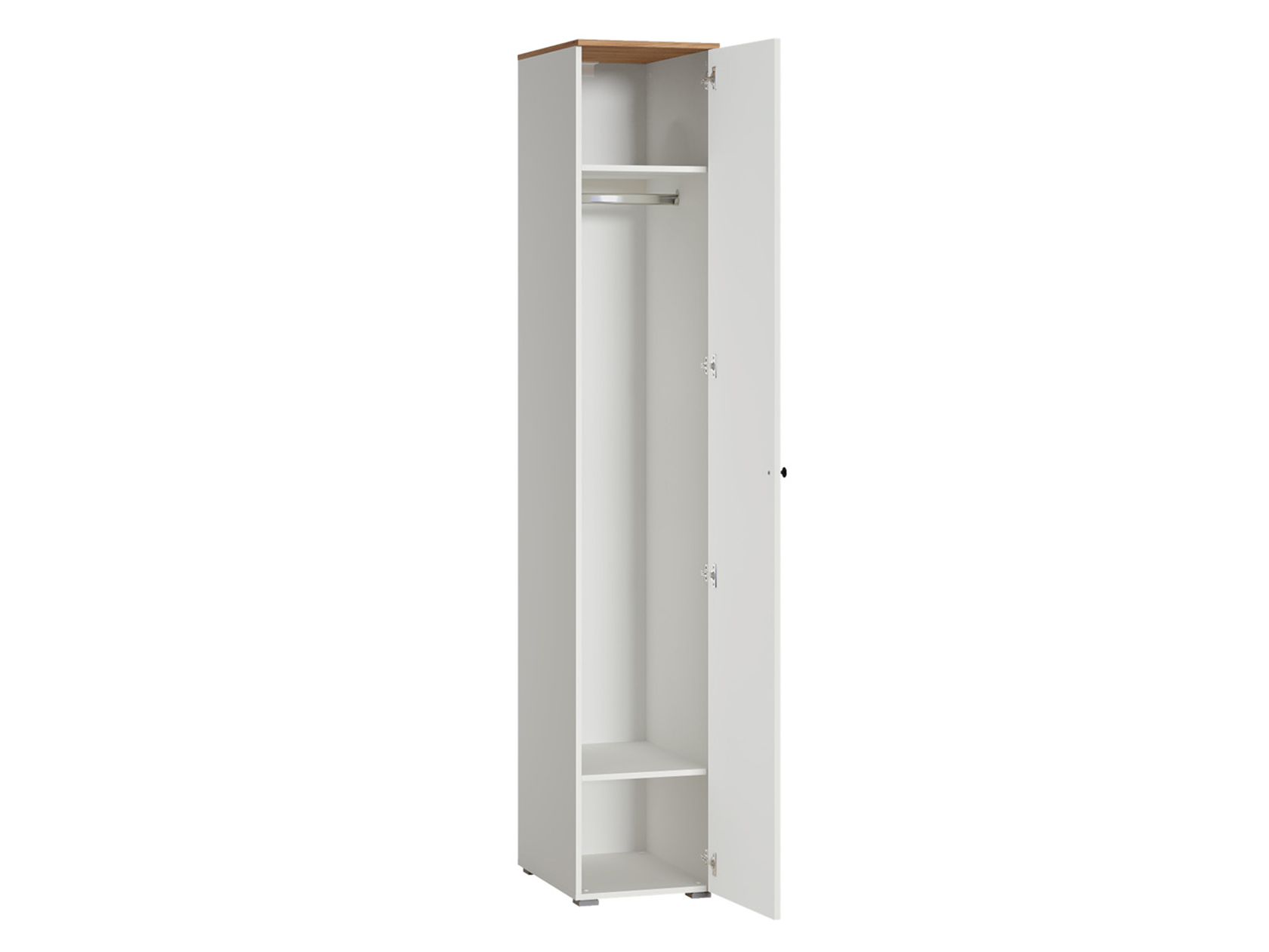 Распашной шкаф Остин станет компактным решением для упорядоченного хранения гардероба. Внутреннее наполнение предусматривает ряд полок для сложенной одежды и продольную штангу для вешалок. Опоры регулируются по высоте, что позволит разместить модель на полу с неровностями.