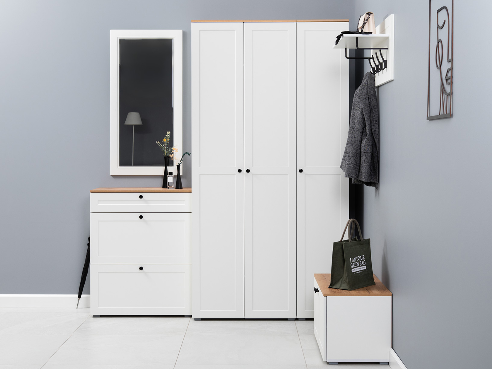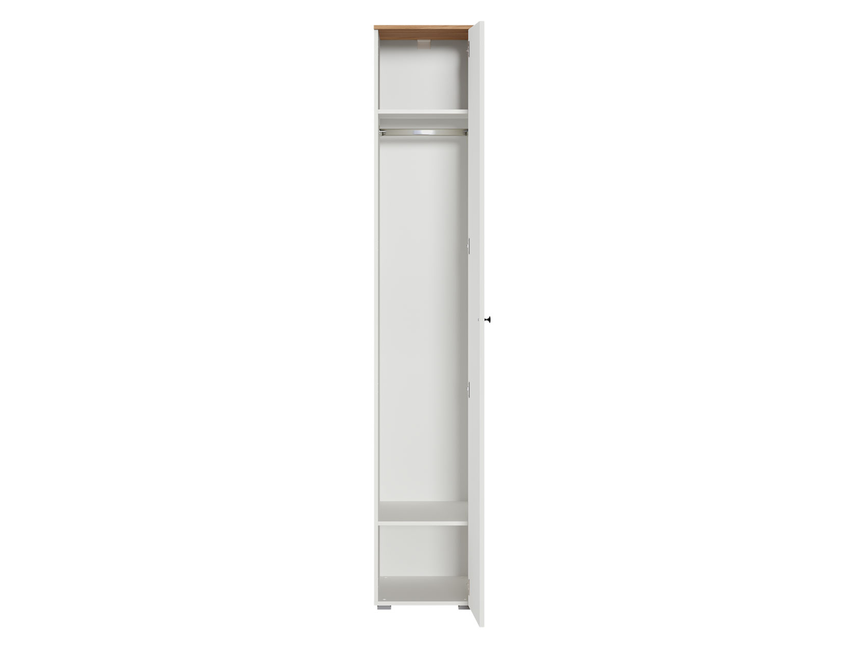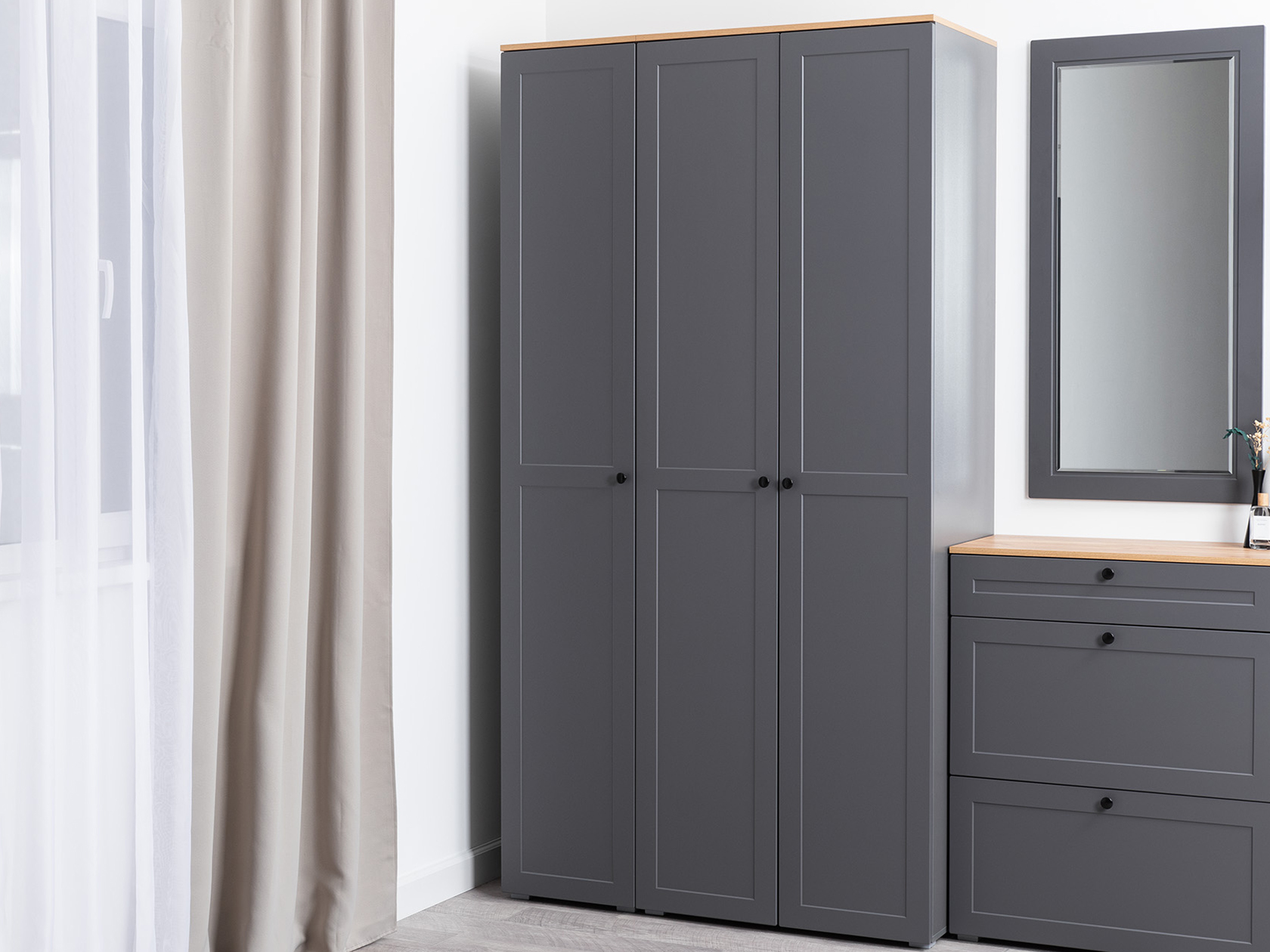 Распашной шкаф Остин станет компактным решением для упорядоченного хранения гардероба. Внутреннее наполнение предусматривает ряд полок для сложенной одежды и продольную штангу для вешалок. Опоры регулируются по высоте, что позволит разместить модель на полу с неровностями.