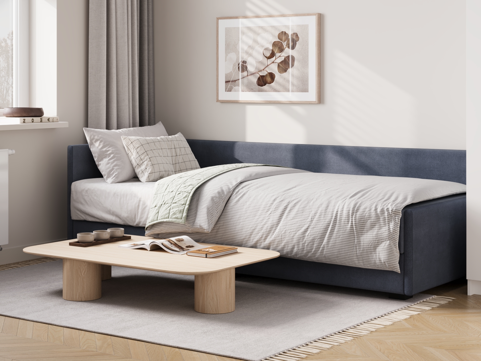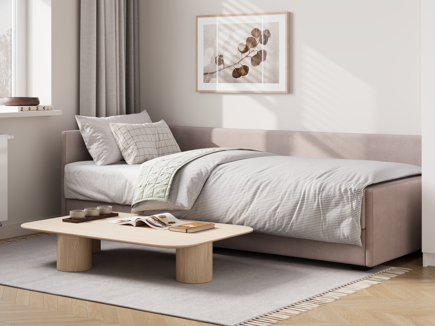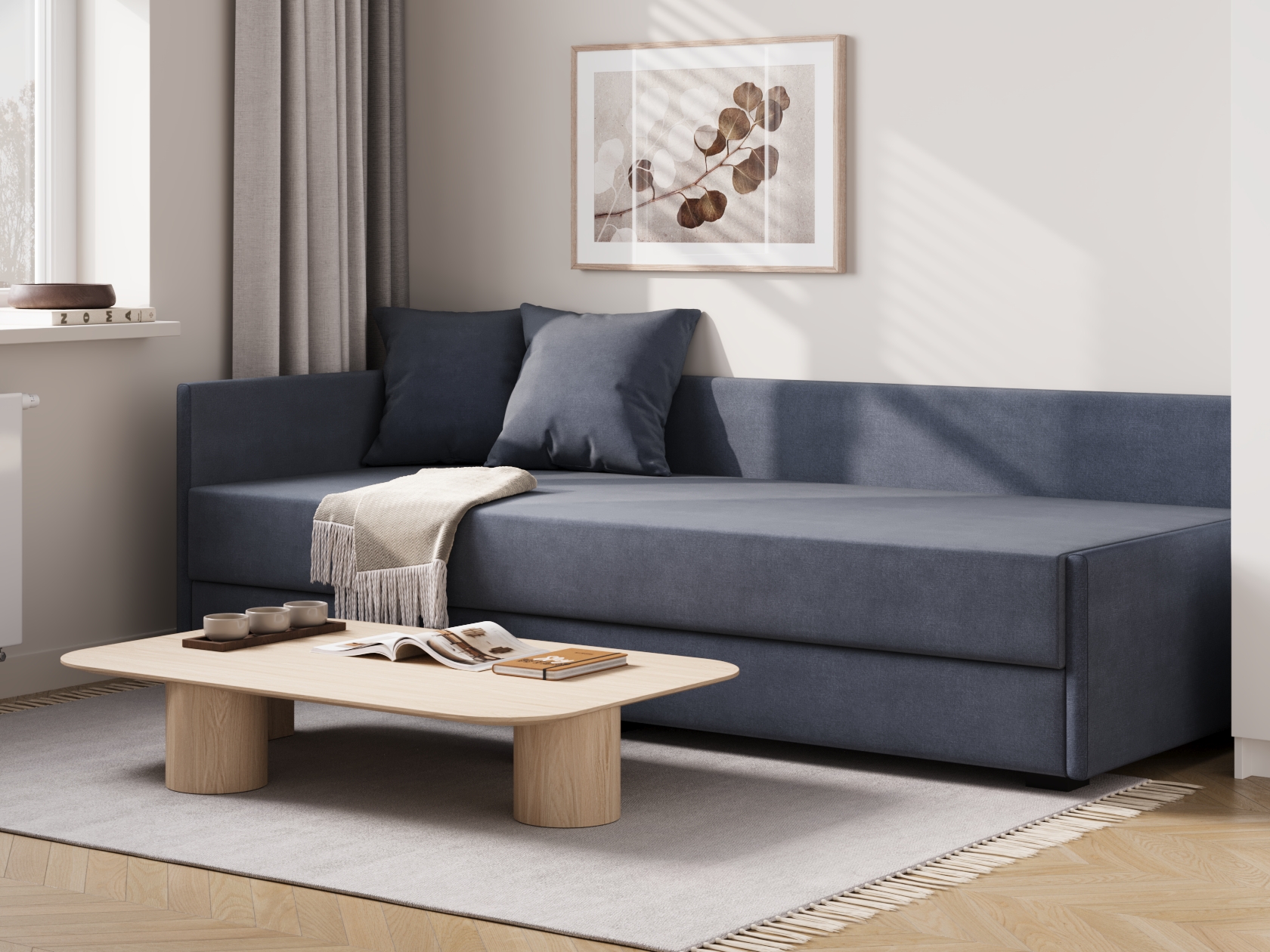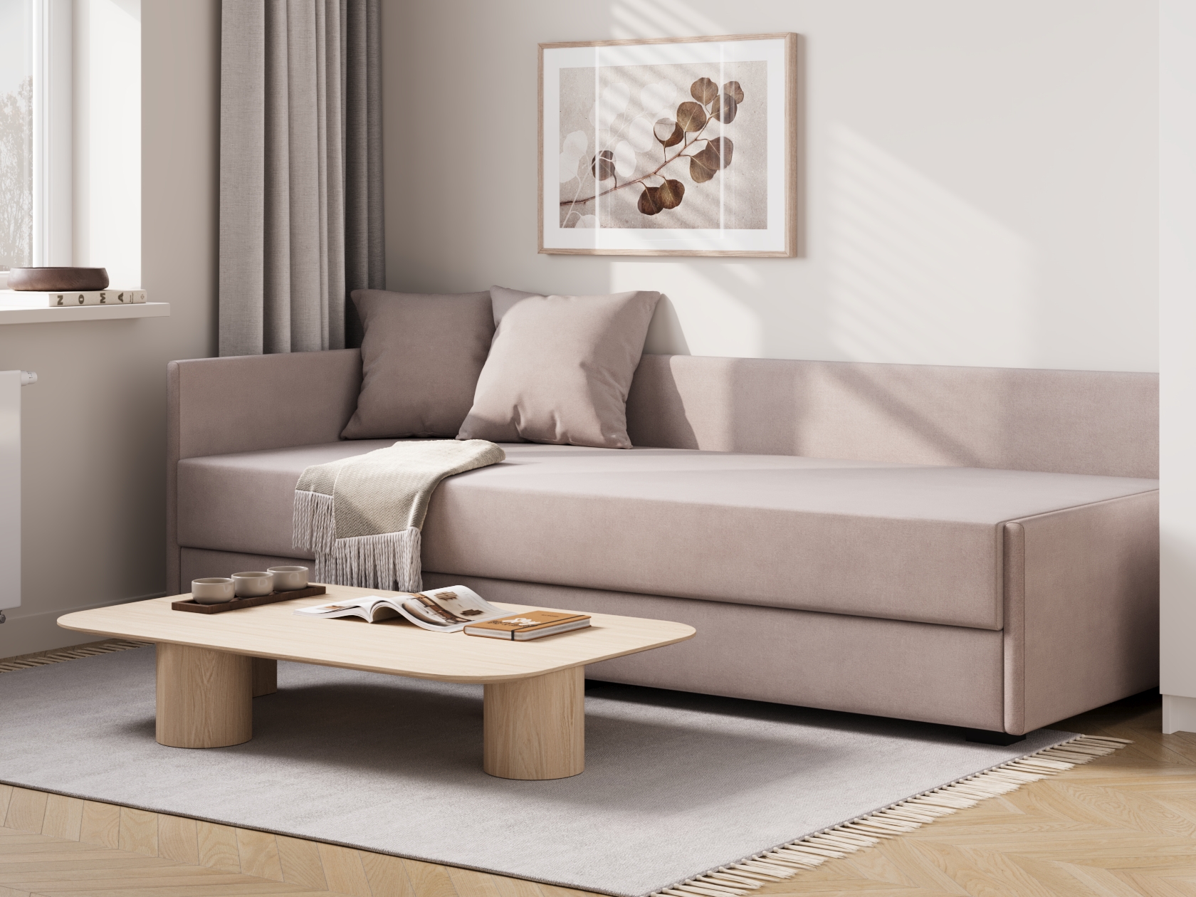 Прямой диван Нордик объединяет минималистичный внешний вид, практичность и функциональность. Сиденье с низкой спинкой и узким подлокотником дополнено двумя декоративными подушками, благодаря которым модель становится удобнее. Такой диван отлично подойдет для небольшой комнаты или студии. Ящик для хранения позволяет держать под рукой постельное белье или запасное одеяло.
