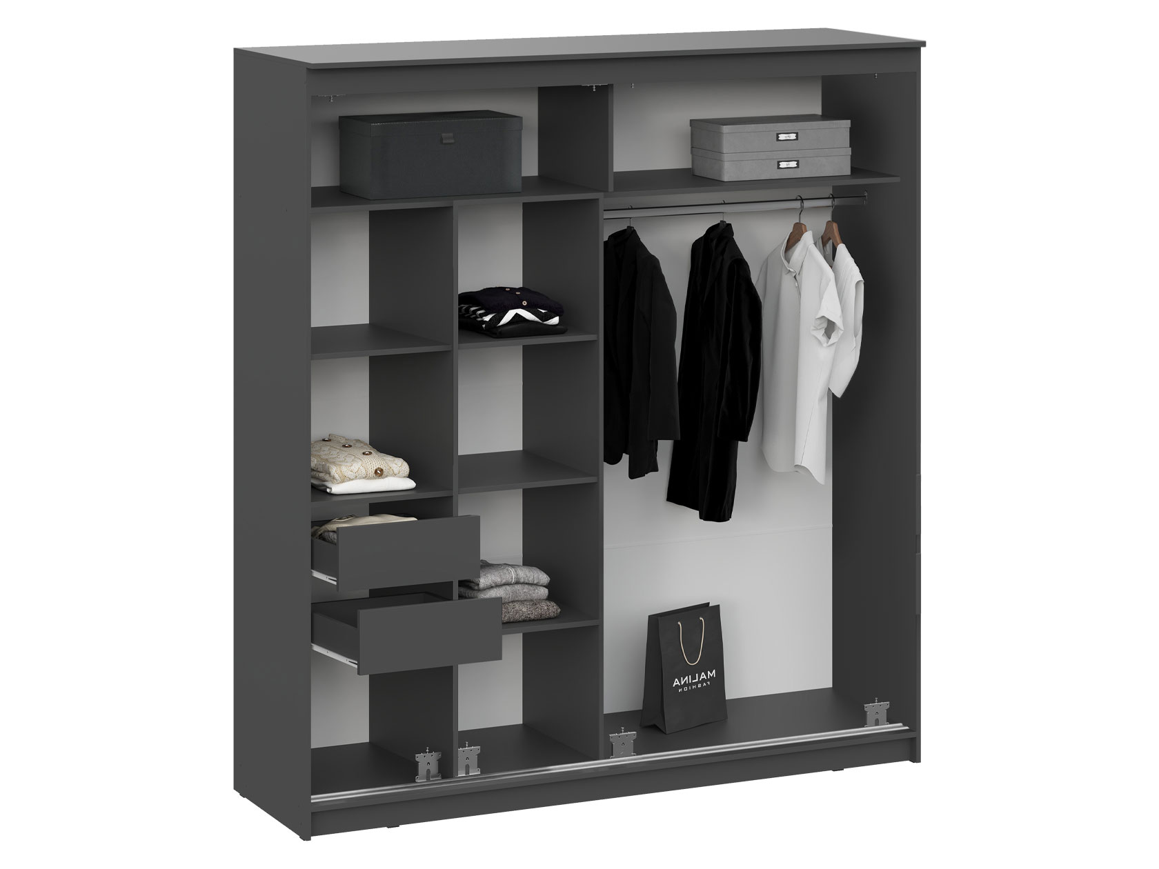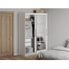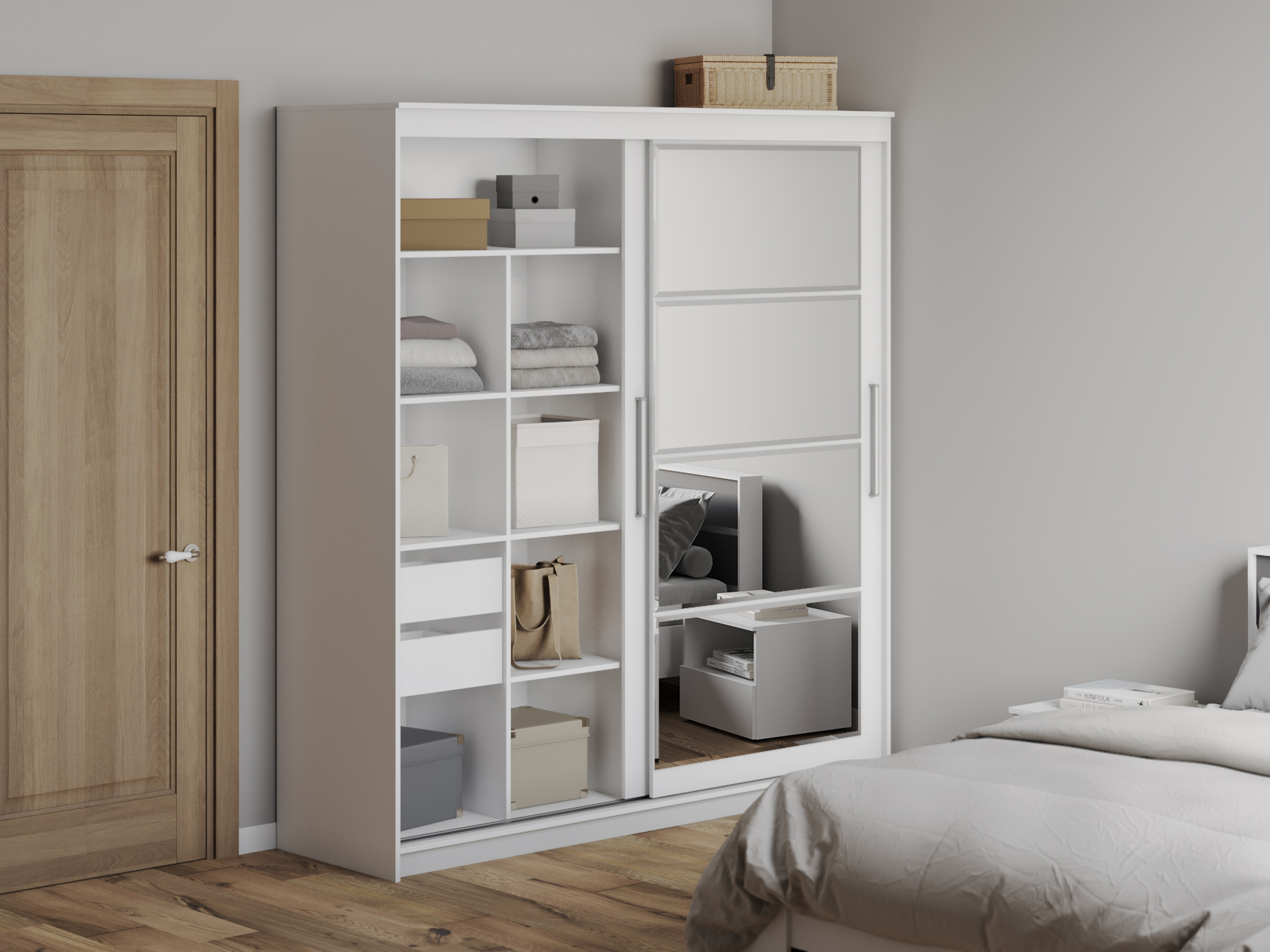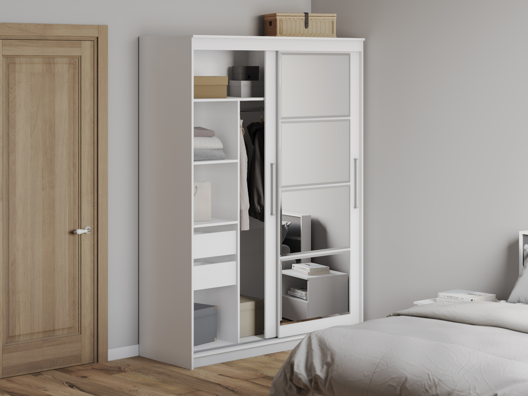 Шкаф-купе Шерри поможет эффективно организовать пространство для хранения одежды, обуви и аксессуаров, а также станет гармоничным дополнением современного интерьера. Внутреннее наполнение шкафа поделено на два равных по размеру отделения, одно из которых оснащено полками и двумя выкатными ящиками, а другое — продольной штангой для вешалок. Правый фасад дополнен зеркальным полотном в полный рост, которое позволит детально оценить подобранный образ и сделает помещение визуально просторнее.