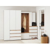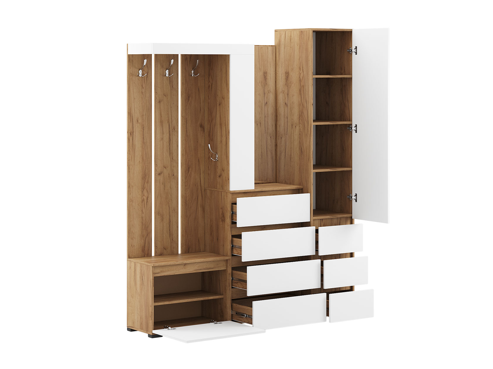 Прихожая Хелен — стильный и практичный модуль, в котором продумана каждая деталь. Рядом с зеркалом расположены полочки для косметики, парфюма и аксессуаров, а в ящиках есть место для шарфов, перчаток и ключей. Панель с крючками для верхней одежды дополнена обувницей. Плавный ход ящиков делает прихожую еще удобнее.