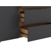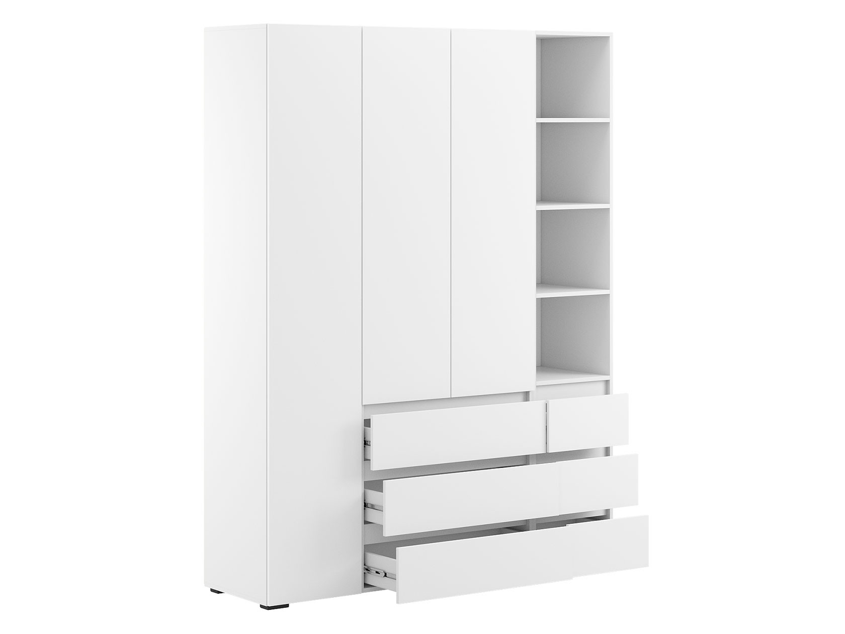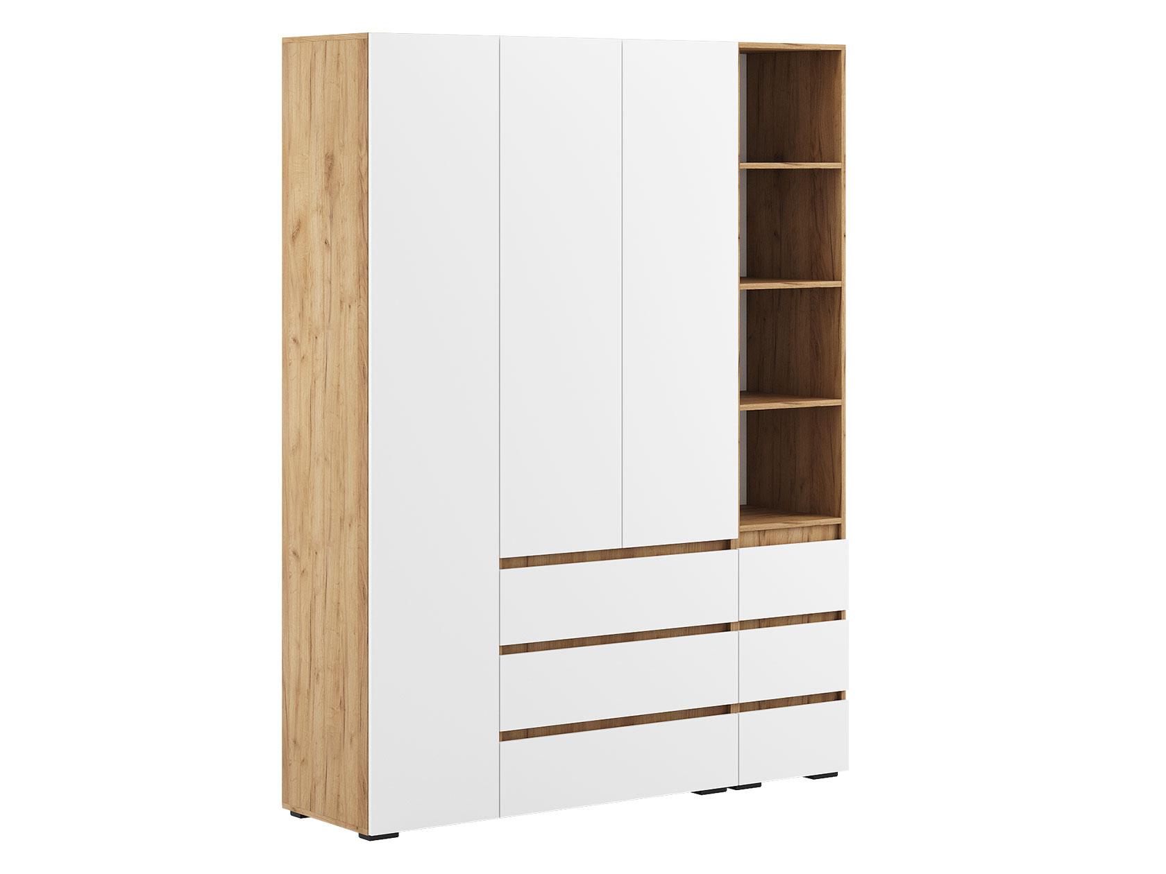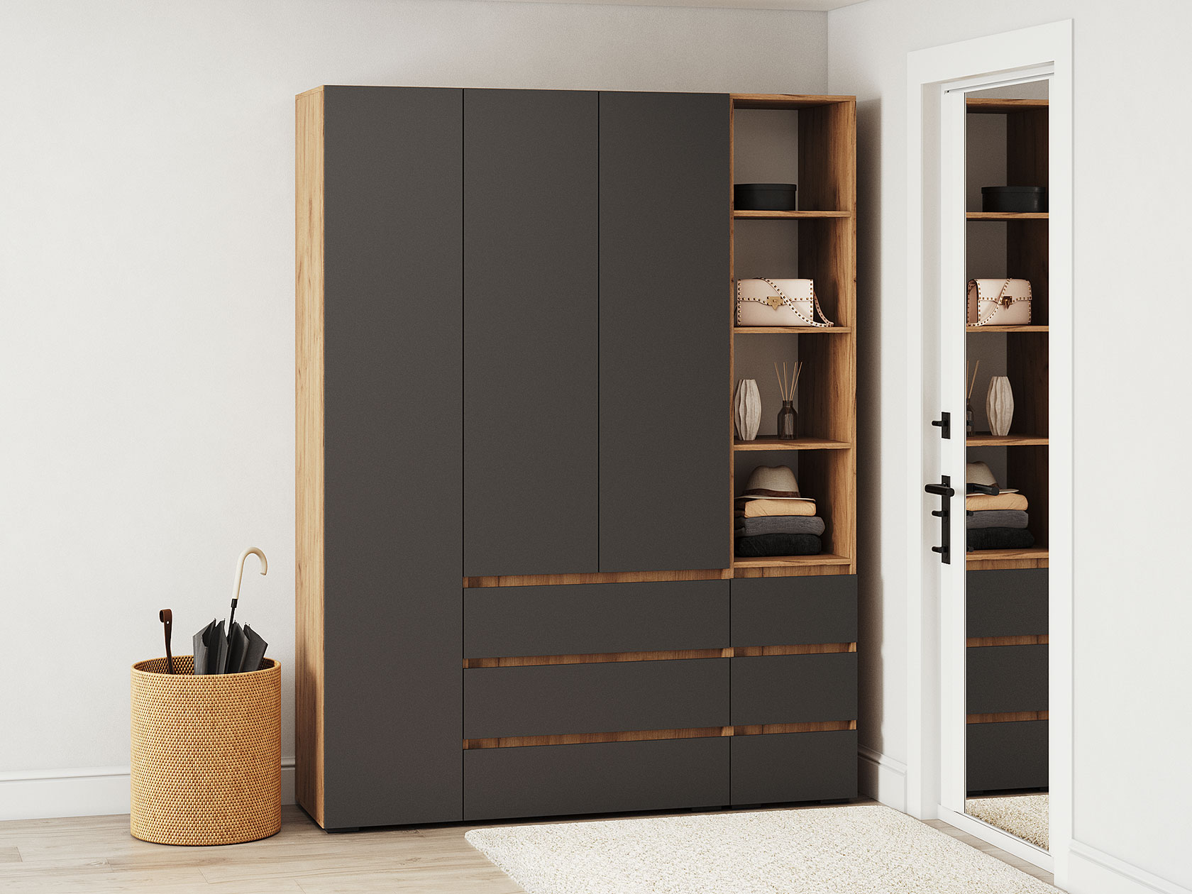 Внутреннее наполнение распашного шкафа Хелен оптимально для хранения гардероба. Ниша со штангой дополнена полками для сложенных вещей, а также ящиками для белья и аксессуаров.