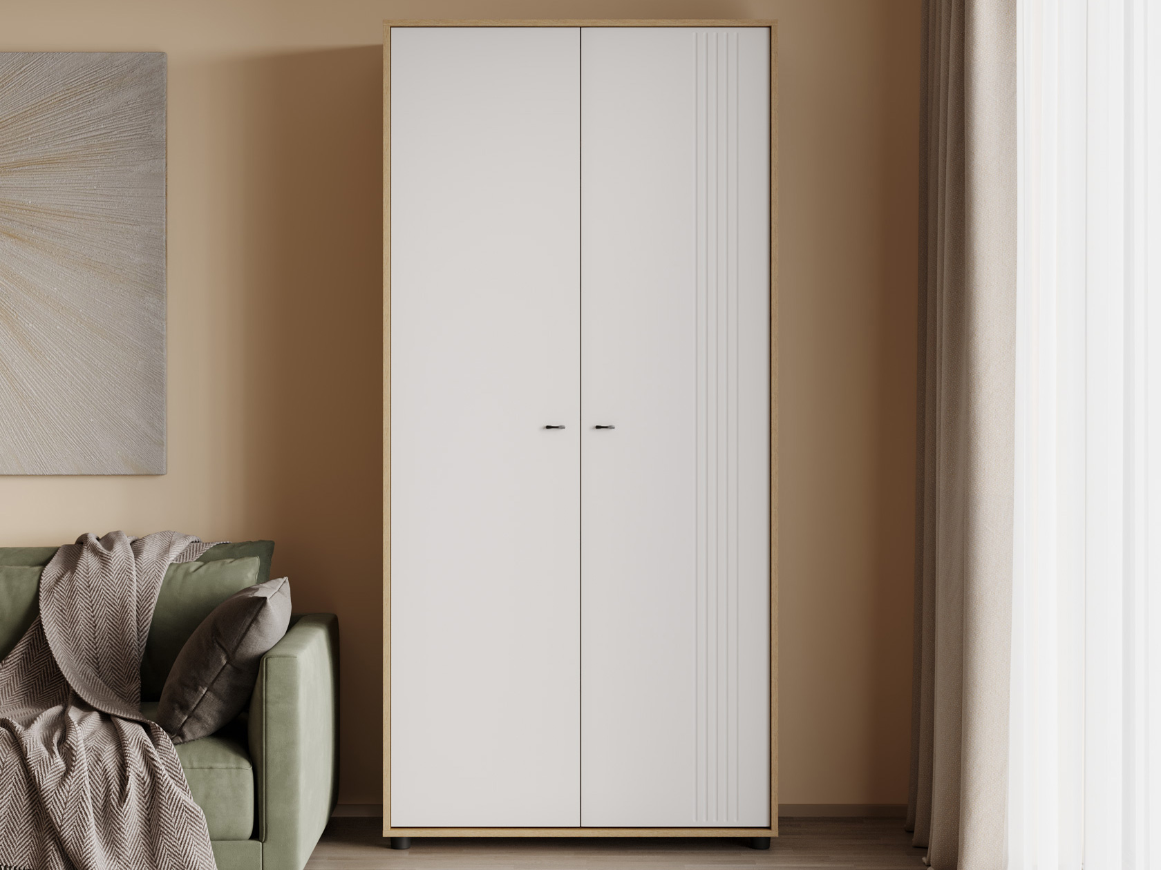Распашной шкаф Милан — модель с оптимальными габаритами и удобным наполнением. Вертикальная фрезеровка подчеркивает матовую текстуру фасадов и выступает в роли лаконичного акцента.