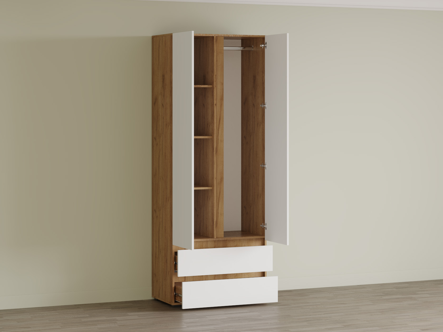 Внутреннее наполнение распашного шкафа Хелен оптимально для хранения гардероба. Ниша со штангой дополнена полками для сложенных вещей, а также ящиками для белья и аксессуаров.
