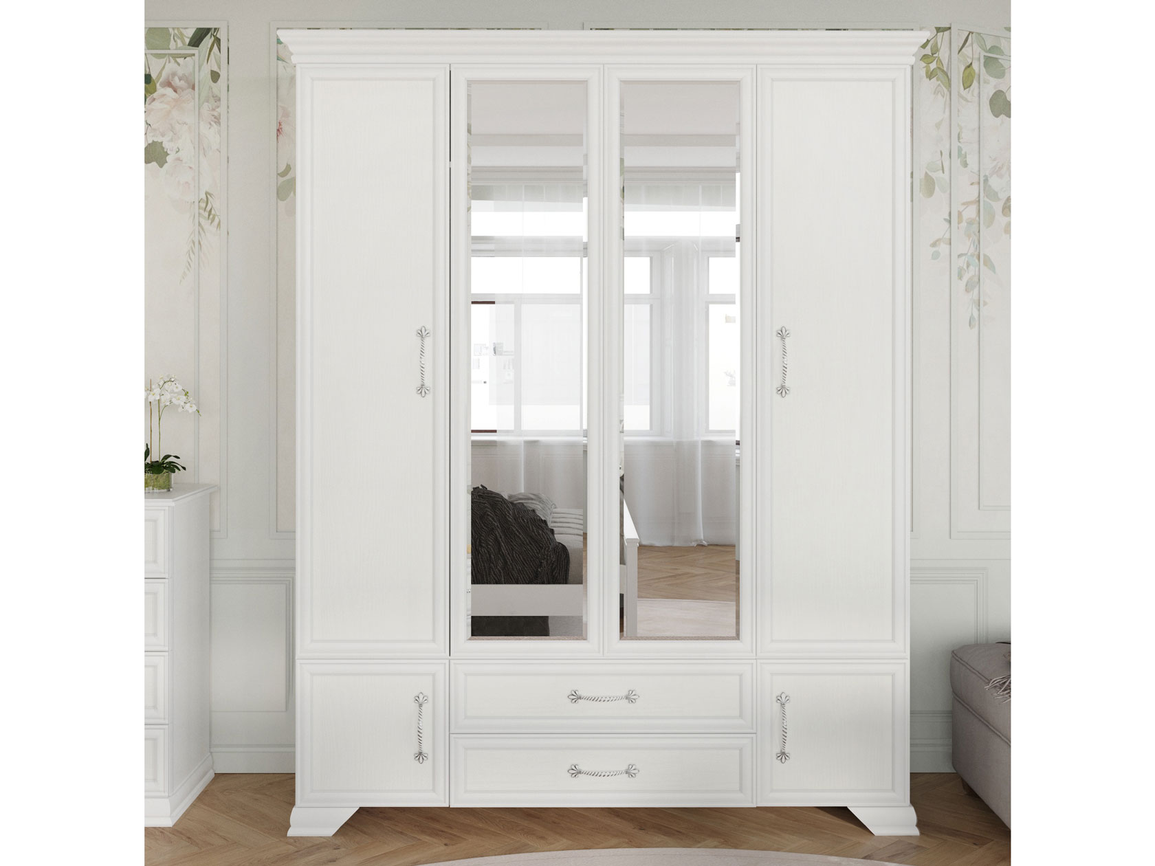 Распашной шкаф Азалия поможет удобно разместить большое количество предметов гардероба и других нужных вещей. Классический силуэт модели подчеркивают рамочные фасады с ажурными ручками, а также изящные опоры и карниз. Шкаф привлекает внимание в любом интерьере и делает обстановку более утонченной и аристократичной.