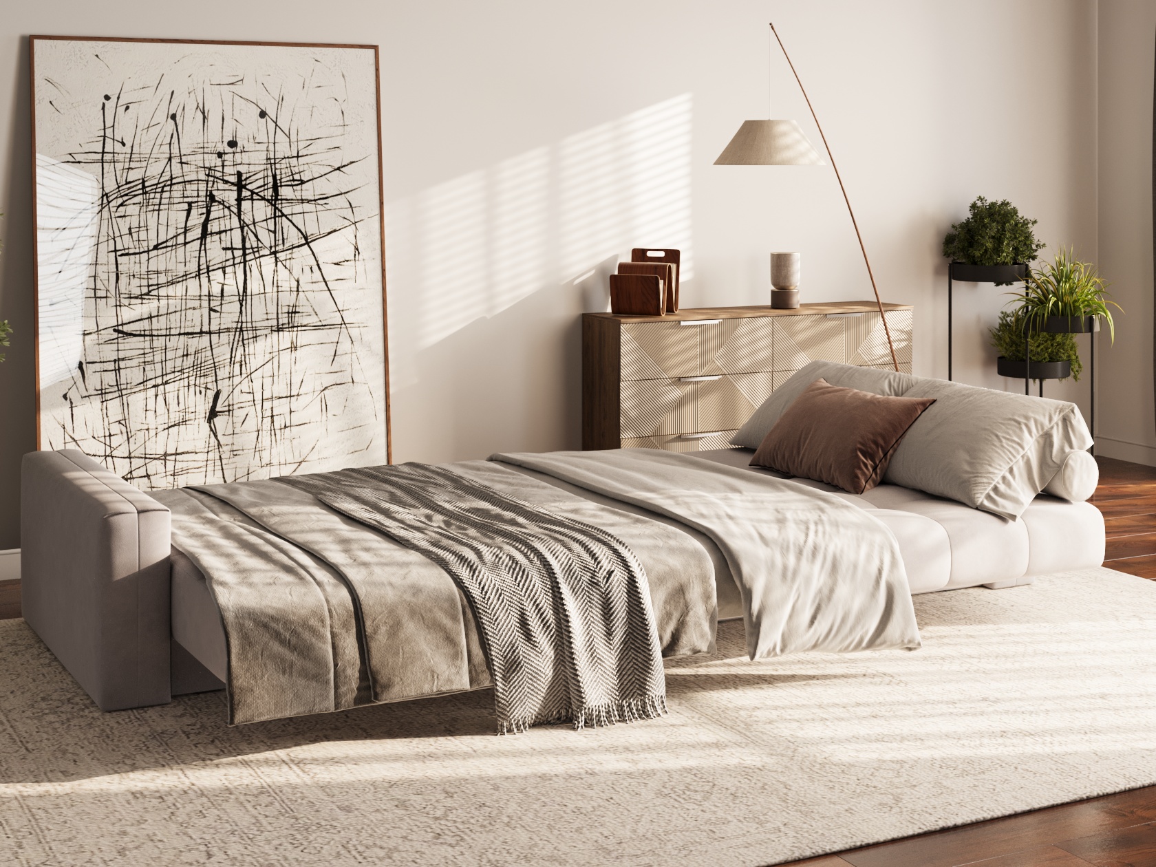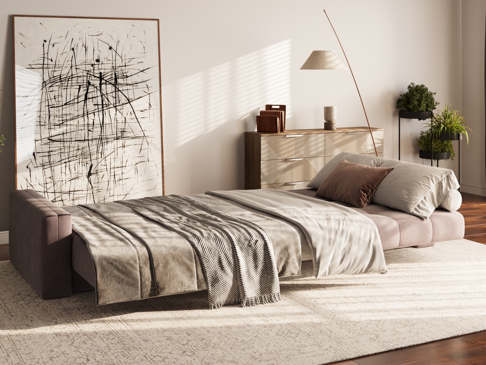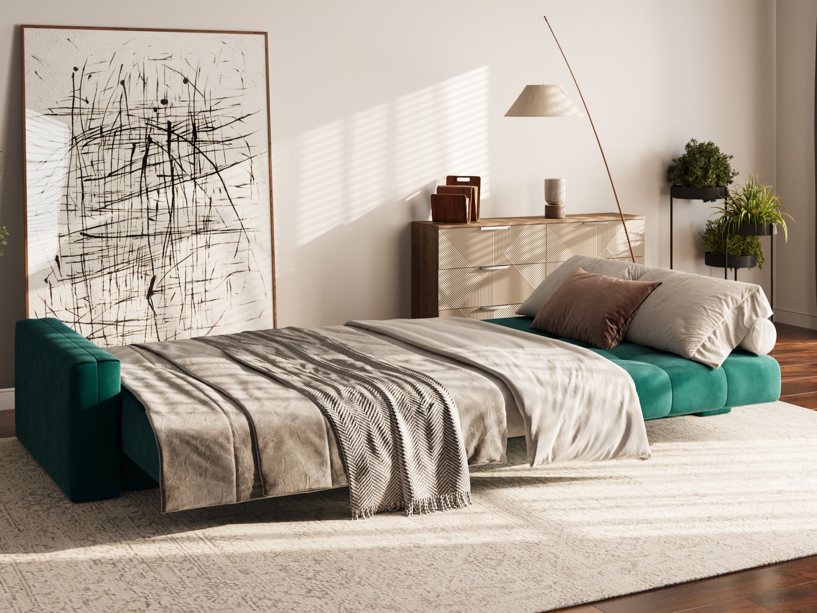 Надежный механизм трансформации легко превращает диван в ровное спальное место. Благодаря продуманному наполнению его можно использовать для ежедневного сна. Модель комплектуется вместительным коробом для хранения постельных принадлежностей.
