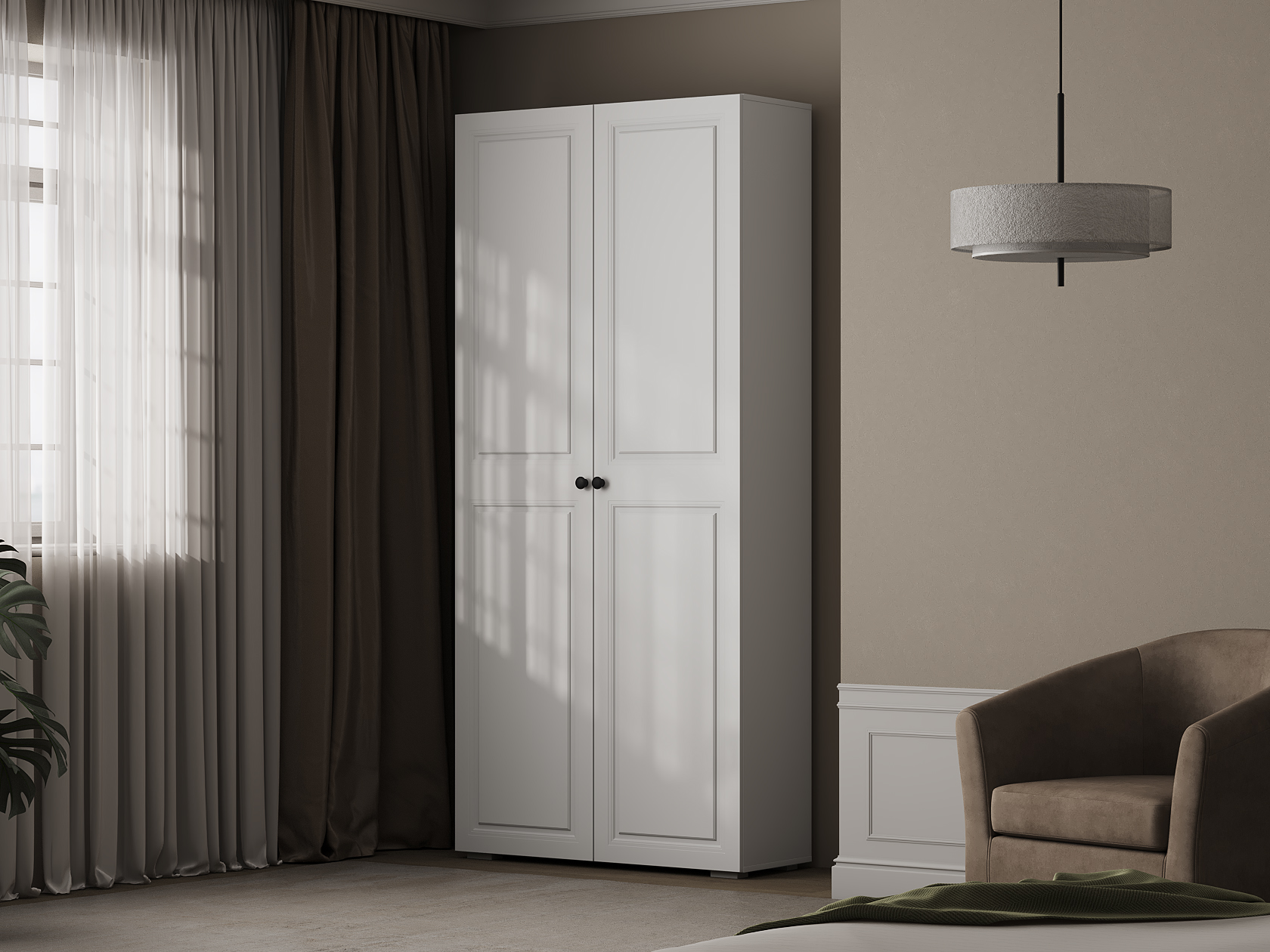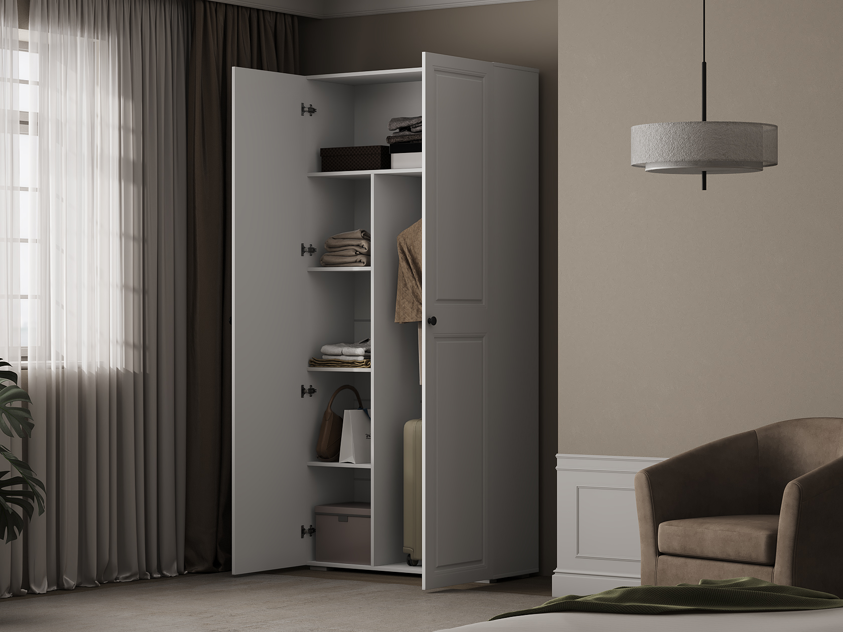 Распашной шкаф Северина не занимает много места, при этом организует удобное место для хранения гардероба. Небольшая глубина позволяет установить модель даже в тесной прихожей или малогабаритной комнате. Внутреннее наполнение представлено полками и нишей с выдвижной штангой.