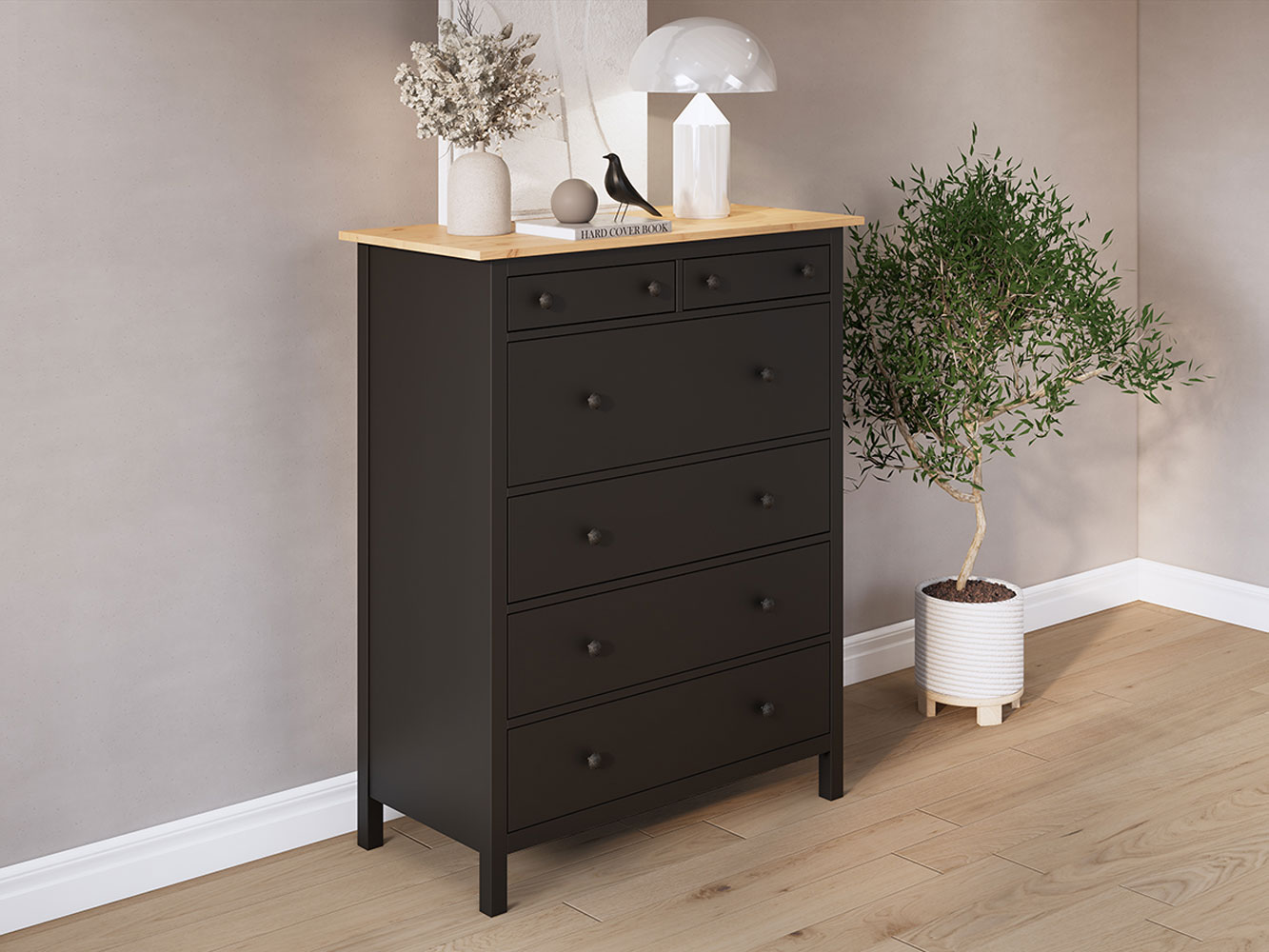 Комод Кымор не занимает много пространства, при этом вмещает большое количество вещей. Наполнение представляет собой удобную систему хранения с разными по размеру ящиками. В таком комоде можно держать как небольшие аксессуары и мелочи, так и объемную одежду, текстиль или игрушки.