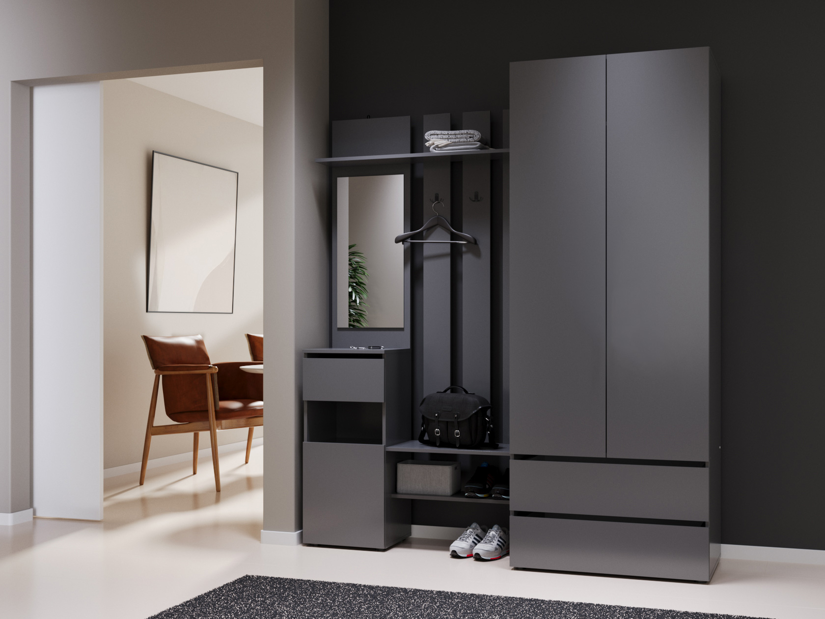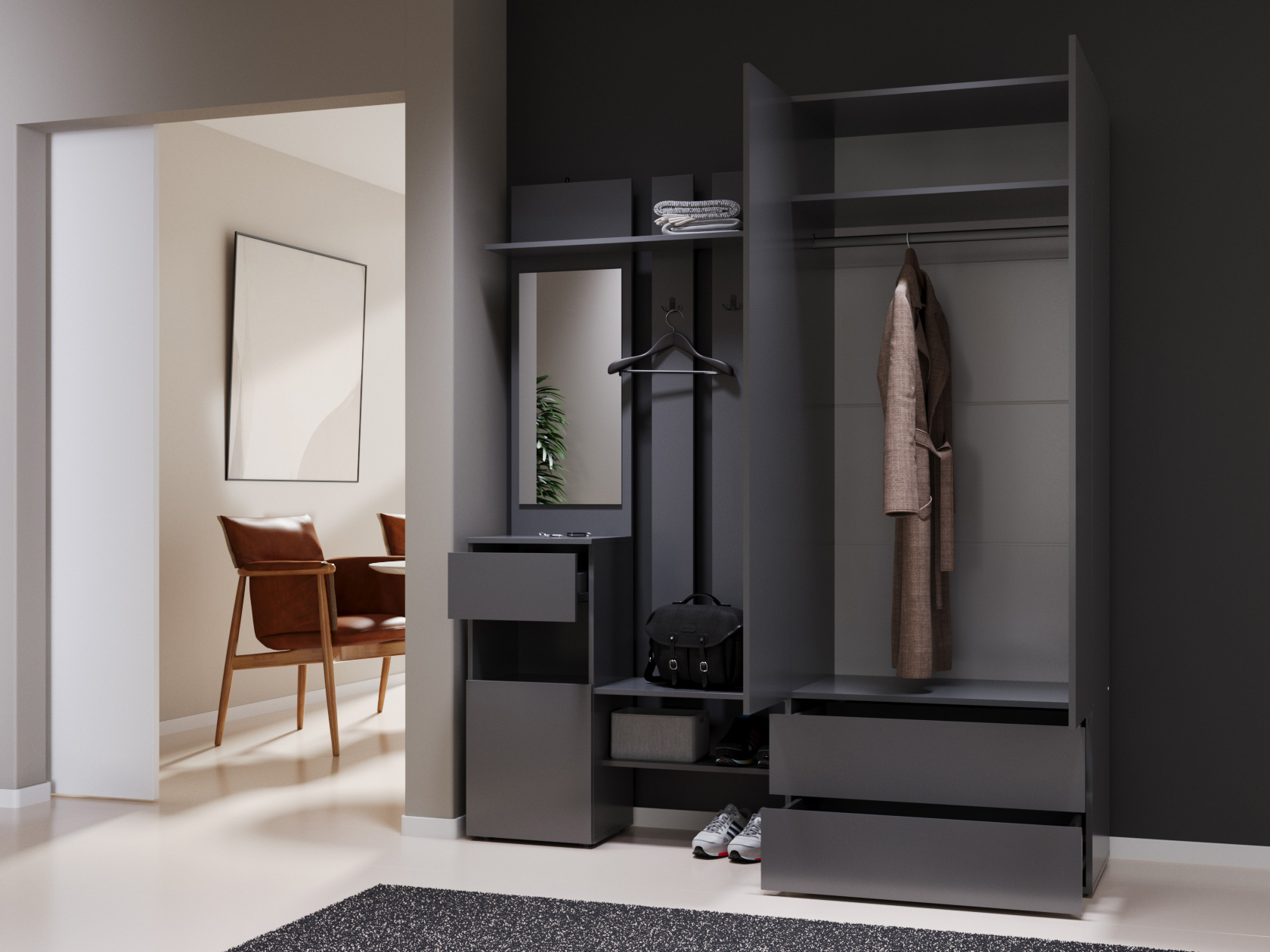 Прихожая Диксон объединила функциональные элементы с удобным и продуманным наполнением. На полках, нишах и в ящиках найдется место для всех необходимых вещей: от верхней одежды до связки запасных ключей. Минималистичное оформление смотрится очень актуально и удачно сочетается с разными интерьерными решениями.