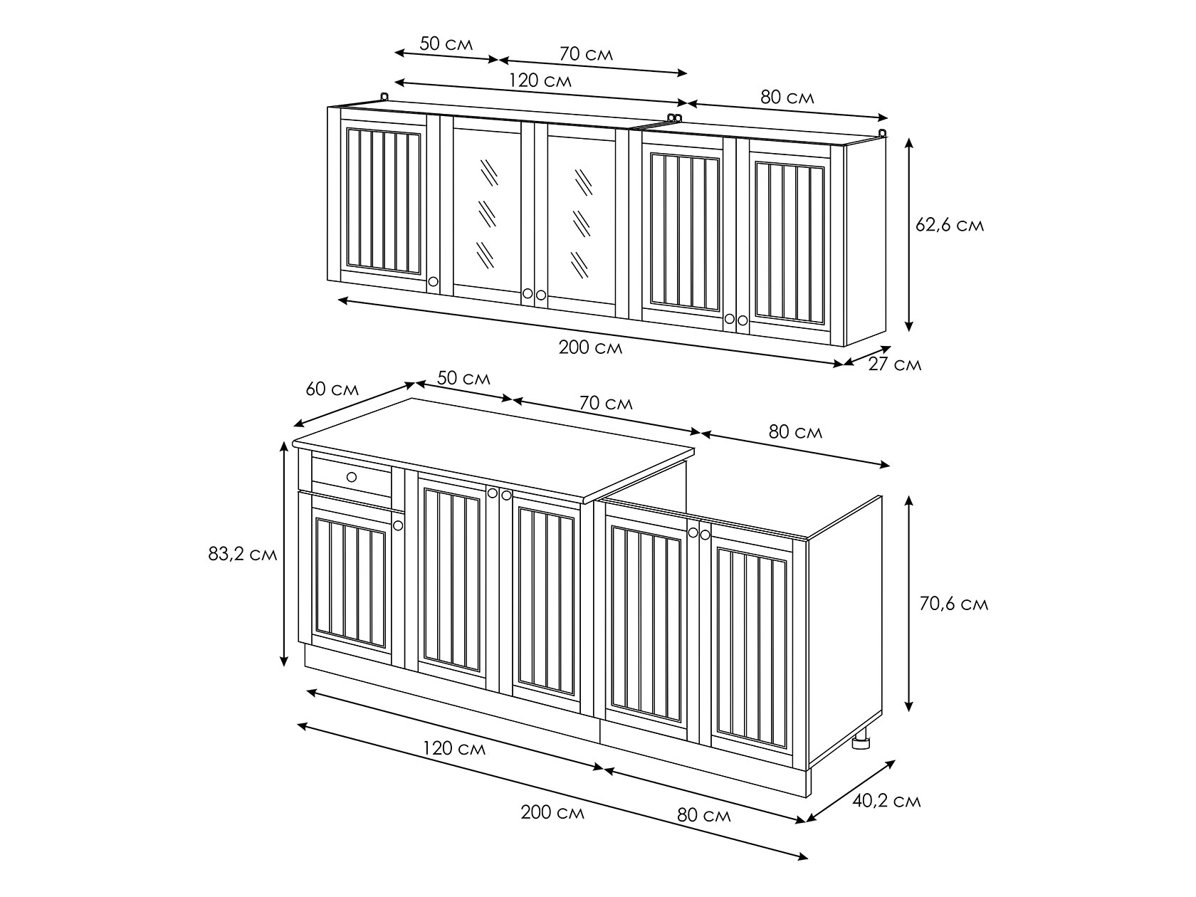 Глубина нижних шкафов: чистая — 40 см, с дверцами — 42 см.