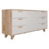 Комод Ньерд позволяет удобно хранить различные предметы: одежду, белье, аксессуары и важные мелочи. Выдвижные ящики обеспечивают быстрый доступ к содержимому. Древесная текстура, фасады с необычной фрезеровкой и акцентные ножки создают атмосферу уюта и тепла.