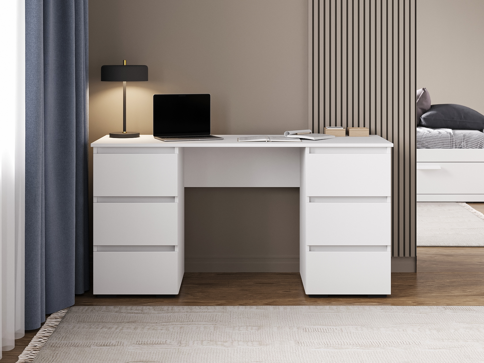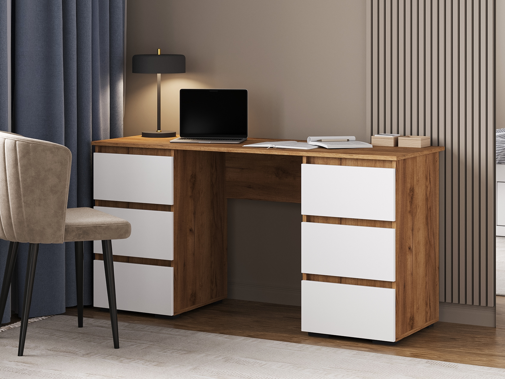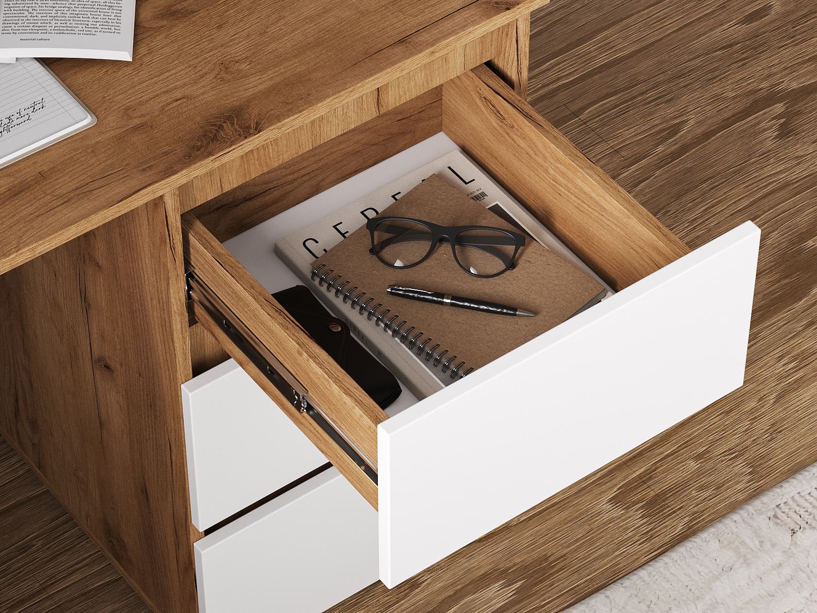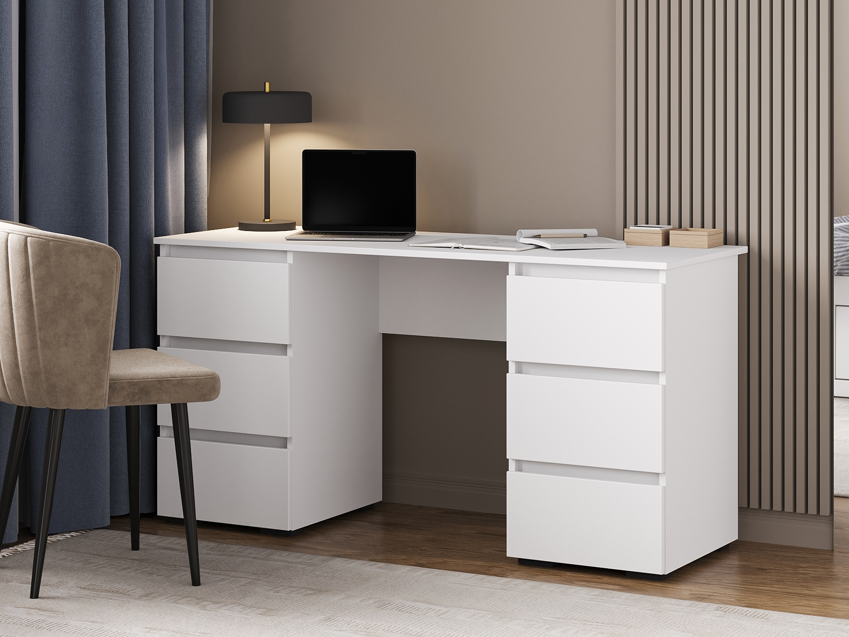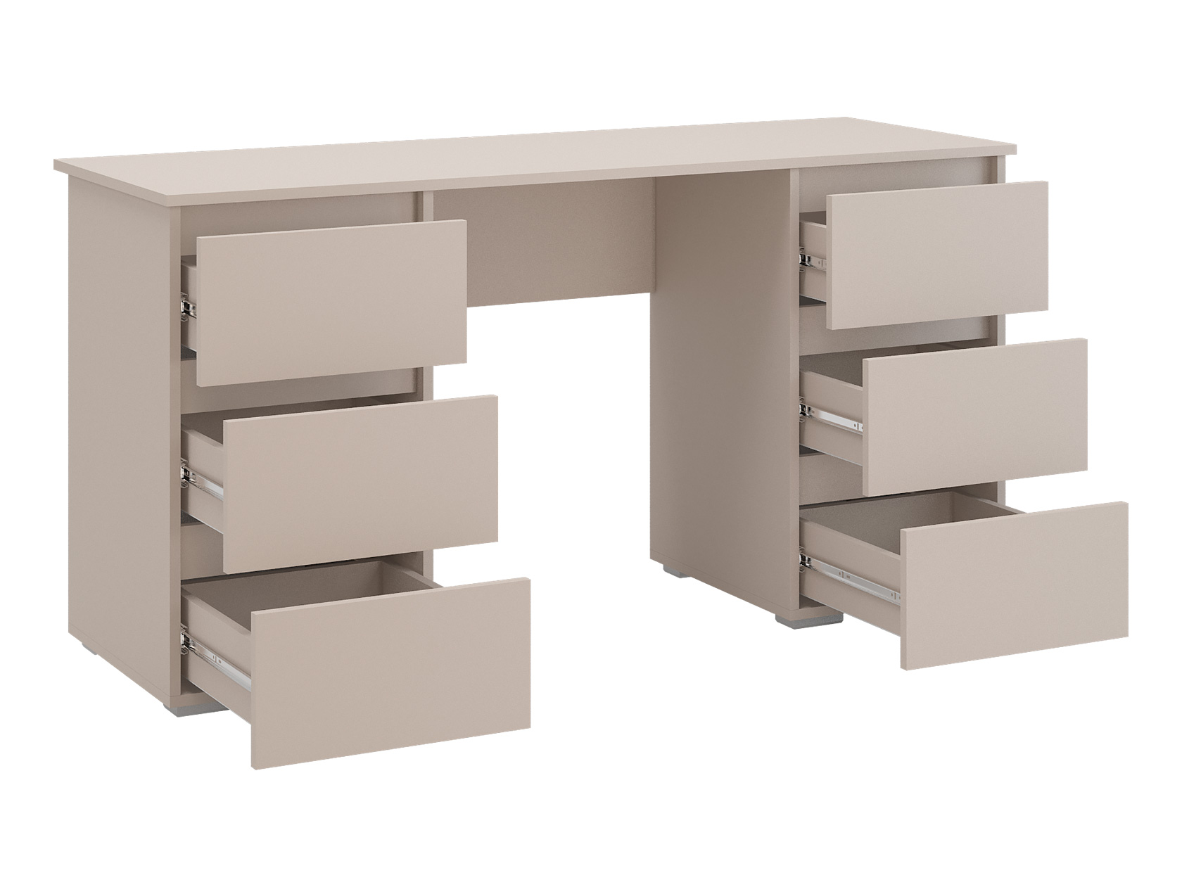 Компьютерный стол Элли сочетает функциональность и лаконичный дизайн без лишних деталей. Под просторной столешницей расположены выдвижные ящики, где удобно хранить канцелярские принадлежности и другие необходимые вещи, что позволяет поддерживать порядок на основной поверхности и обеспечивает быстрый доступ к содержимому.