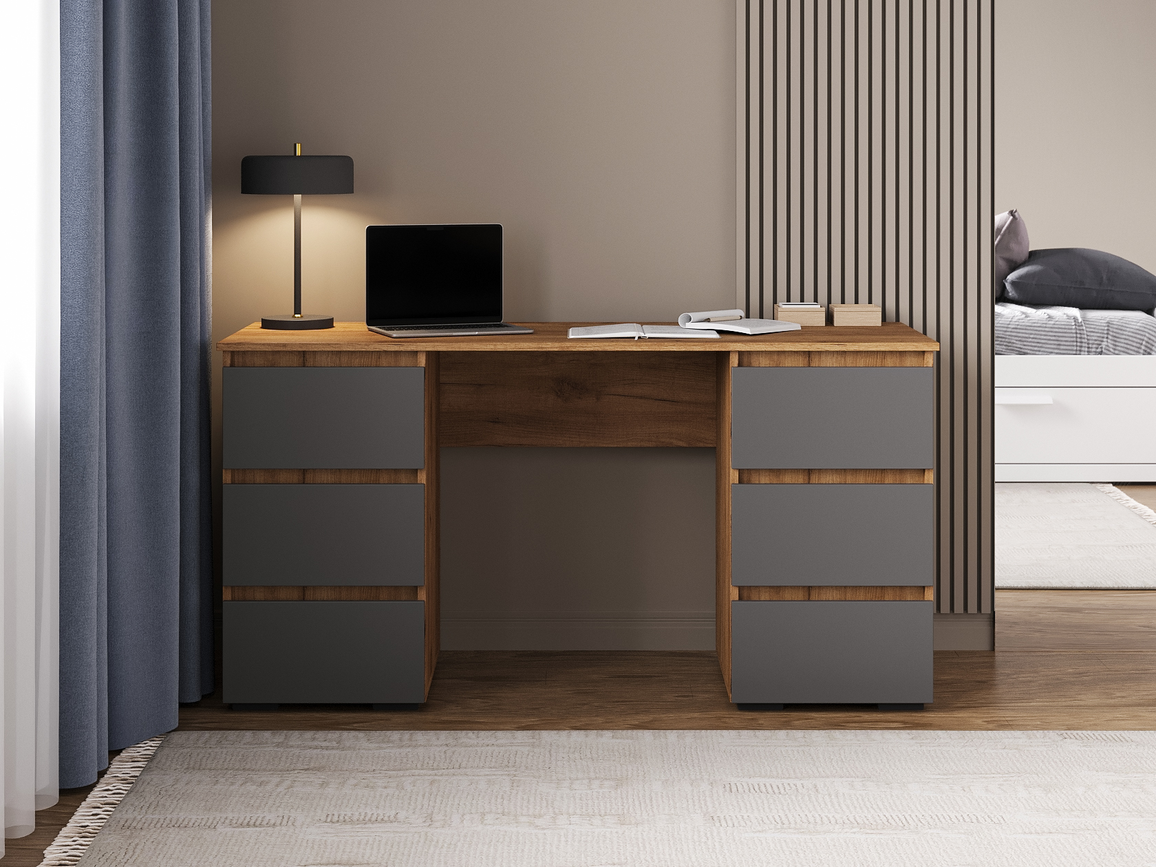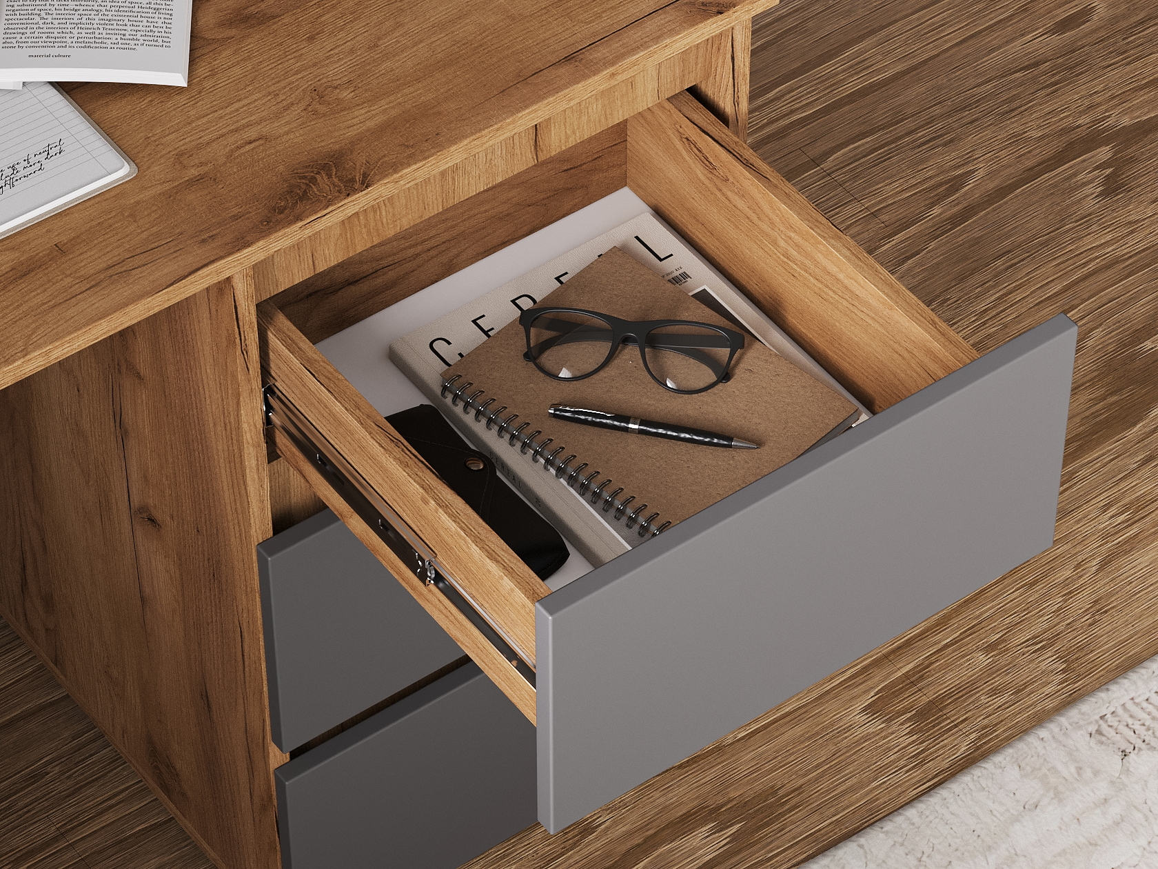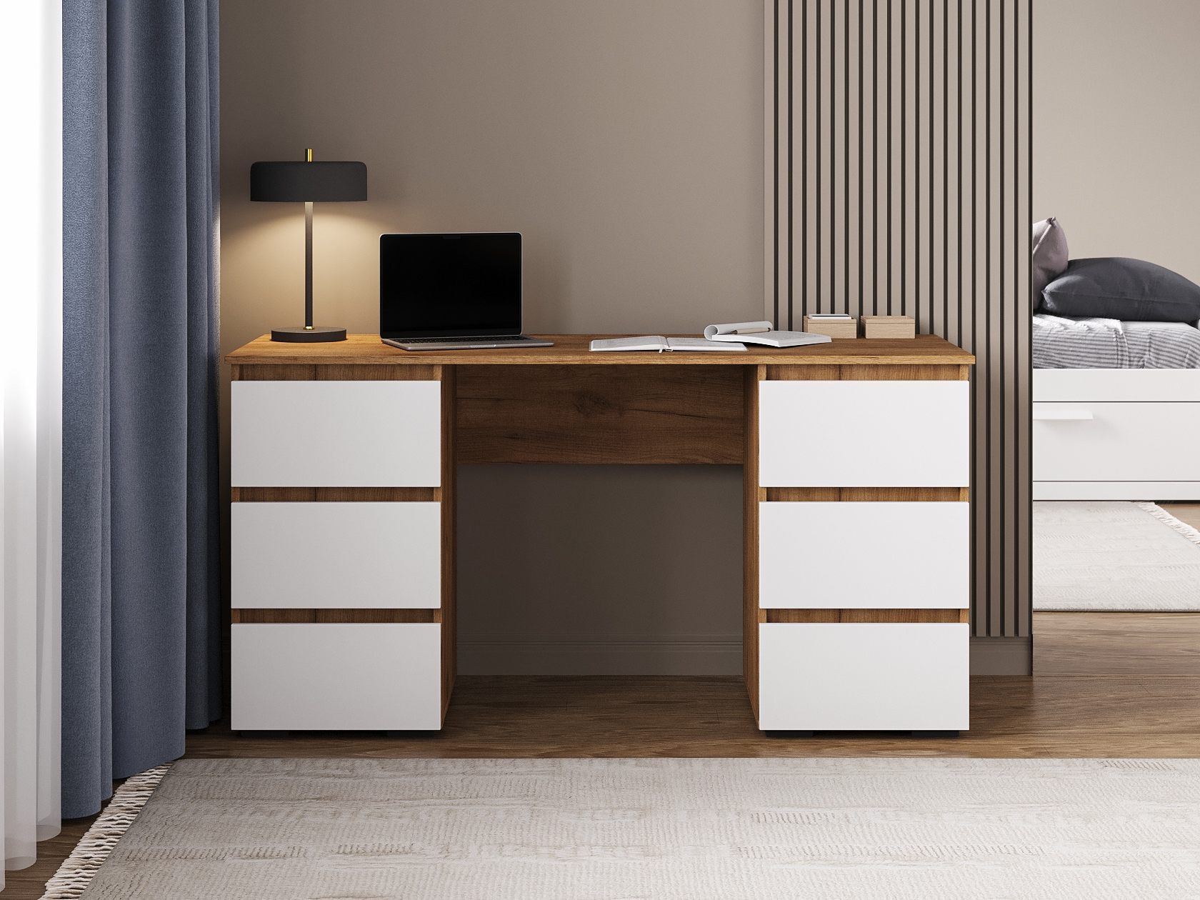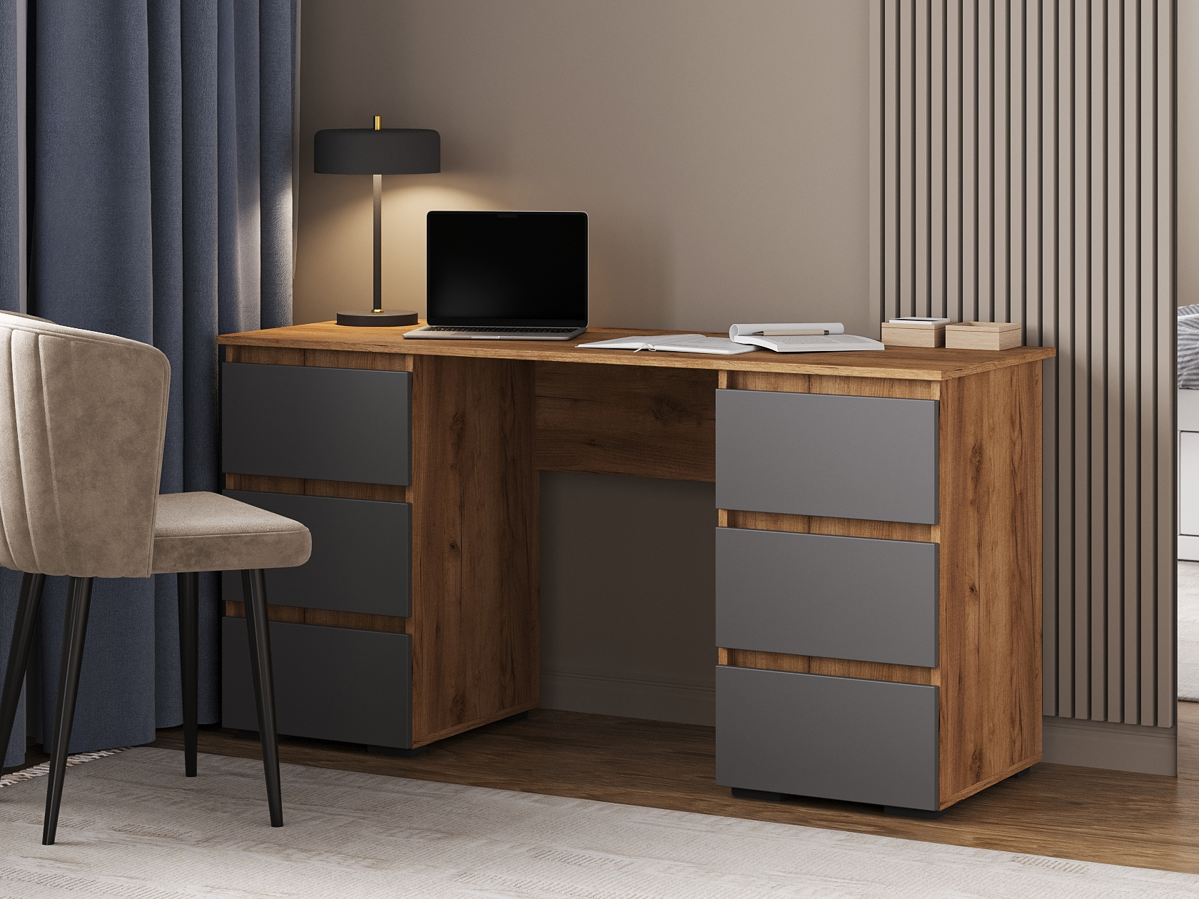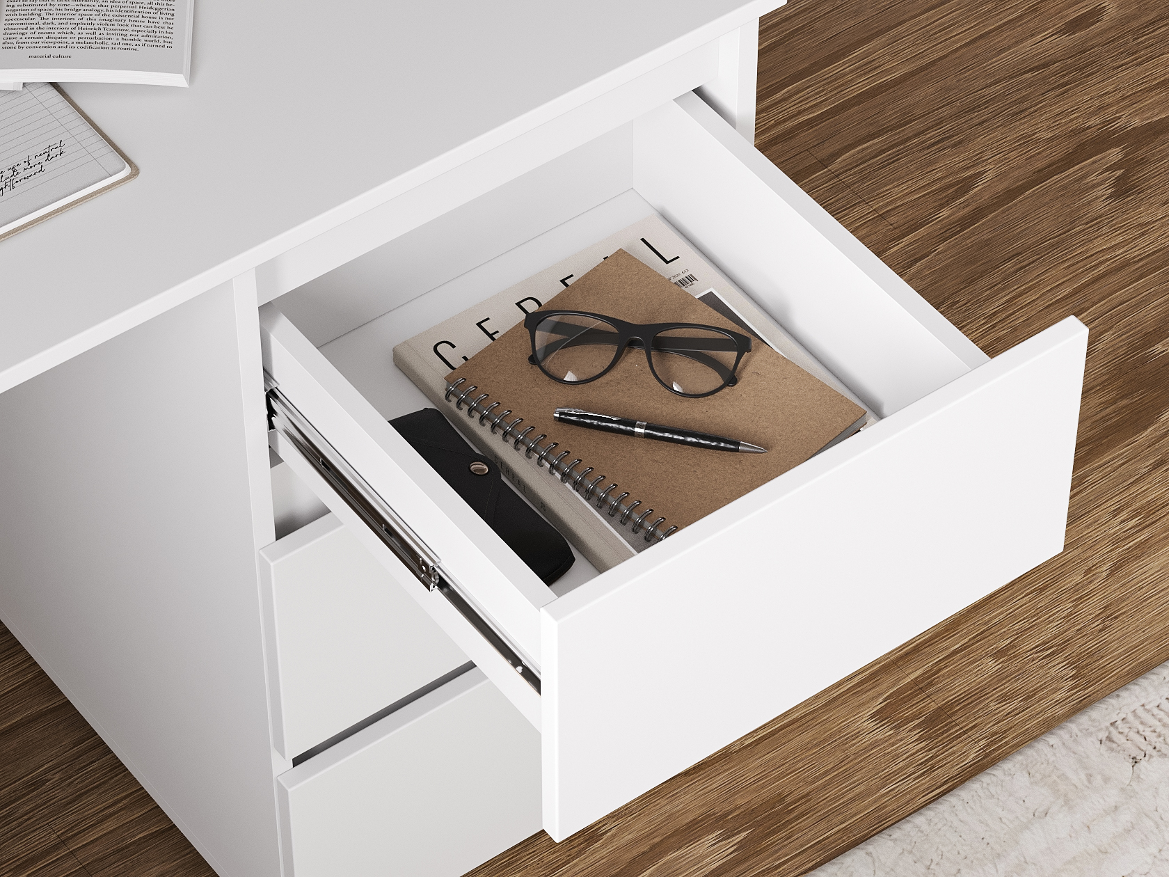 Компьютерный стол Элли сочетает функциональность и лаконичный дизайн без лишних деталей. Под просторной столешницей расположены выдвижные ящики, где удобно хранить канцелярские принадлежности и другие необходимые вещи, что позволяет поддерживать порядок на основной поверхности и обеспечивает быстрый доступ к содержимому.