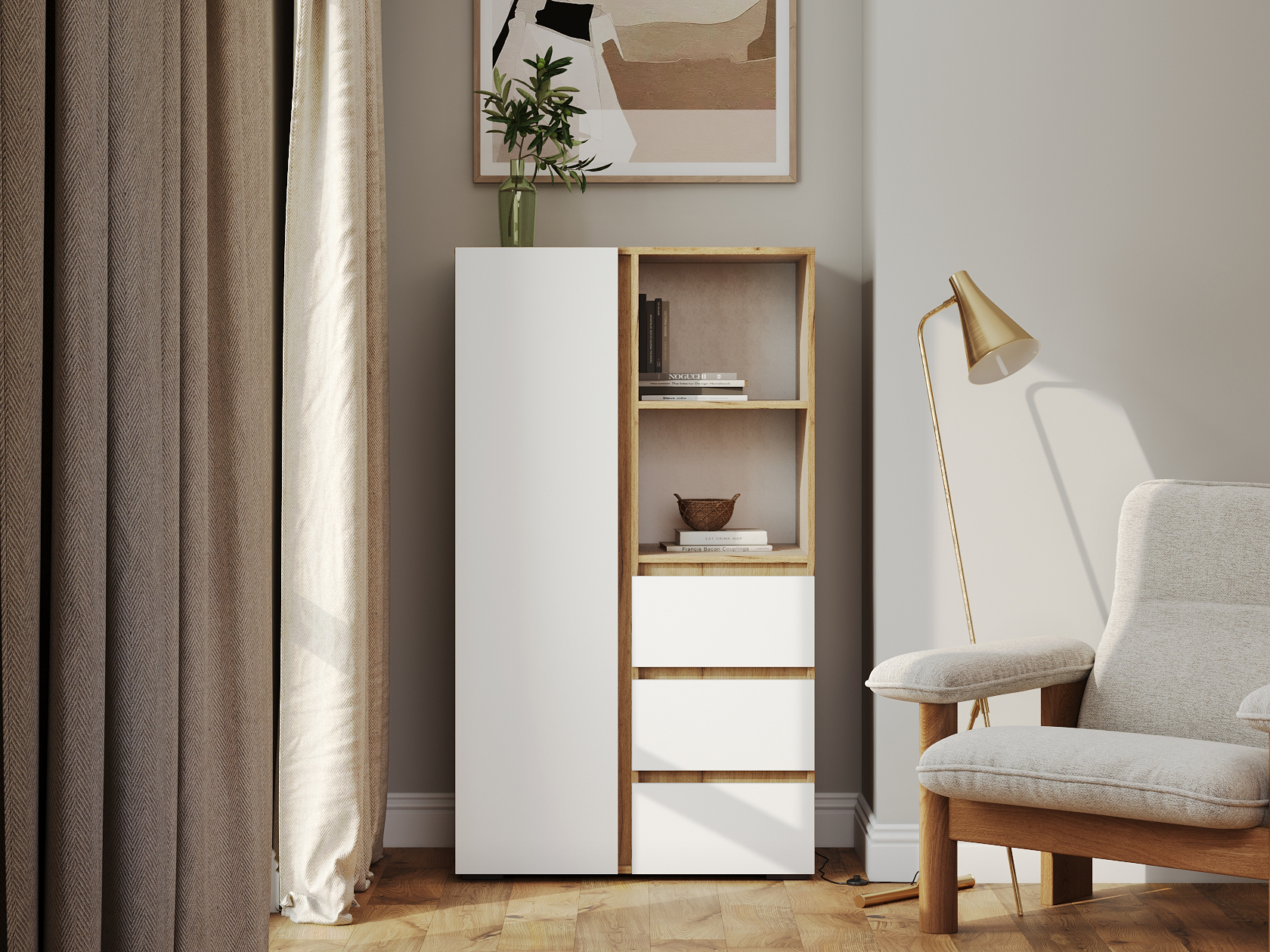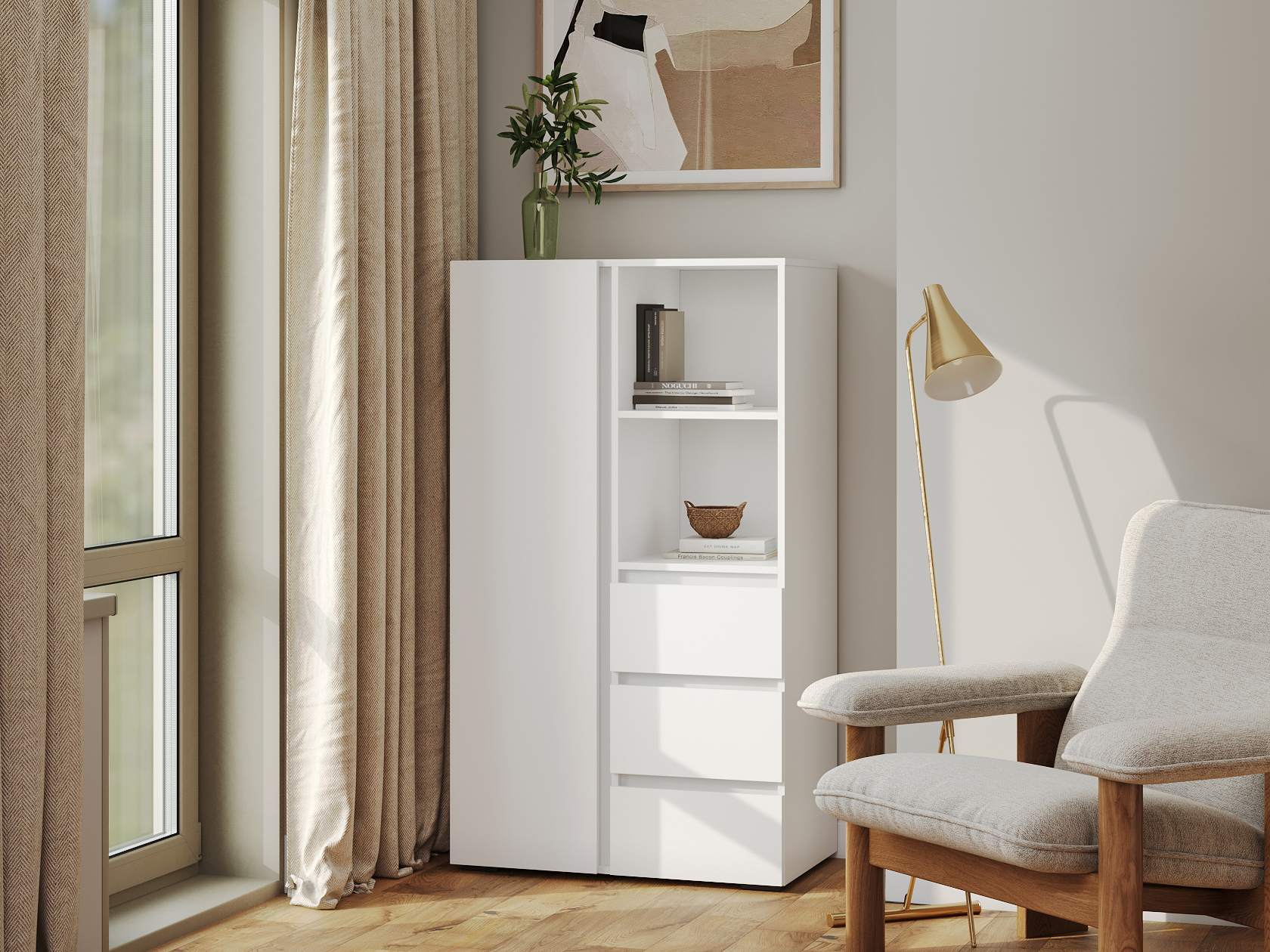 Стеллаж Хелен с дверцей и ящиками организует комфортное хранение различных вещей. Универсальная модель украсит пространство гостиной, прихожей или спальни. Открытые ниши подходят для размещения статуэток, фоторамок и другого декора, который придает интерьеру индивидуальность.