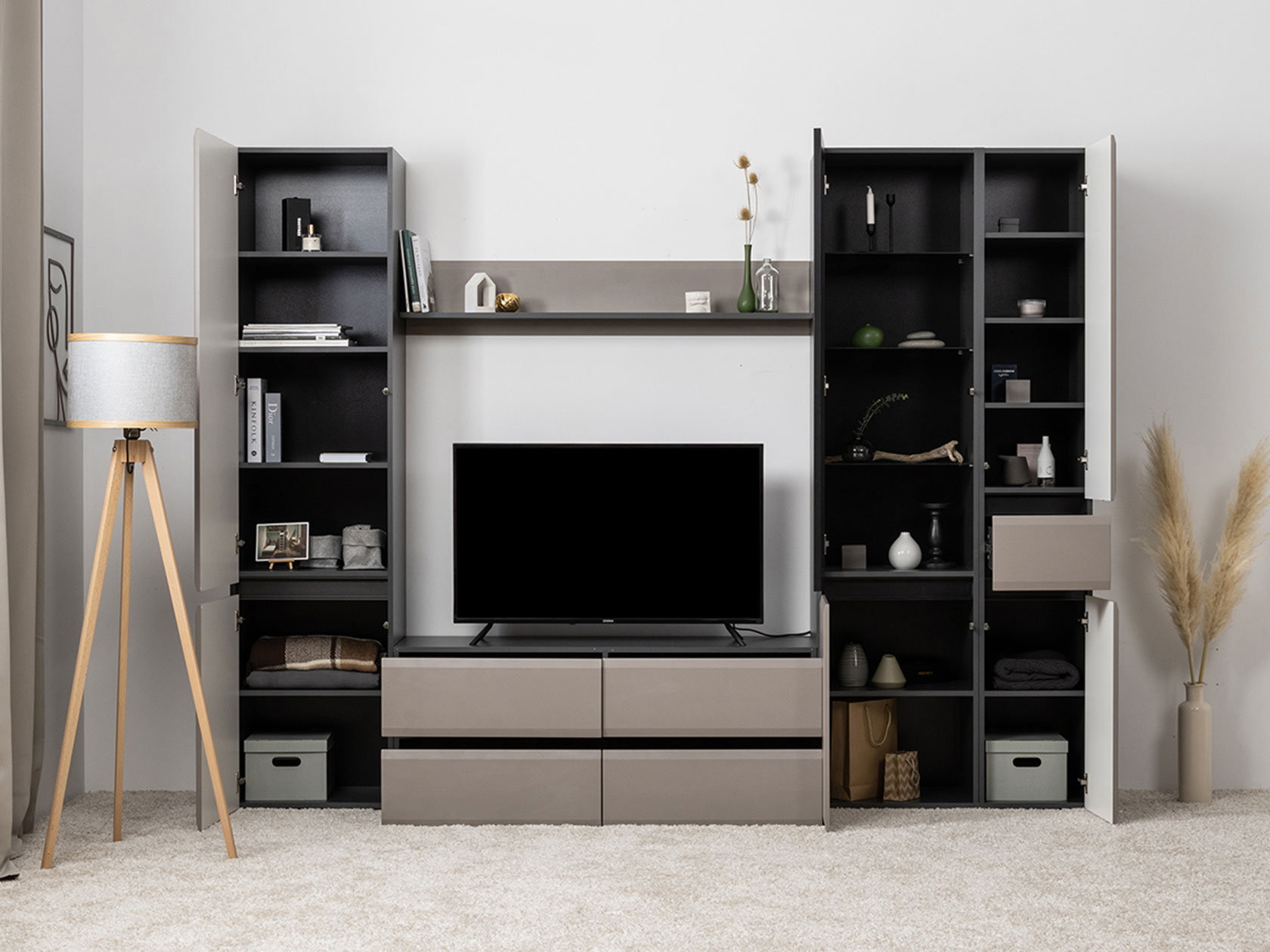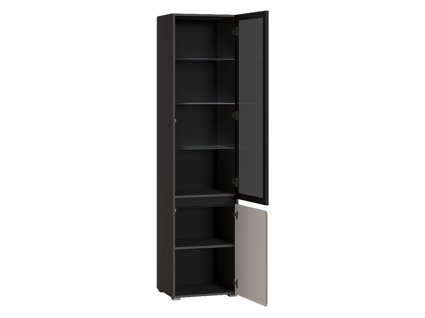 Шкаф-витрина Сидней сочетает в своем визуальном оформлении лаконичный глянцевый фасад и стекло с серой тонировкой. Распашные дверцы открываются легким нажатием. Петли с доводчиками обеспечивают плавное закрывание, исключая удары и хлопки.