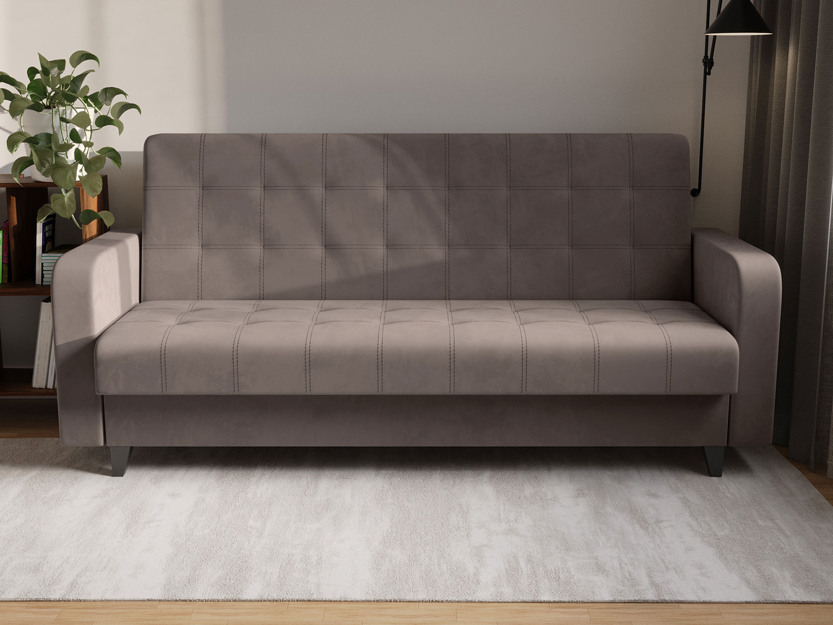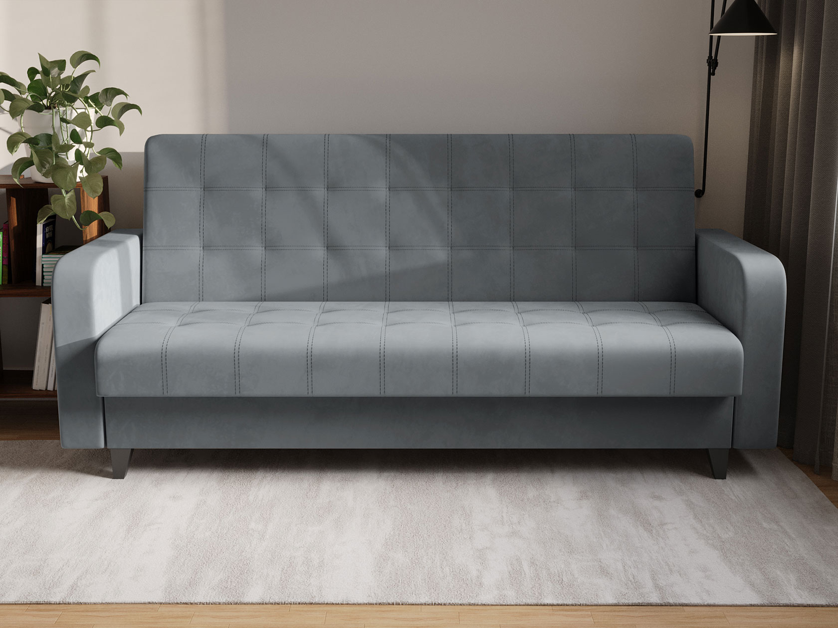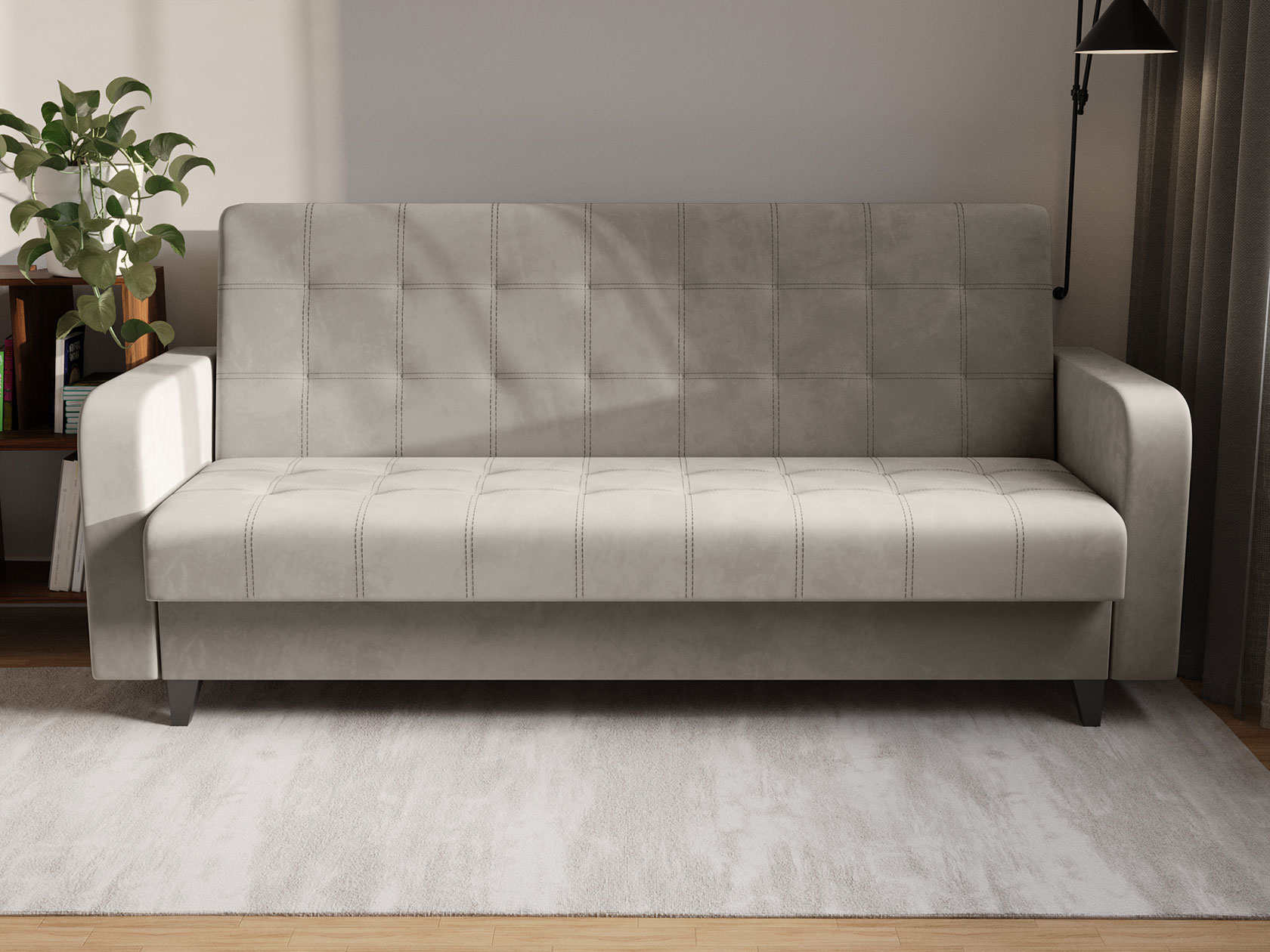 Прямой диван Грант подходит для любого интерьера. Декоративная строчка подчеркивает простой силуэт модели, а удобные подлокотники создают дополнительный комфорт. Диван легко раскладывается, образуя полноценное место для сна. В процессе трансформации не портится напольное покрытие, что важно для повседневного использования. Бельевой ящик с двумя секциями — практичное дополнение модели.
