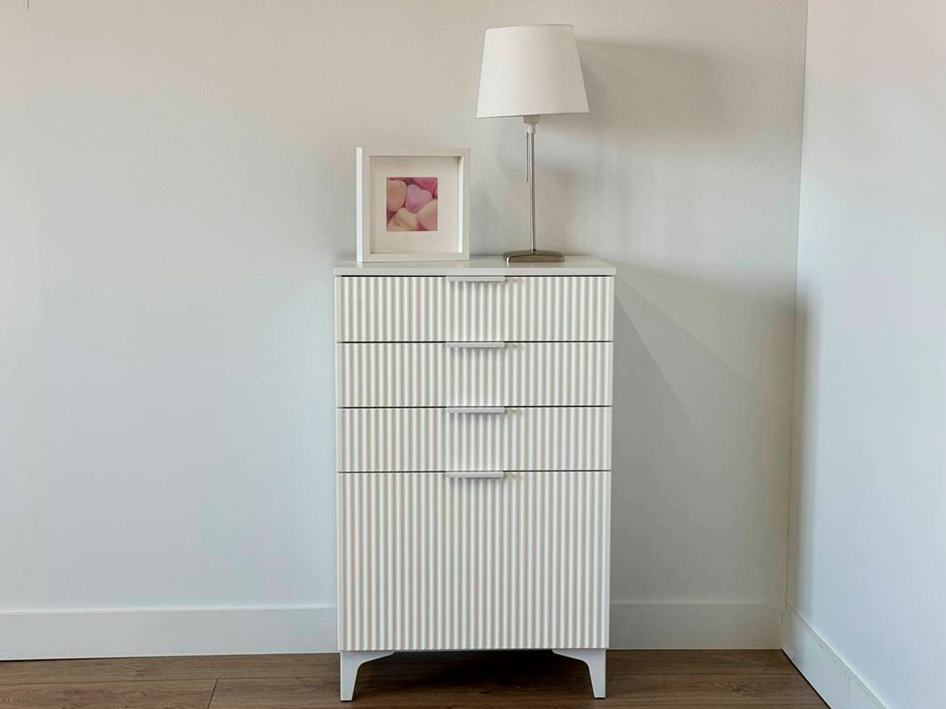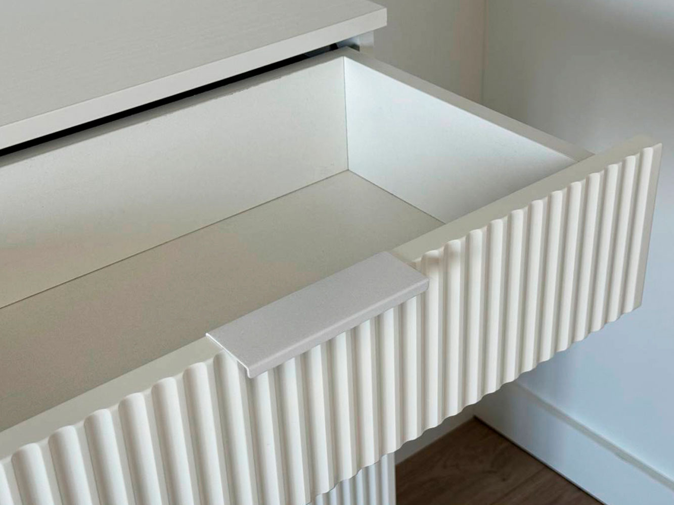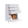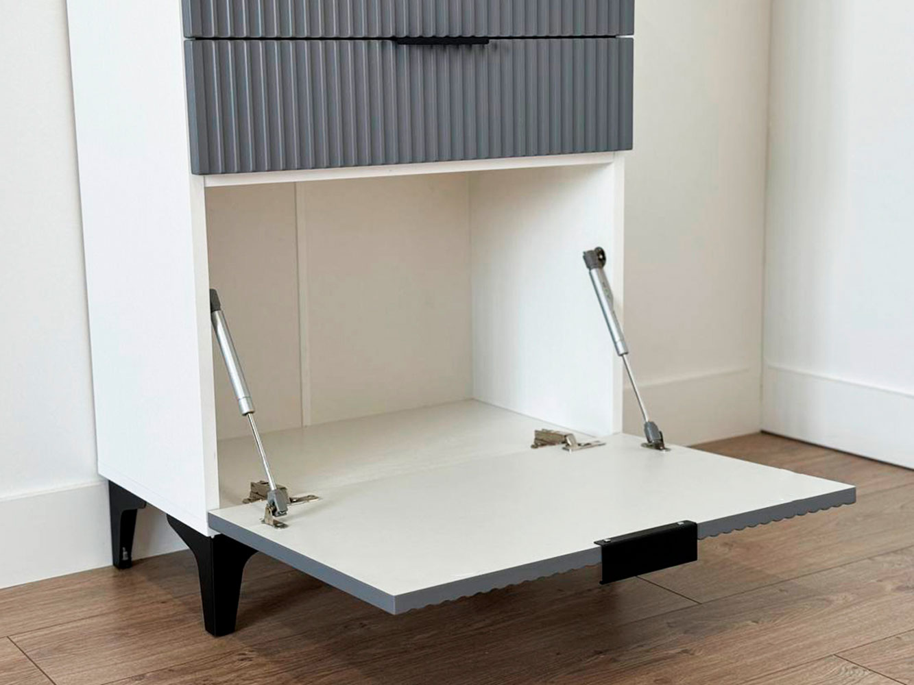 Комод Зефир украсит обстановку любой комнаты и обеспечит удобное хранение различных вещей. Выдвижные ящики и откидные дверцы позволяют оптимально распределить всё необходимое. Фрезеровка на фасадах и ножки в цвет фурнитуры делают модель стильным акцентом современного интерьера.