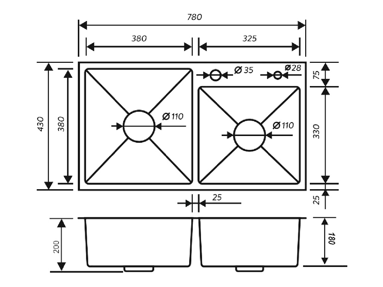Толщина стали мойки: 0,1-0,3 см.