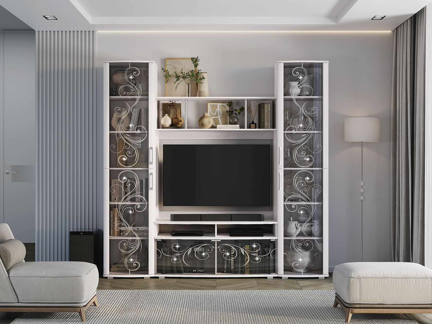 Гостиная Флоренция идеально подойдет для небольшой комнаты. Стеклянные фасады украшены витиеватым рисунком в пескоструйной обработке и стразами Swarowski. За прозрачными фасадами можно хранить не только сувениры, но и обычные вещи, необходимые в быту. Крупный рисунок и стекло частично скрывают содержимое, благодаря чему внешний вид не перегружен мелкими элементами, а мебель выглядит торжественно и компактно.