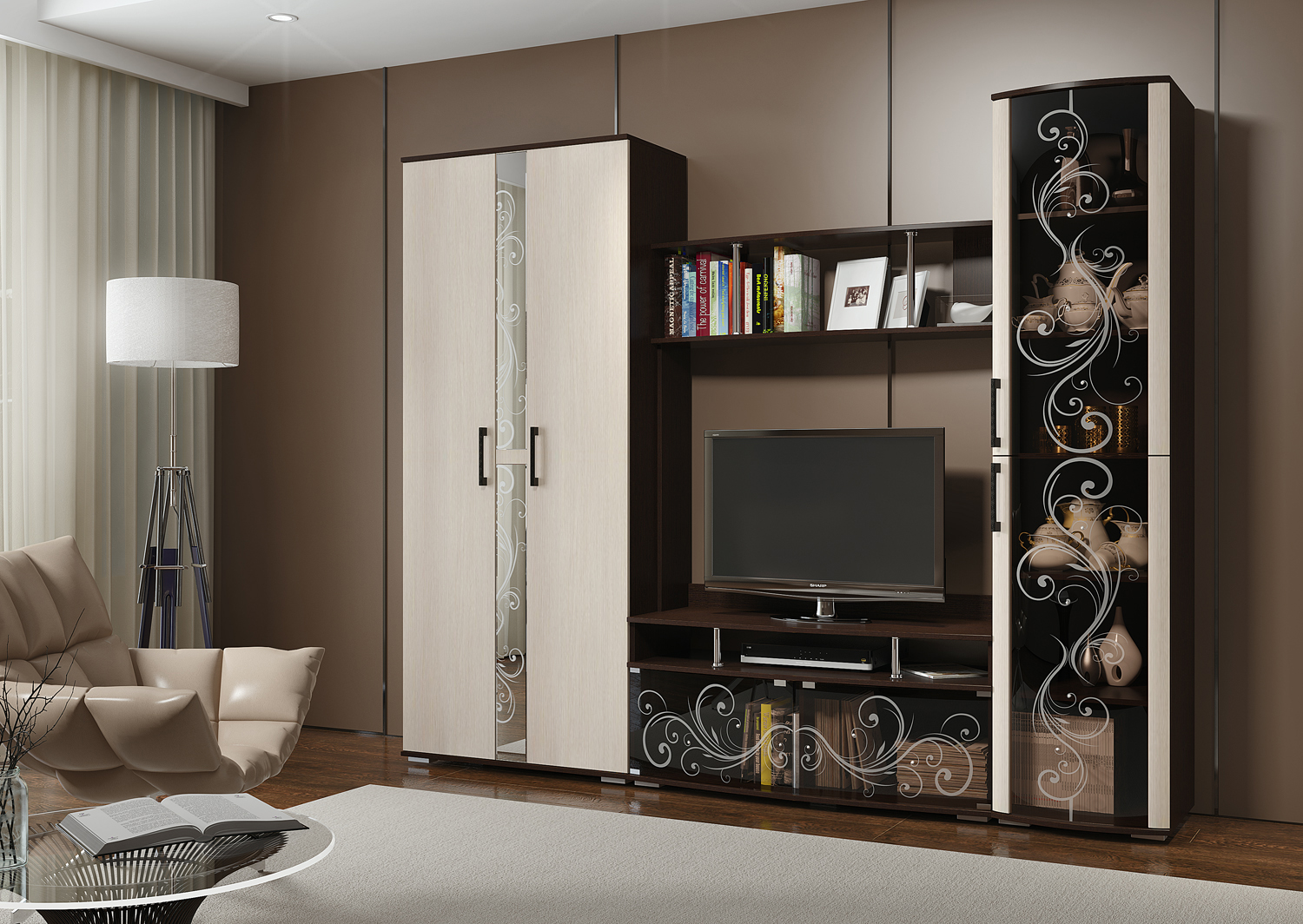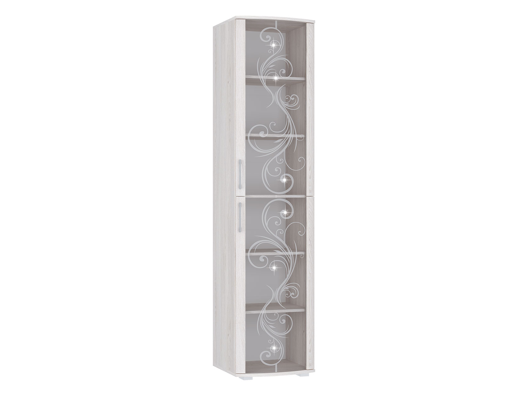 Яркая и необычная гостиная Флоренция шкаф и витрина с декоративными стеклянными фасадами и вставками. Дверцы украшены витиеватым рисунком с пескоструйной обработкой и стразами Swarovski на ручках. Крупный рисунок частично скрывает содержимое, благодаря чему можно хранить не только красивые сувениры и посуду, но и обычные вещи, необходимые в повседневной жизни. Длинные ручки удобны в использовании, при этом не отвлекают внимания от основного декора. Вместительная и функциональная гостиная будет особенно полезна в небольшой квартире.