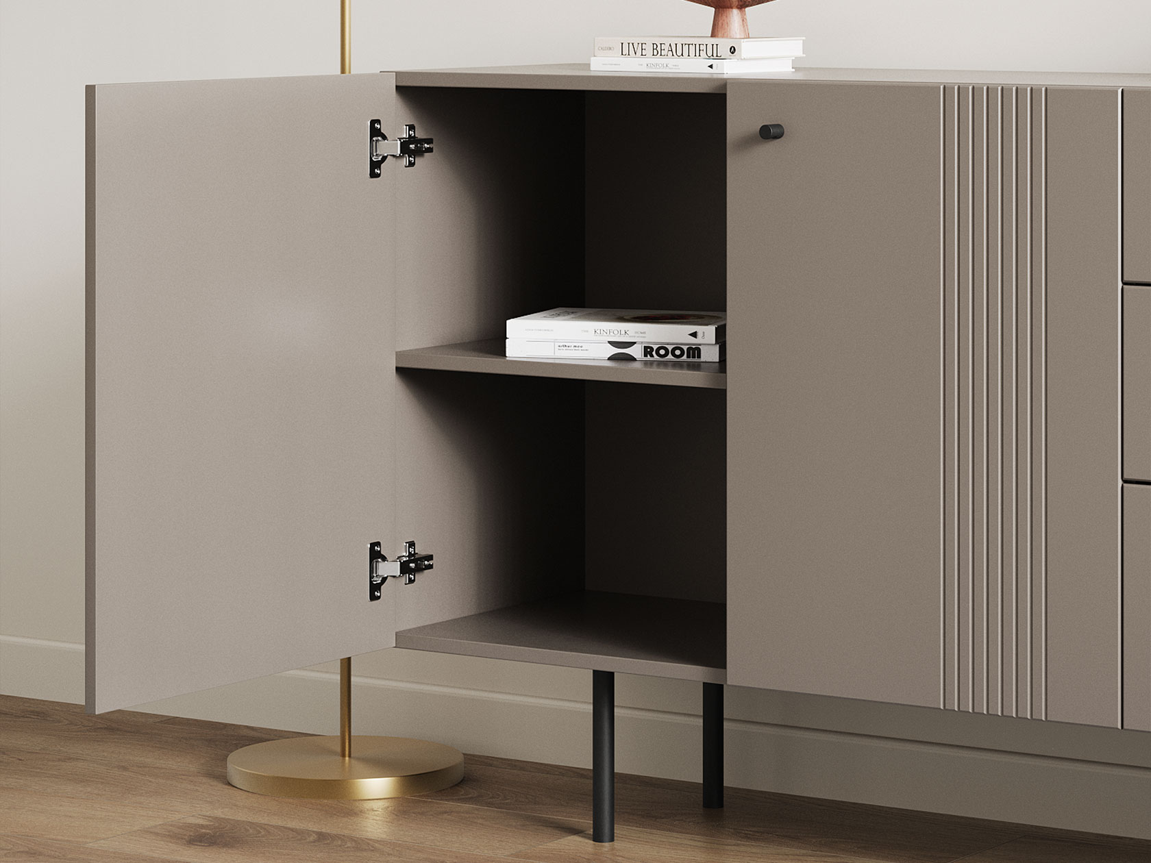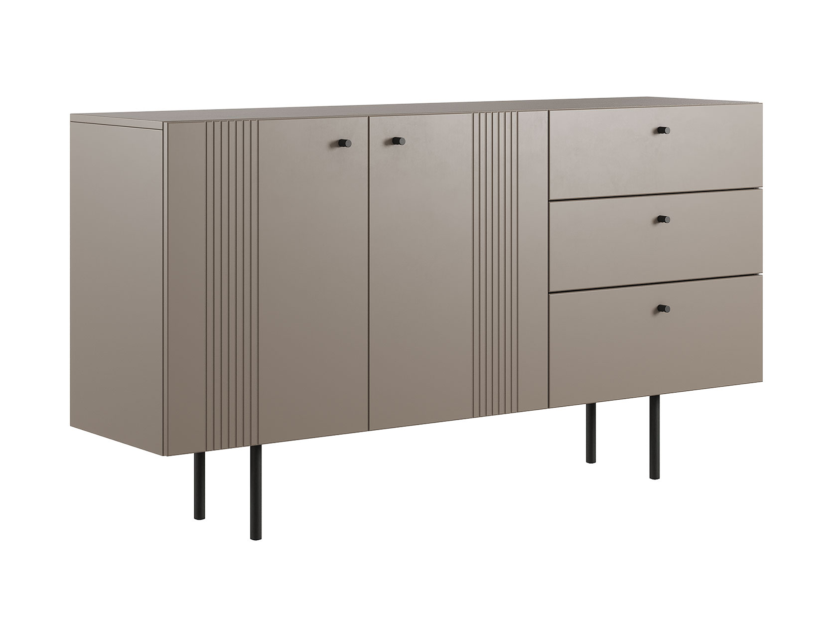 Комод Каприс с дверцами и ящиками — практичная модель для размещения всех необходимых вещей. В выдвижных ящиках удобно хранить одежду, белье и аксессуары. Распашное отделение подходит для более крупных предметов. Фасады украшены изящной фрезеровкой, а лаконичная фурнитура не отвлекает от самой мебели.