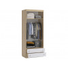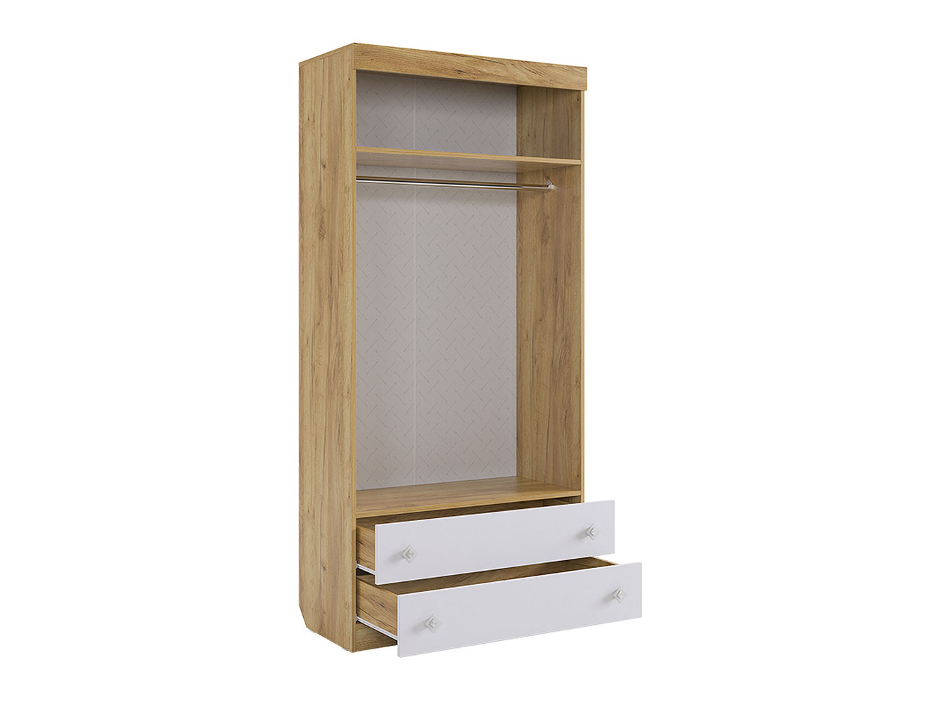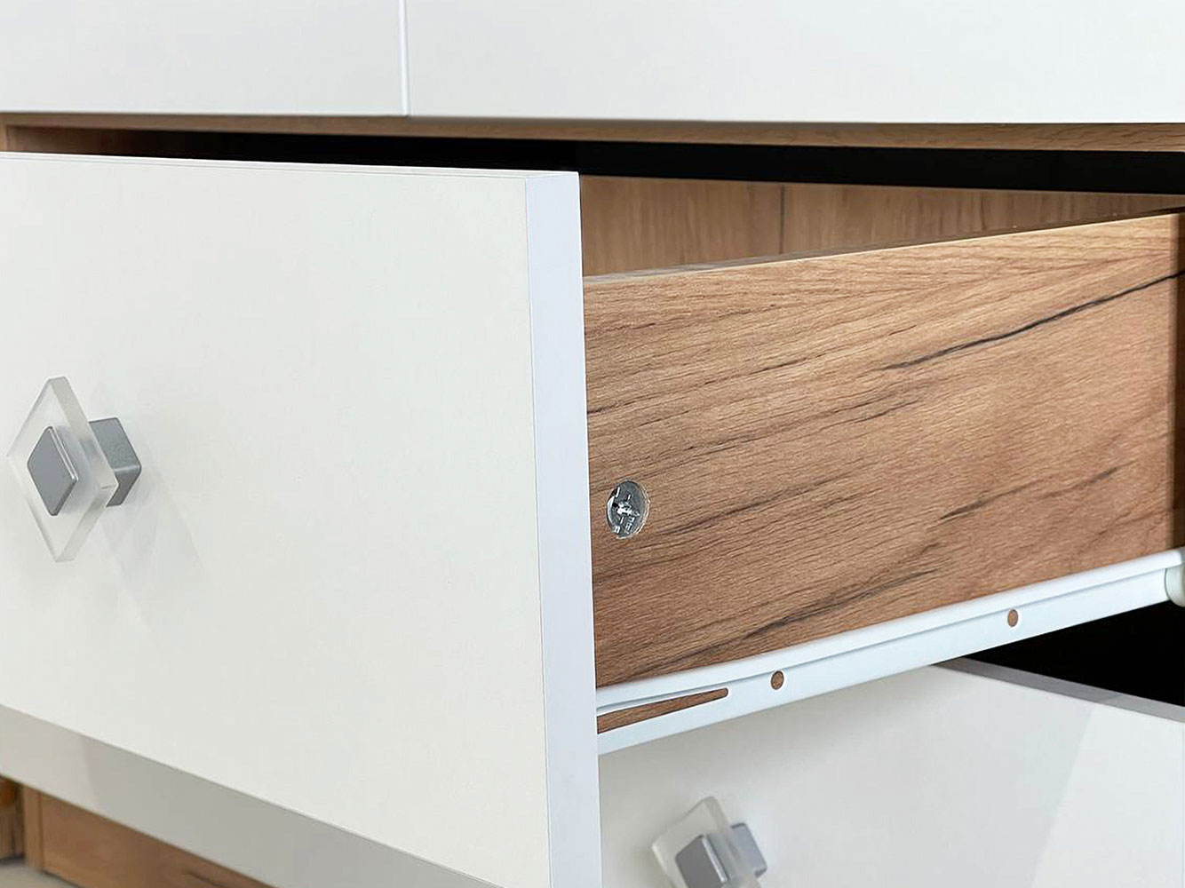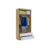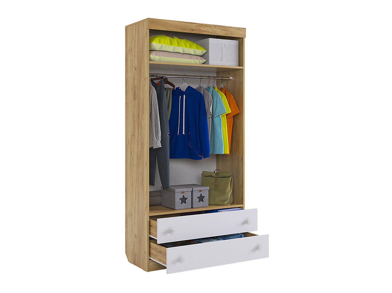 Детский шкаф Форсаж организует хранение как сложенных вещей, так и предметов гардероба на вешалках. Продольная штанга обеспечит место для школьной формы, рубашек и брюк, а полка и выдвижные секции подойдут для футболок, джинсов и аксессуаров. Благодаря шариковым направляющим ящики бесшумно выдвигаются на полную глубину.