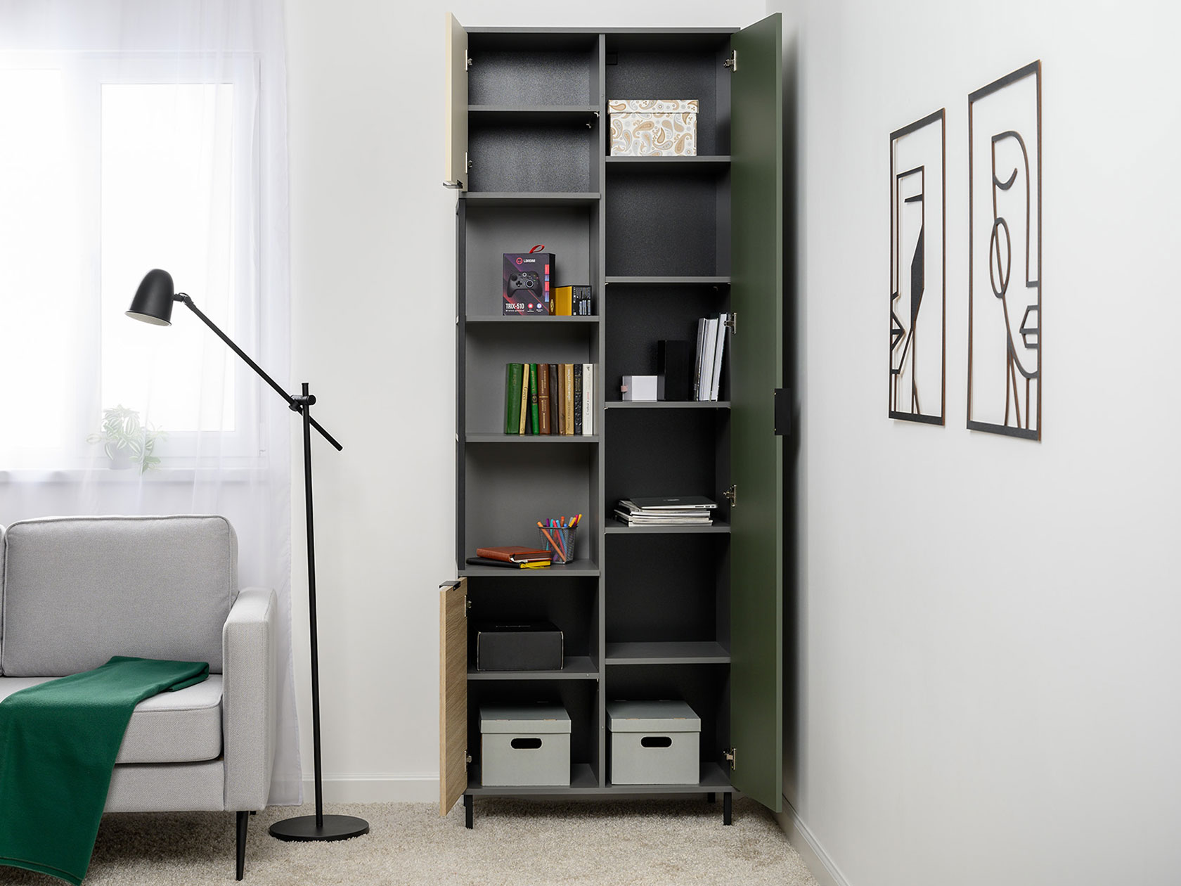 Детский шкаф Марвэл комбинированный решит вопросы хранения одежды и других важных вещей. Сочетание открытого стеллажа и закрытой секции с полками обеспечит место для книг, учебников, папок с документами и предметов гардероба. Фасады разных оттенков создают яркий, живой интерьер, а минималистичная фурнитура не отвлекает от самой мебели.