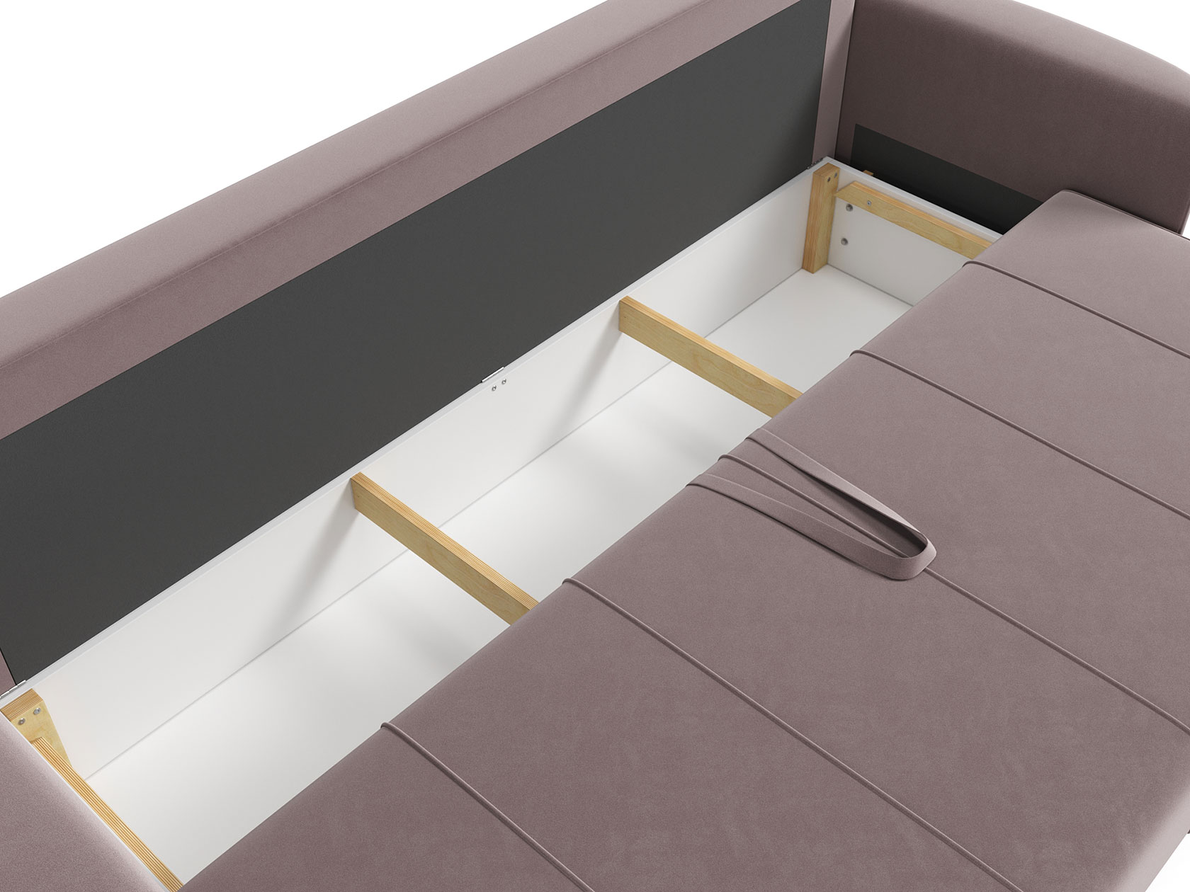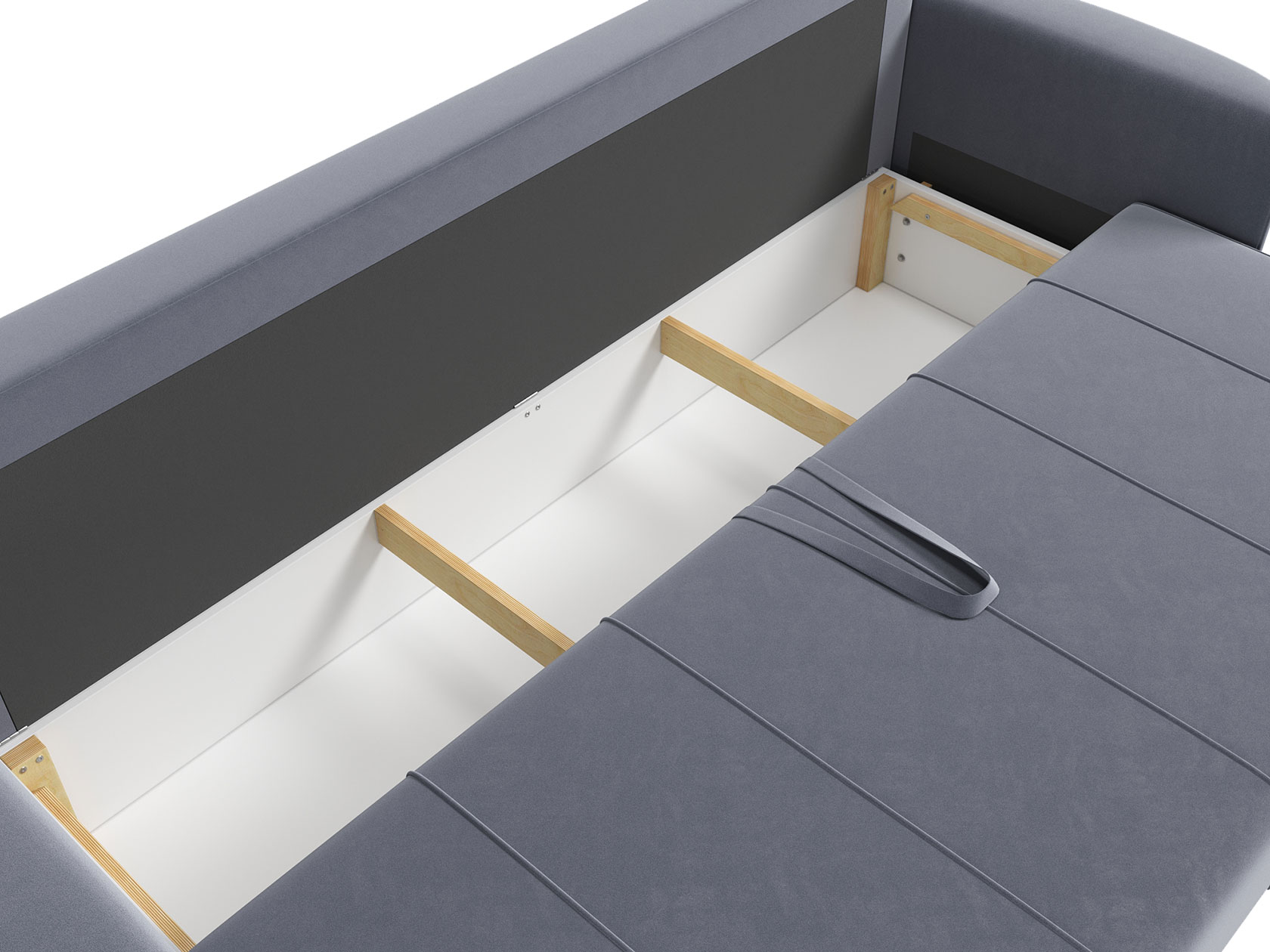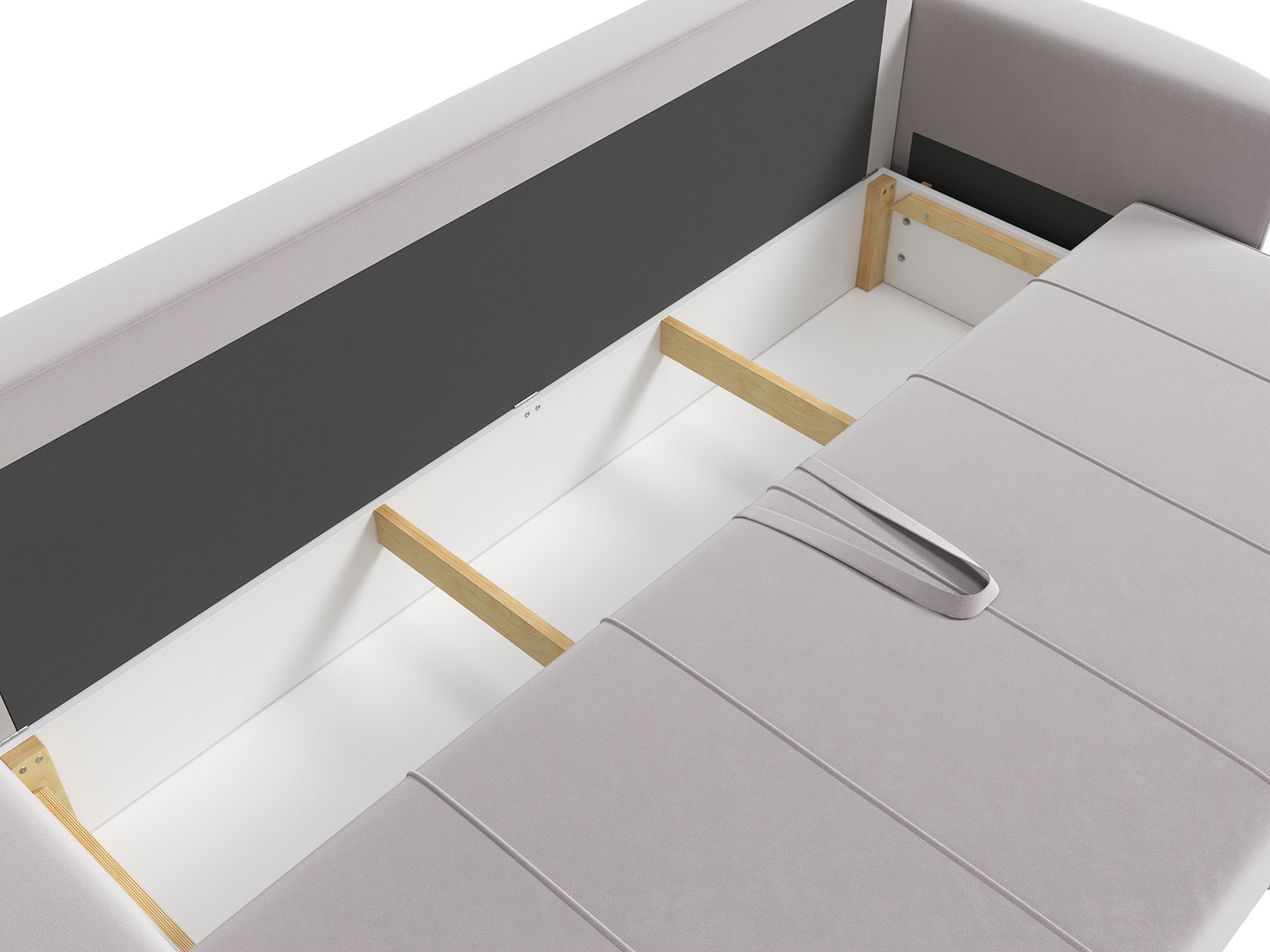 Модель легко превращается в кровать с ровной и просторной спальной зоной. Конструкция проста в эксплуатации и отлично подходит для ежедневного использования. Для постельных принадлежностей или сезонных вещей предусмотрен бельевой короб.