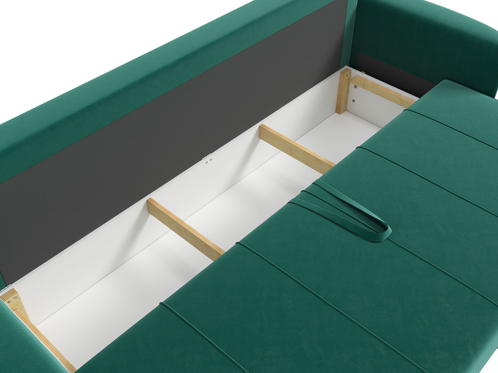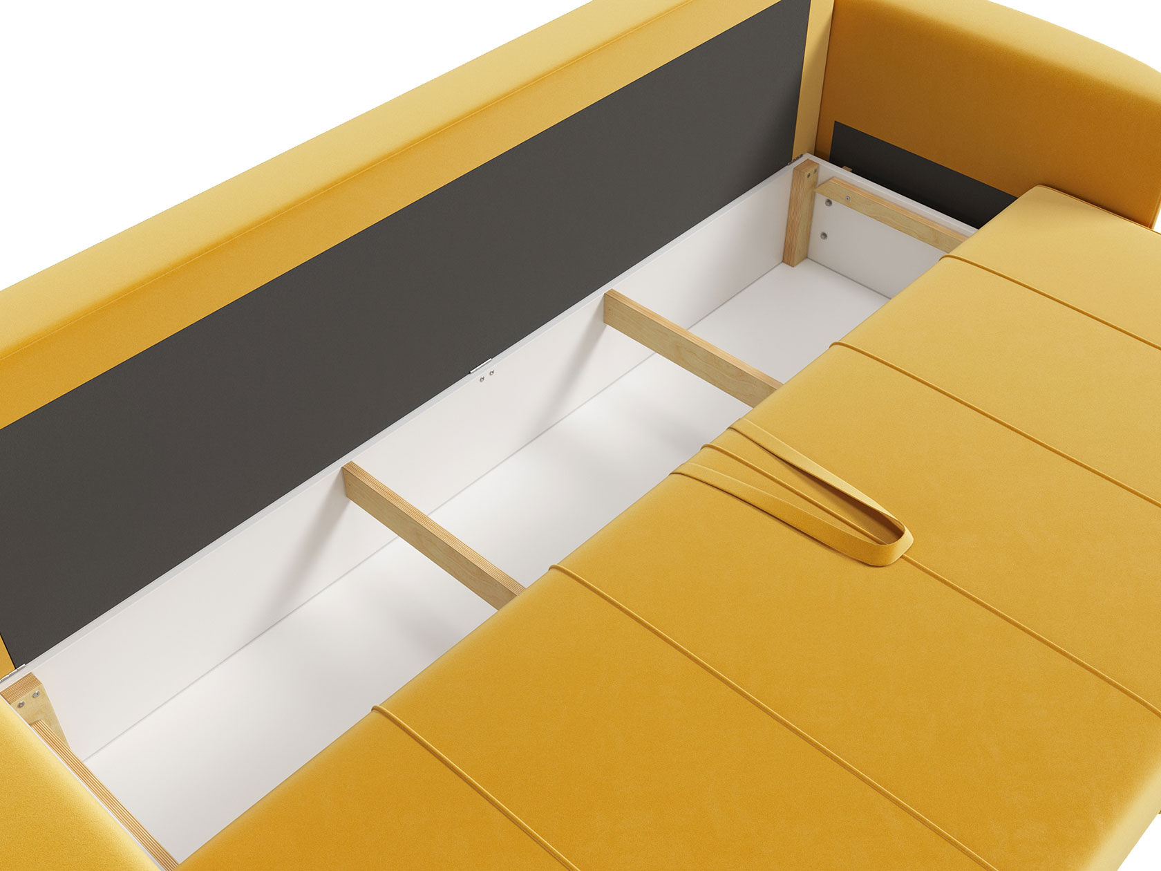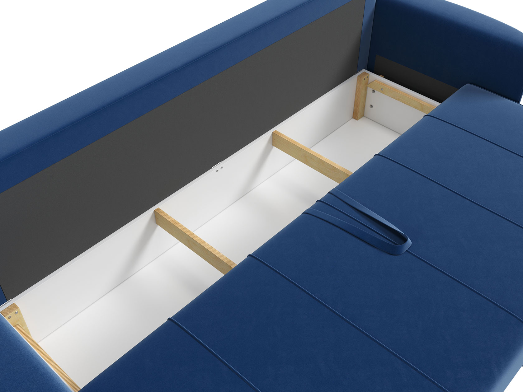 Модель легко превращается в кровать с ровной и просторной спальной зоной. Конструкция проста в эксплуатации и отлично подходит для ежедневного использования. Для постельных принадлежностей или сезонных вещей предусмотрен бельевой короб.