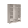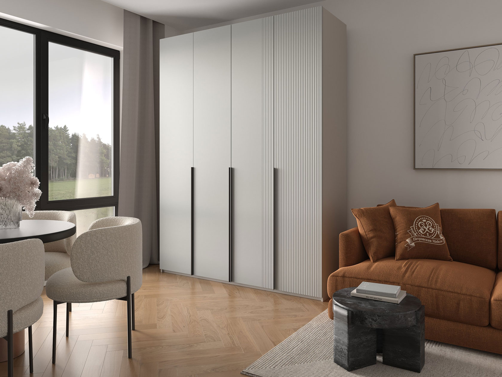 Внутреннее наполнение распашного шкафа Шарлотта 4 двери представлено полками, выдвижными ящиками и просторным отделением со штангой, что позволяет разместить на вешалках одежду любой длины, а также хранить другие предметы гардероба в сложенном виде. В дизайне сделан уклон на простую геометрию, которую подчеркивают тонкие контрастные ручки. Вертикальная фрезеровка на одном из фасадов служит лаконичным акцентом оформления.